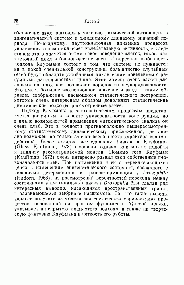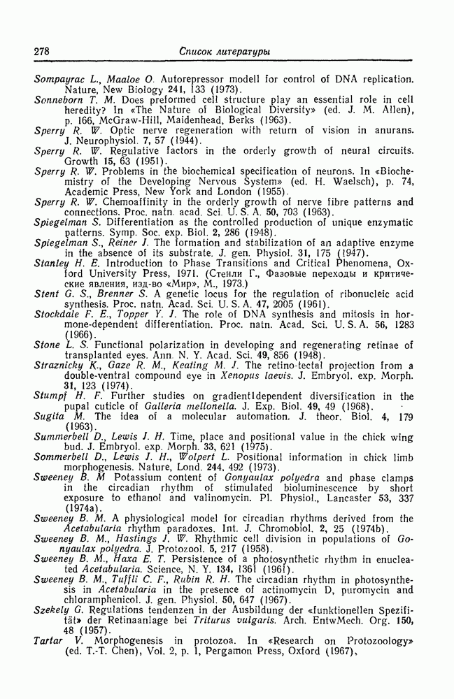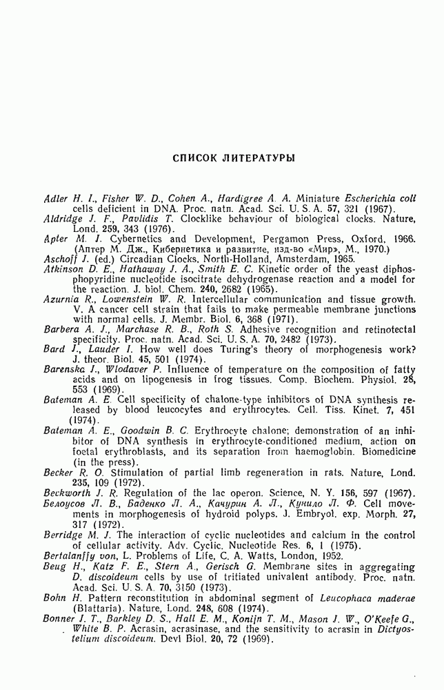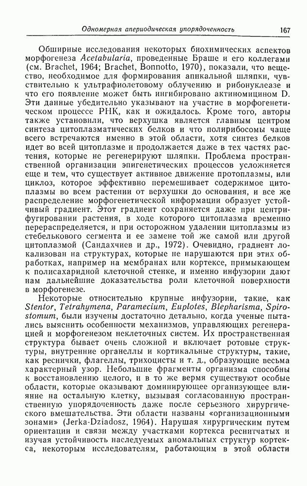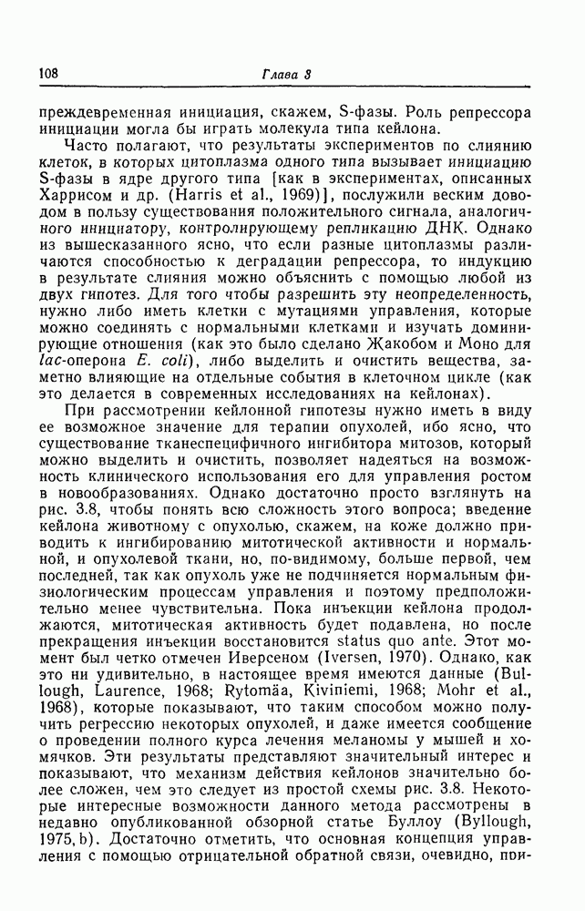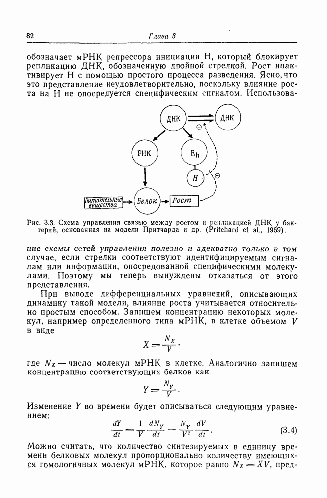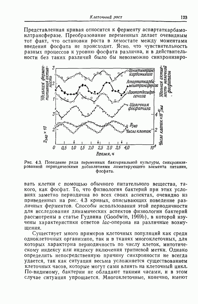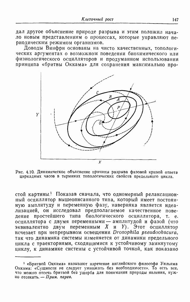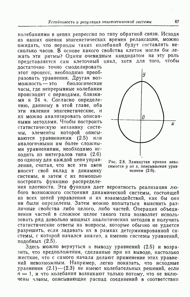 Рис. 3.7. Клеточный цикл эукариотов с ответвлением, ведущим к клеточной дифференцировке У схемы, представленной на рис. 3.7, имеется одна особенность, которая вводит в заблуждение и должна рассматриваться как недостаток: может показаться, что процесс клеточной дифференцировки и клеточный цикл работают по принципу «все или ничего», хотя на самом деле это не так. В течение эмбриогенеза, по мере того как происходят органогенез и клеточная дифференцировка, темп клеточных делений постепенно падает, но промежуточные состояния определенно существуют: частично дифференцированные клетки (миобласты, эритробласты, нейробласты и т. д.) продолжают делиться. Кроме того, четко различимы между собой линии стволовых клеток различных тканей органов у взрослых (тех органов, которые сохраняются в стационарном состоянии путем непрерывного возобновления клеток и дифференцировки, как, например кожа, печень, почка и т. д.), хотя их роль состоит в том, чтобы делиться со скоростью, определяемой некоторыми критериями, характеризующими потребности ткани или органа (используя язык теории управления). Хотя в таких системах клетки, которые в ответ на стимул к дифференцировке покидают стволовую популяцию, изменяют свое состояние, как правило, внезапно, нельзя считать, что этот процесс протекает строго по принципу «все или ничего». Чтобы передать гибкость связи между клеточным циклом и клеточной дифференцировкой, нужна гораздо более динамическая картина, чем та, которая дана на рис. 3.7. Теперь мне хотелось бы остановиться на некоторых исследованиях, дающих динамическую картину тканевой организации и в то же время допускающих построение и исследование модели тканевого гомеостаза с отрицательной обратной связью. Аналогично тому, как проблема управления репликацией ДНК привела нас к вопросу о том, каким образом клетки измеряют свои размеры, проблема управления клеточной дифференцировкой в ткани заставляет исследовать задачу поддержания ее пространственной организации. Это подводит нас к другому уровню биологической иерархии, характерному для многоклеточных. Динамически мы все еще работаем в пределах эпигенетической системы, хотя время теперь измеряется днями. Это происходит потому, что период клеточного цикла высших организмов обычно лежит в диапазоне 10-100 ч.