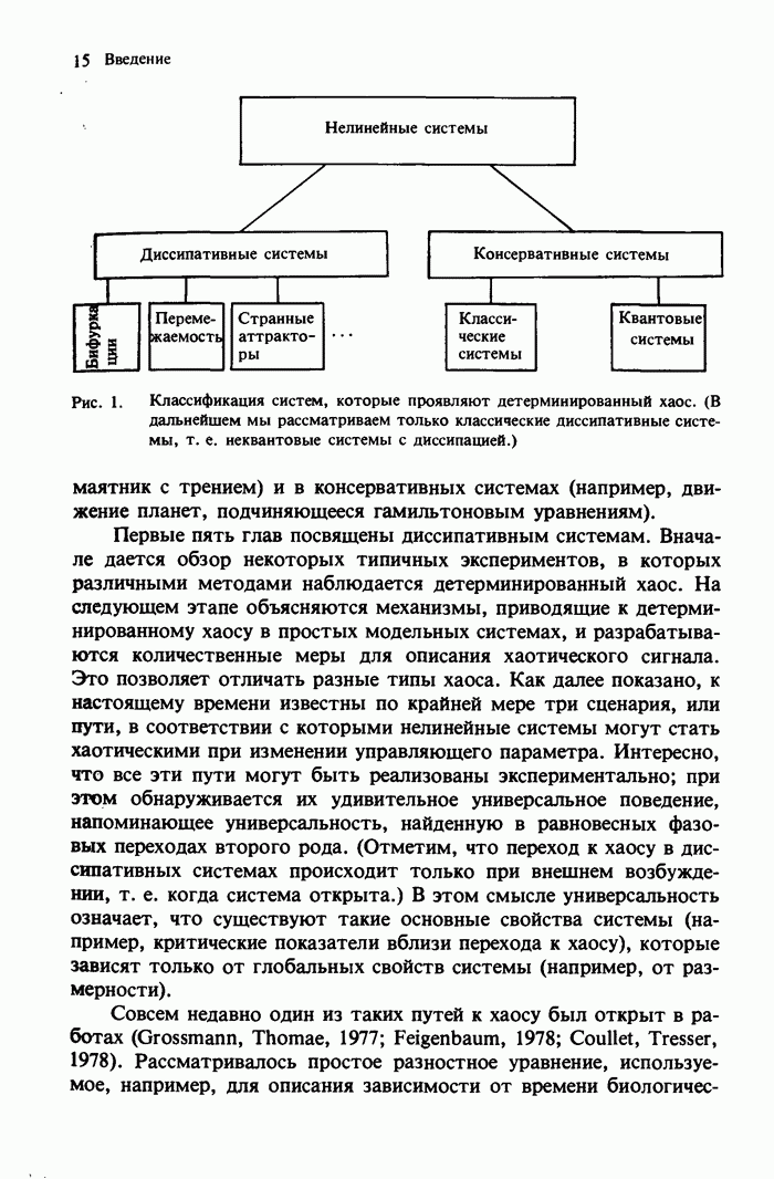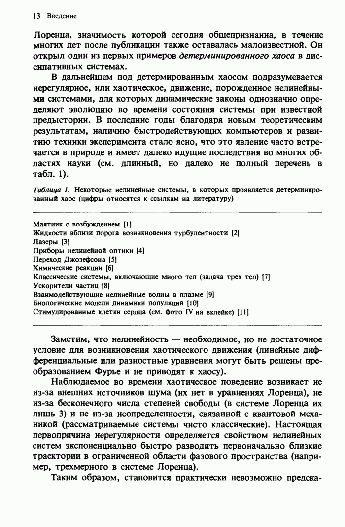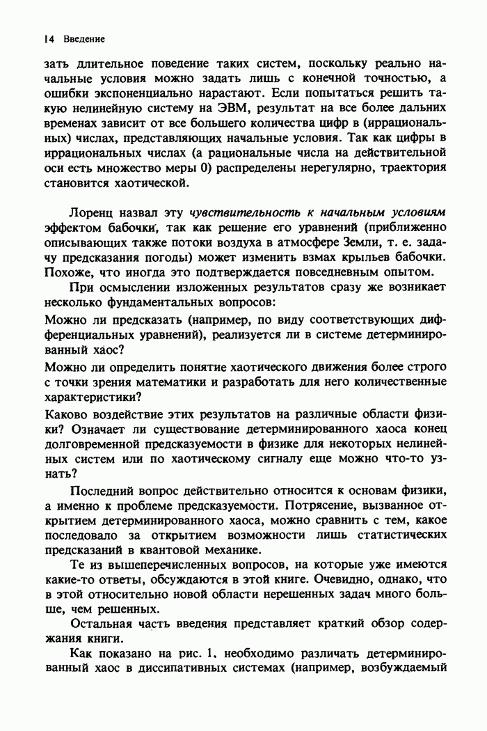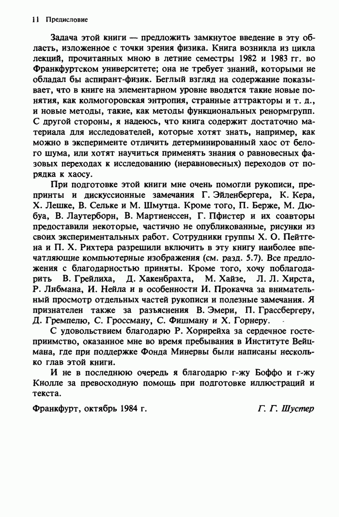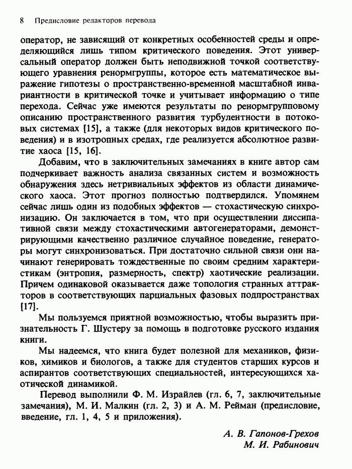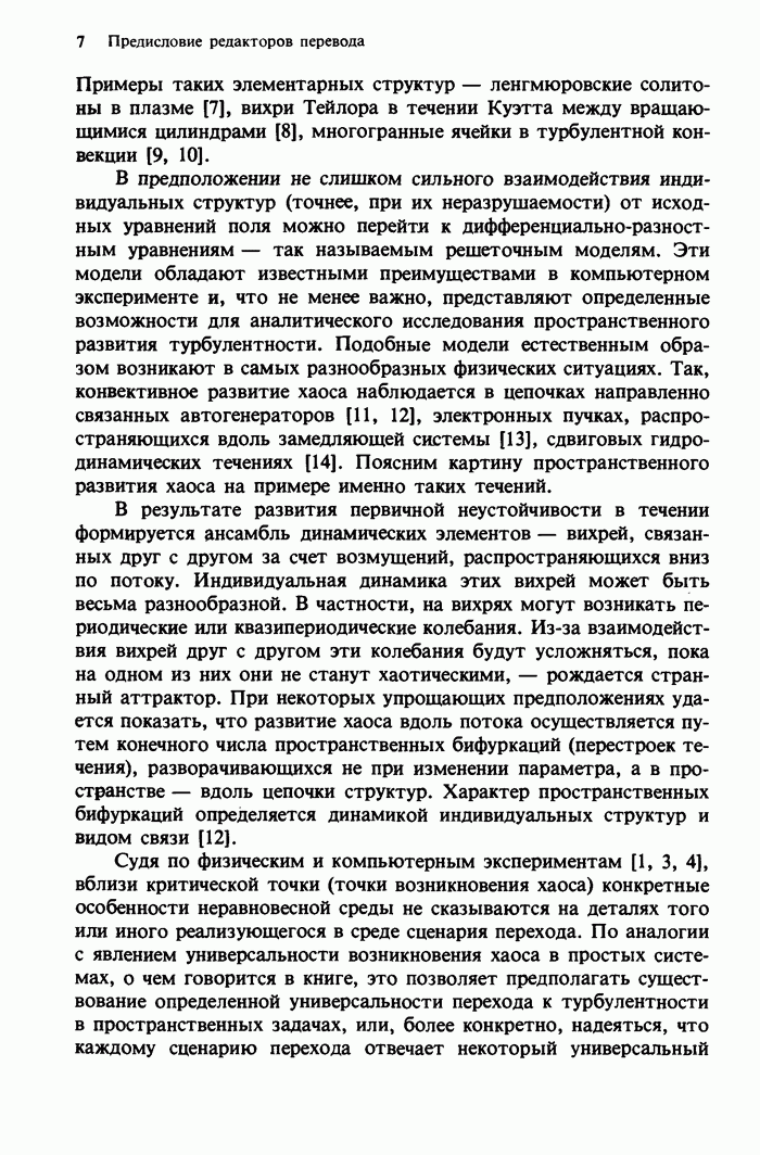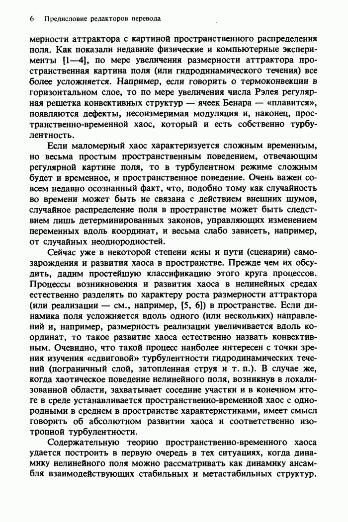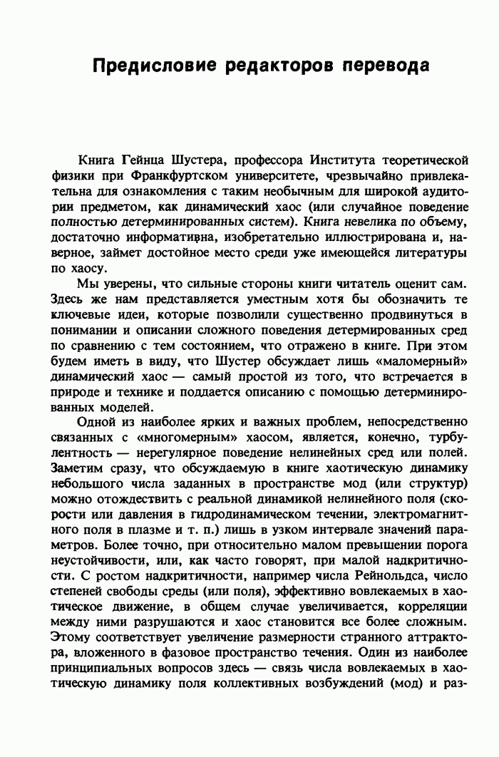 Предисловие редакторов переводаКнига Гейнца Шустера, профессора Института теоретической физики при Франкфуртском университете, чрезвычайно привлекательна для ознакомления с таким необычным для широкой аудитории предметом, как динамический хаос (или случайное поведение полностью детерминированных систем). Книга невелика по объему, достаточно информативна, изобретательно иллюстрирована и, наверное, займет достойное место среди уже имеющейся литературы по хаосу. Мы уверены, что сильные стороны книги читатель оценит сам. Здесь же нам представляется уместным хотя бы обозначить те ключевые идеи, которые позволили существенно продвинуться в понимании и описании сложного поведения детермированных сред по сравнению с тем состоянием, что отражено в книге. При этом будем иметь в виду, что Шустер обсуждает лишь «маломерный» динамический хаос — самый простой из того, что встречается в природе и технике и поддается описанию с помощью детерминированных моделей. Одной из наиболее ярких и важных проблем, непосредственно связанных с «многомерным» хаосом, является, конечно, турбулентность — нерегулярное поведение нелинейных сред или полей. Заметим сразу, что обсуждаемую в книге хаотическую динамику небольшого числа заданных в пространстве мод (или структур) можно отождествить с реальной динамикой нелинейного поля (скорости или давления в гидродинамическом течении, электромагнитного поля в плазме и т. п.) лишь в узком интервале значений параметров. Более точно, при относительно малом превышении порога неустойчивости, или, как часто говорят, при малой надкритичности. С ростом надкритичности, например числа Рейнольдса, число степеней свободы среды (или поля), эффективно вовлекаемых в хаотическое движение, в общем случае увеличивается, корреляции между ними разрушаются и хаос становится все более сложным. Этому соответствует увеличение размерности странного аттрактора, вложенного в фазовое пространство течения. Один из наиболее принципиальных вопросов здесь — связь числа вовлекаемых в хаотическую динамику поля коллективных возбуждений (мод) и размерности аттрактора с картиной пространственного распределения поля. Как показали недавние физические и компьютерные эксперименты [1—4], по мере увеличения размерности аттрактора пространственная картина поля (или гидродинамического течения) все более усложняется. Например, если говорить о термоконвекции в горизонтальном слое, то по мере увеличения числа Рэлея регулярная решетка конвективных структур — ячеек Бенара — «плавится», появляются дефекты, несоизмеримая модуляция и, наконец, пространственно-временной хаос, который и есть собственно турбулентность. Если маломерный хаос характеризуется сложным временным, но весьма простым пространственным поведением, отвечающим регулярной картине поля, то в турбулентном режиме сложным будет и временное, и пространственное поведение. Очень важен совсем недавно осознанный факт, что, подобно тому как случайность во времени может быть не связана с действием внешних шумов, случайное распределение поля в пространстве может быть следствием лишь детерминированных законов, управляющих изменением переменных вдоль координат, и весьма слабо зависеть, например, от случайных неоднородностей. Сейчас уже в некоторой степени ясны и пути (сц