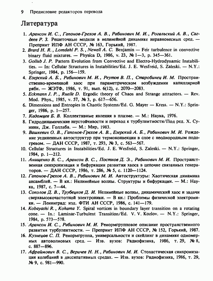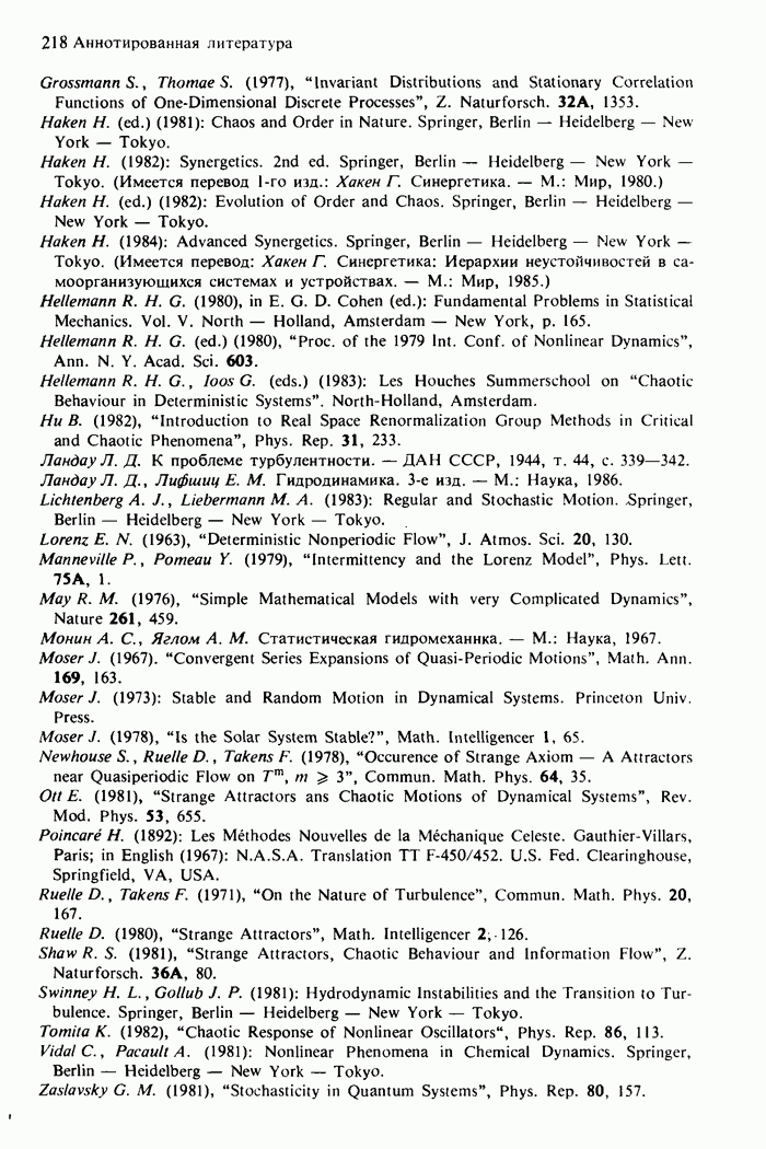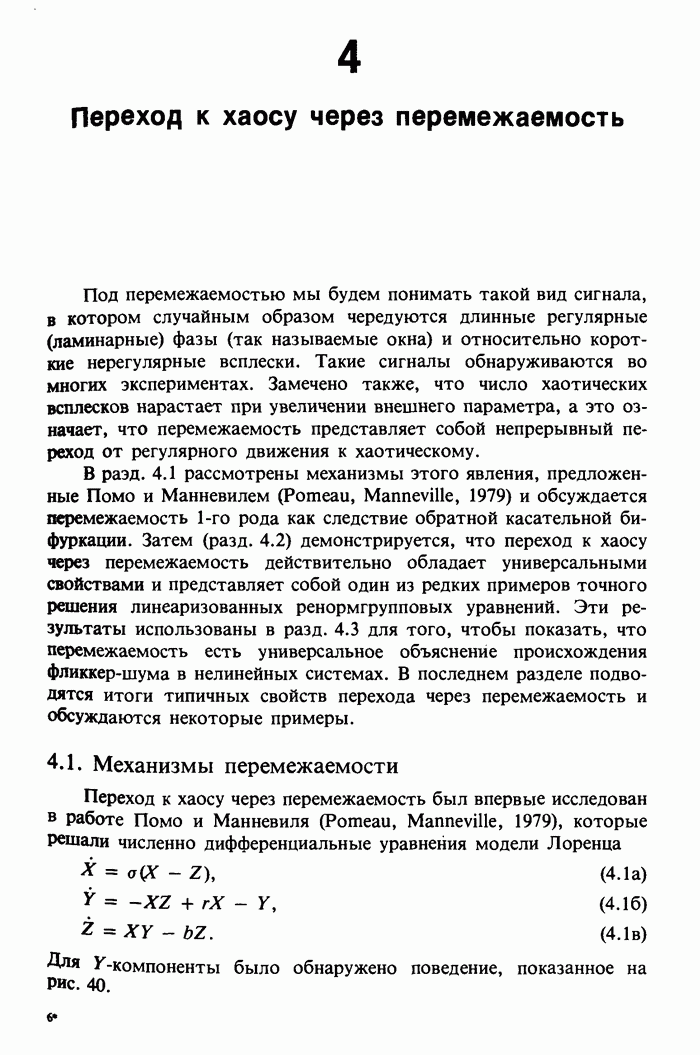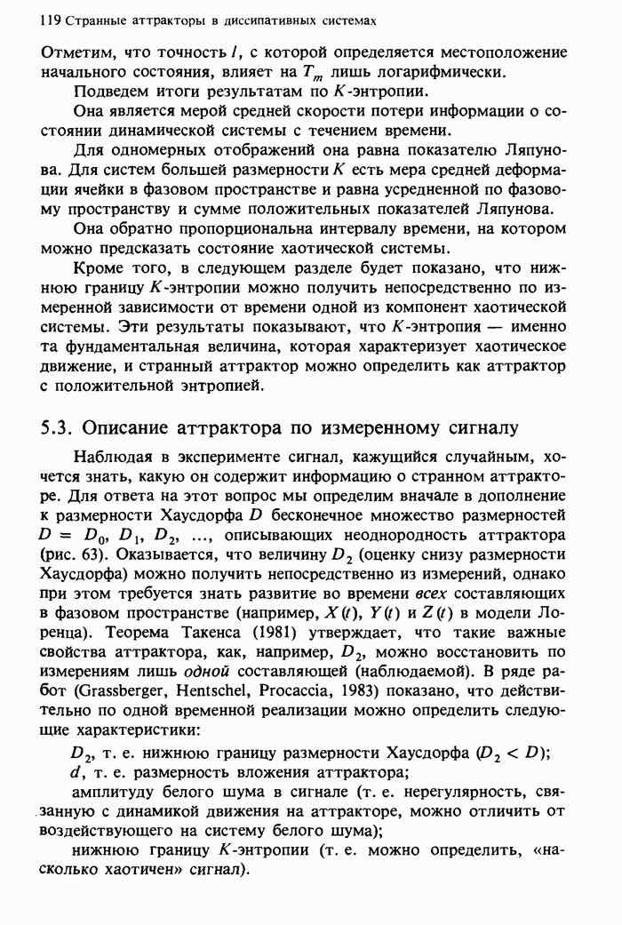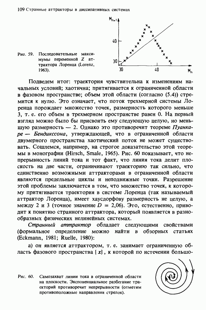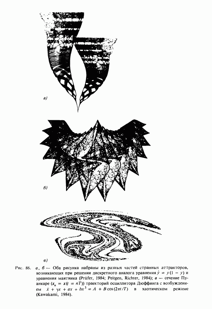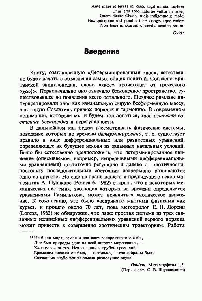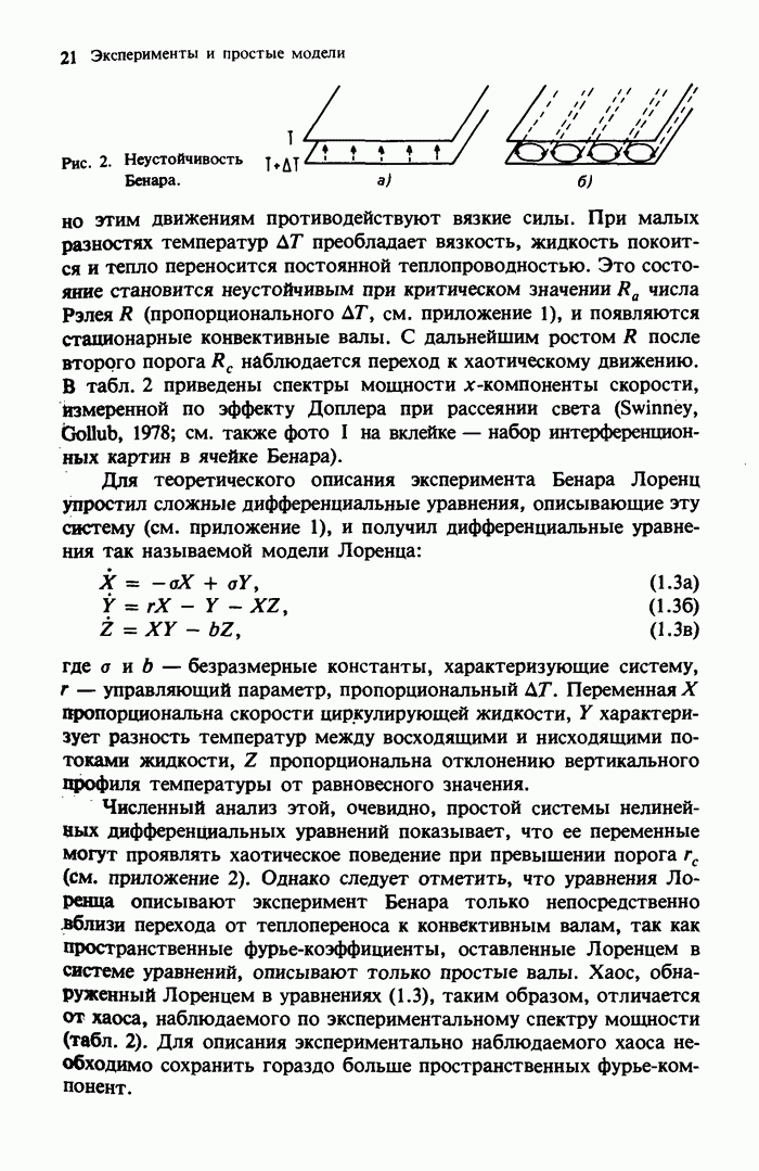 Предисловие редакторов переводаКнига Гейнца Шустера, профессора Института теоретической физики при Франкфуртском университете, чрезвычайно привлекательна для ознакомления с таким необычным для широкой аудитории предметом, как динамический хаос (или случайное поведение полностью детерминированных систем). Книга невелика по объему, достаточно информативна, изобретательно иллюстрирована и, наверное, займет достойное место среди уже имеющейся литературы по хаосу. Мы уверены, что сильные стороны книги читатель оценит сам. Здесь же нам представляется уместным хотя бы обозначить те ключевые идеи, которые позволили существенно продвинуться в понимании и описании сложного поведения детермированных сред по сравнению с тем состоянием, что отражено в книге. При этом будем иметь в виду, что Шустер обсуждает лишь «маломерный» динамический хаос — самый простой из того, что встречается в природе и технике и поддается описанию с помощью детерминированных моделей. Одной из наиболее ярких и важных проблем, непосредственно связанных с «многомерным» хаосом, является, конечно, турбулентность — нерегулярное поведение нелинейных сред или полей. Заметим сразу, что обсуждаемую в книге хаотическую динамику небольшого числа заданных в пространстве мод (или структур) можно отождествить с реальной динамикой нелинейного поля (скорости или давления в гидродинамическом течении, электромагнитного поля в плазме и т. п.) лишь в узком интервале значений параметров. Более точно, при относительно малом превышении порога неустойчивости, или, как часто говорят, при малой надкритичности. С ростом надкритичности, например числа Рейнольдса, число степеней свободы среды (или поля), эффективно вовлекаемых в хаотическое движение, в общем случае увеличивается, корреляции между ними разрушаются и хаос становится все более сложным. Этому соответствует увеличение размерности странного аттрактора, вложенного в фазовое пространство течения. Один из наиболее принципиальных вопросов здесь — связь числа вовлекаемых в хаотическую динамику поля коллективных возбуждений (мод) и размерности аттрактора с картиной пространственного распределения поля. Как показали недавние физические и компьютерные эксперименты [1—4], по мере увеличения размерности аттрактора пространственная картина поля (или гидродинамического течения) все более усложняется. Например, если говорить о термоконвекции в горизонтальном слое, то по мере увеличения числа Рэлея регулярная решетка конвективных структур — ячеек Бенара — «плавится», появляются дефекты, несоизмеримая модуляция и, наконец, пространственно-временной хаос, который и есть собственно турбулентность. Если маломерный хаос характеризуется сложным временным, но весьма простым пространственным поведением, отвечающим регулярной картине поля, то в турбулентном режиме сложным будет и временное, и пространственное поведение. Очень важен совсем недавно осознанный факт, что, подобно тому как случайность во времени может быть не связана с действием внешних шумов, случайное распределение поля в пространстве может быть следствием лишь детерминированных законов, управляющих изменением переменных вдоль координат, и весьма слабо зависеть, например, от случайных неоднородностей. Сейчас уже в некоторой степени ясны и пути (сц