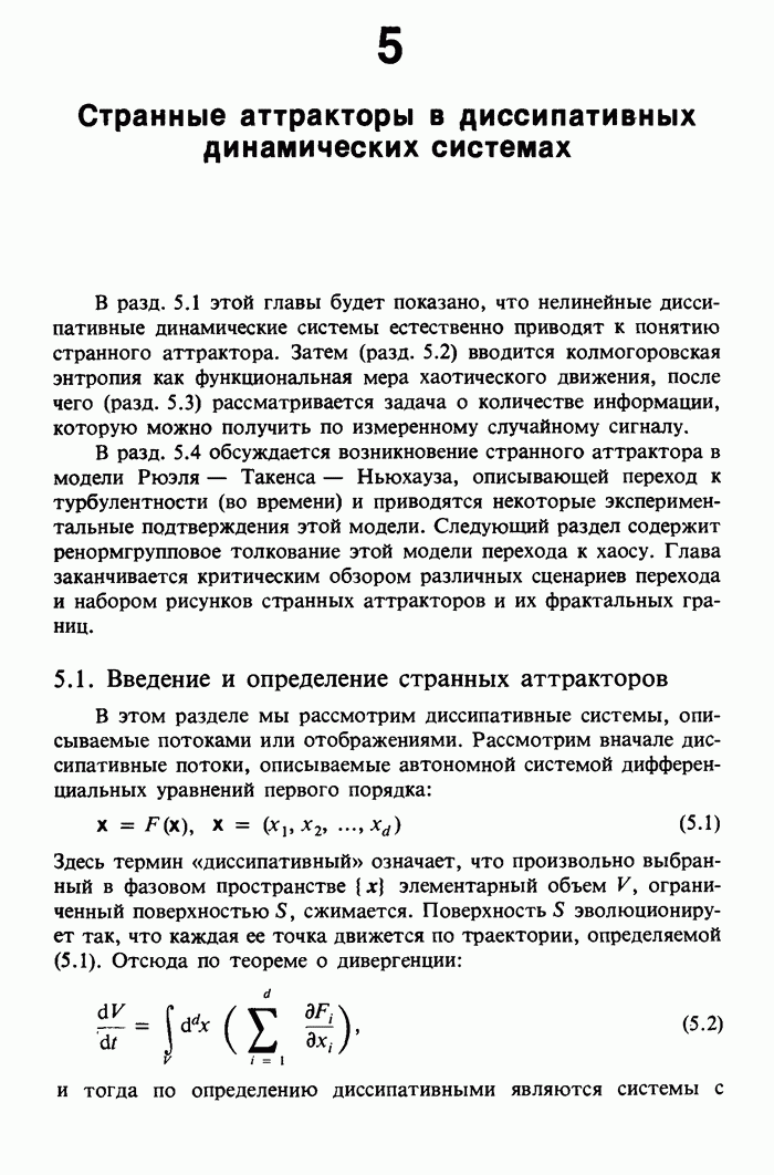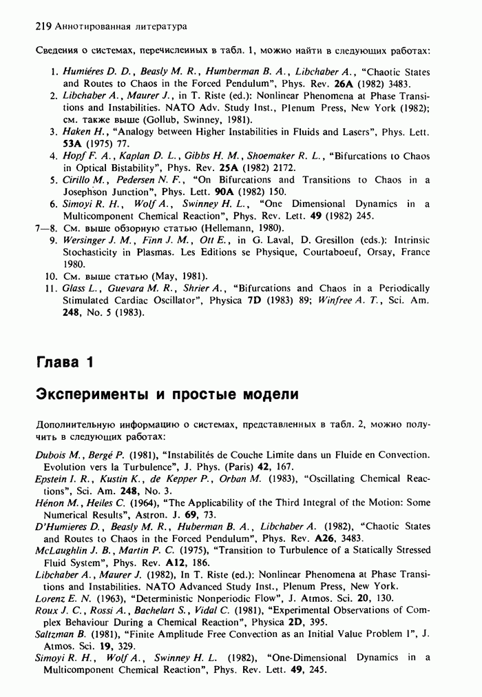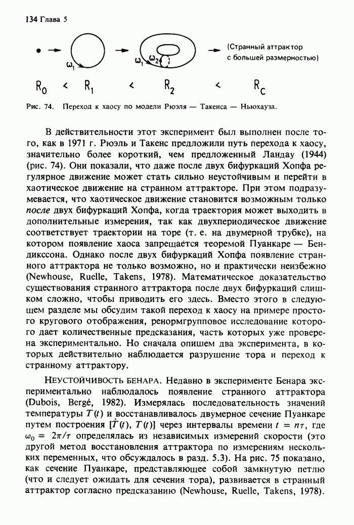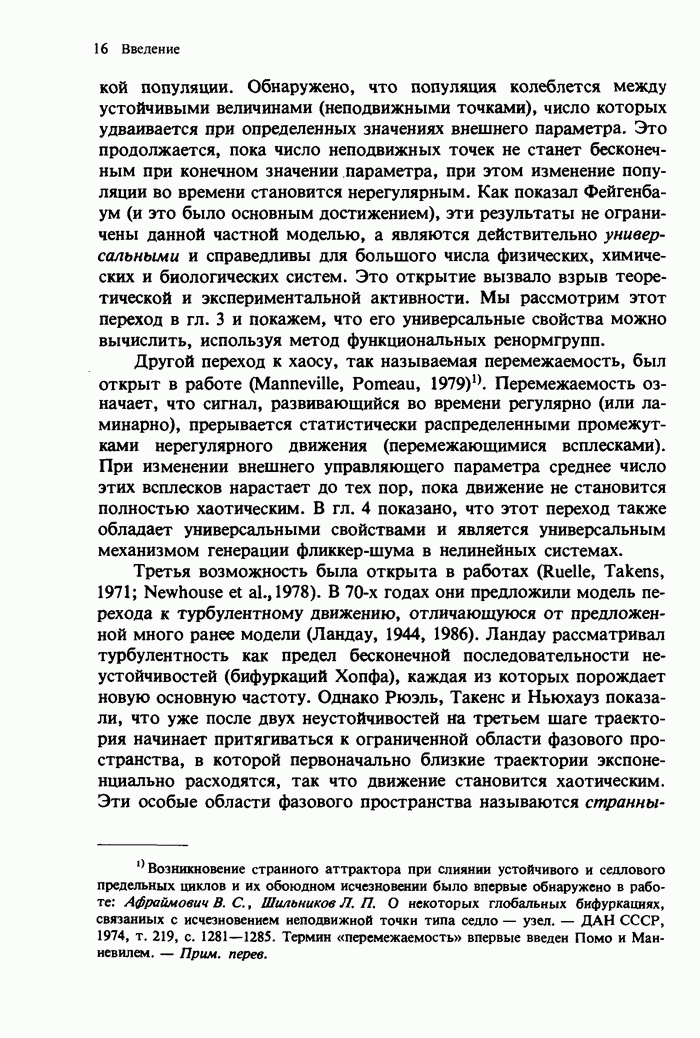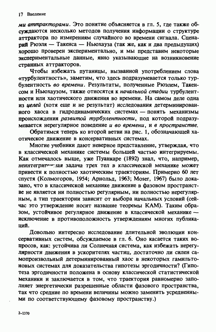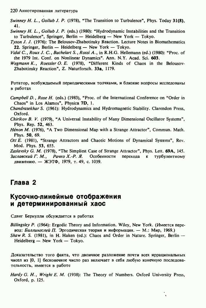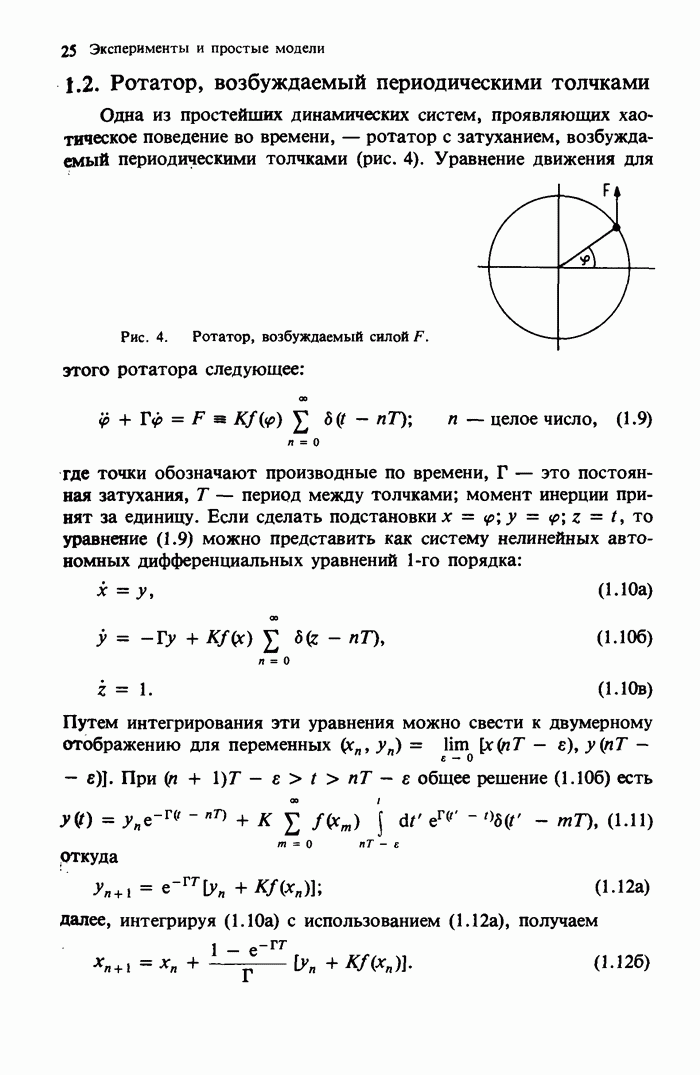 Предисловие редакторов переводаКнига Гейнца Шустера, профессора Института теоретической физики при Франкфуртском университете, чрезвычайно привлекательна для ознакомления с таким необычным для широкой аудитории предметом, как динамический хаос (или случайное поведение полностью детерминированных систем). Книга невелика по объему, достаточно информативна, изобретательно иллюстрирована и, наверное, займет достойное место среди уже имеющейся литературы по хаосу. Мы уверены, что сильные стороны книги читатель оценит сам. Здесь же нам представляется уместным хотя бы обозначить те ключевые идеи, которые позволили существенно продвинуться в понимании и описании сложного поведения детермированных сред по сравнению с тем состоянием, что отражено в книге. При этом будем иметь в виду, что Шустер обсуждает лишь «маломерный» динамический хаос — самый простой из того, что встречается в природе и технике и поддается описанию с помощью детерминированных моделей. Одной из наиболее ярких и важных проблем, непосредственно связанных с «многомерным» хаосом, является, конечно, турбулентность — нерегулярное поведение нелинейных сред или полей. Заметим сразу, что обсуждаемую в книге хаотическую динамику небольшого числа заданных в пространстве мод (или структур) можно отождествить с реальной динамикой нелинейного поля (скорости или давления в гидродинамическом течении, электромагнитного поля в плазме и т. п.) лишь в узком интервале значений параметров. Более точно, при относительно малом превышении порога неустойчивости, или, как часто говорят, при малой надкритичности. С ростом надкритичности, например числа Рейнольдса, число степеней свободы среды (или поля), эффективно вовлекаемых в хаотическое движение, в общем случае увеличивается, корреляции между ними разрушаются и хаос становится все более сложным. Этому соответствует увеличение размерности странного аттрактора, вложенного в фазовое пространство течения. Один из наиболее принципиальных вопросов здесь — связь числа вовлекаемых в хаотическую динамику поля коллективных возбуждений (мод) и размерности аттрактора с картиной пространственного распределения поля. Как показали недавние физические и компьютерные эксперименты [1—4], по мере увеличения размерности аттрактора пространственная картина поля (или гидродинамического течения) все более усложняется. Например, если говорить о термоконвекции в горизонтальном слое, то по мере увеличения числа Рэлея регулярная решетка конвективных структур — ячеек Бенара — «плавится», появляются дефекты, несоизмеримая модуляция и, наконец, пространственно-временной хаос, который и есть собственно турбулентность. Если маломерный хаос характеризуется сложным временным, но весьма простым пространственным поведением, отвечающим регулярной картине поля, то в турбулентном режиме сложным будет и временное, и пространственное поведение. Очень важен совсем недавно осознанный факт, что, подобно тому как случайность во времени может быть не связана с действием внешних шумов, случайное распределение поля в пространстве может быть следствием лишь детерминированных законов, управляющих изменением переменных вдоль координат, и весьма слабо зависеть, например, от случайных неоднородностей. Сейчас уже в некоторой степени ясны и пути (сц