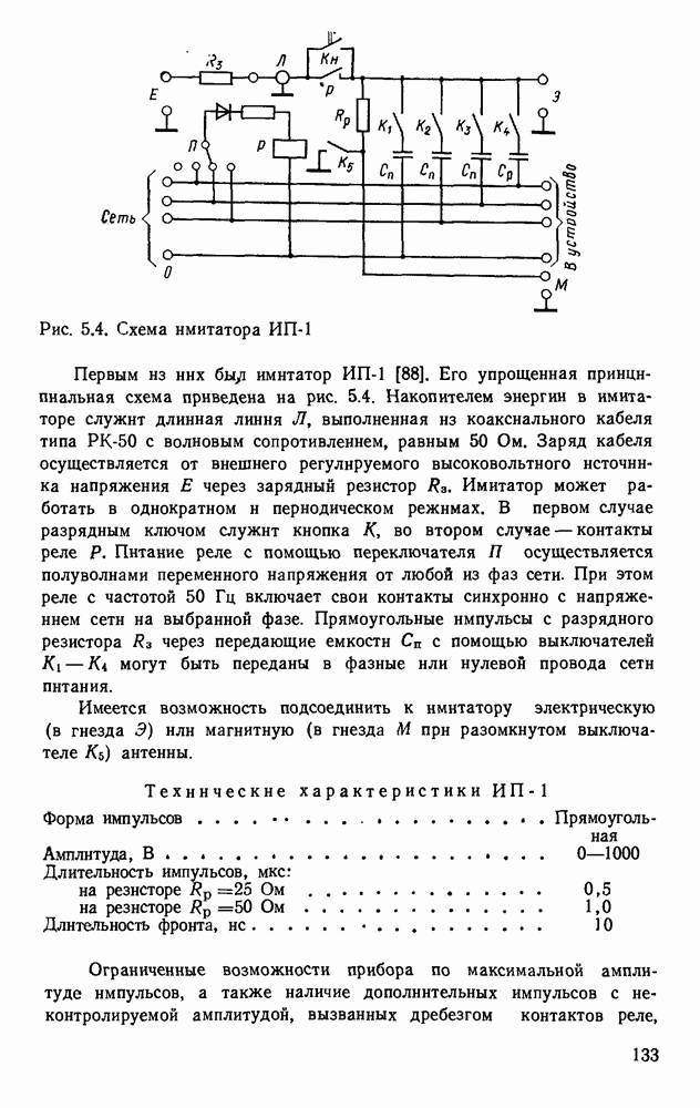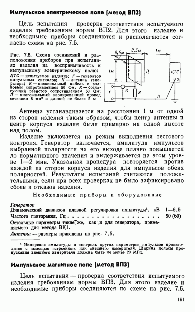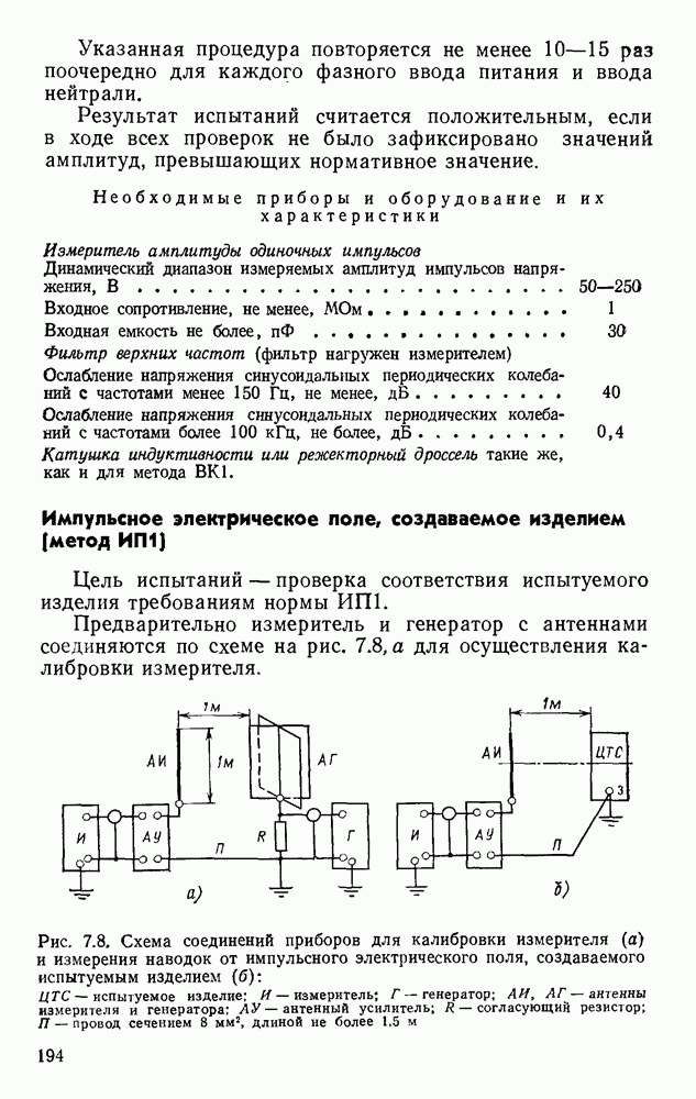 Технические требования: амплитуда импульсов напряжения, наводимых на измерительную антенну с регламентированными формой и размерами при коммутациях питания изделия и (или) его частей, не должна превышать значения, наблюдаемого, когда импульсы на измерительную антенну наводятся от удаленной на 1 м имитирующей антенны, на которую подаются импульсы напряжения с амплитудой