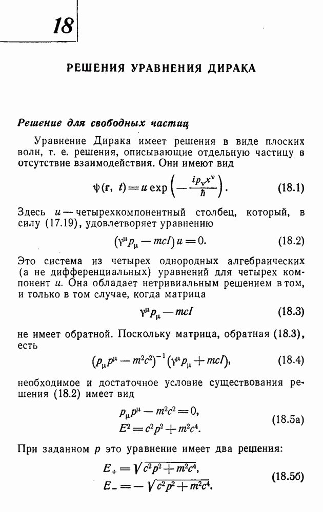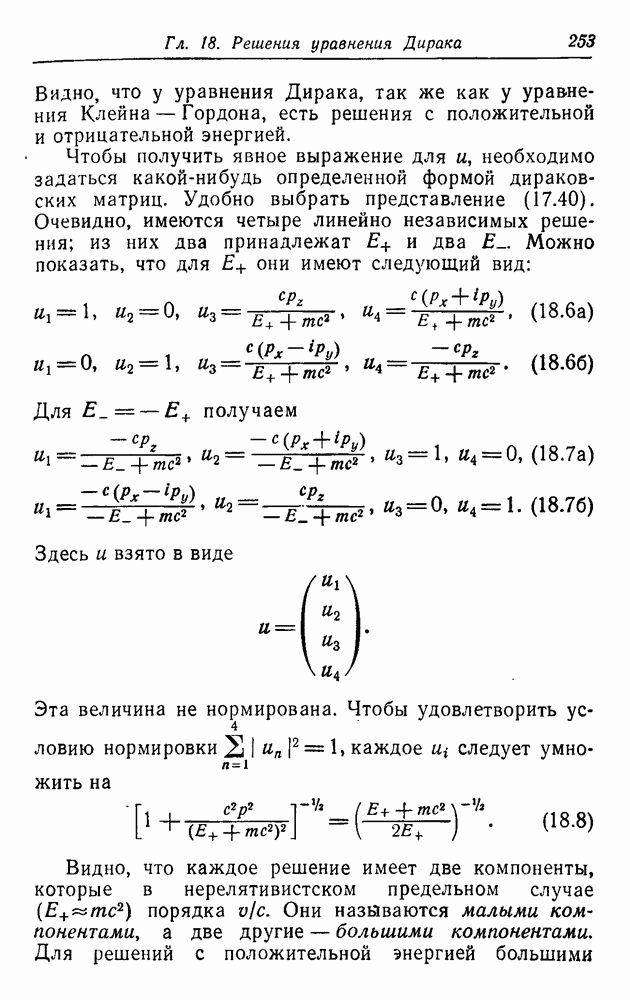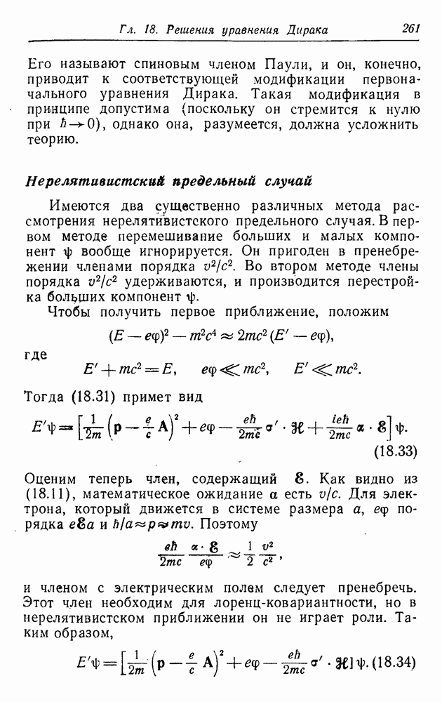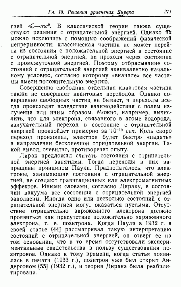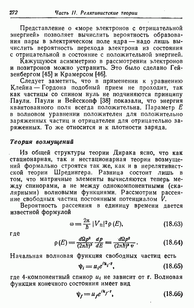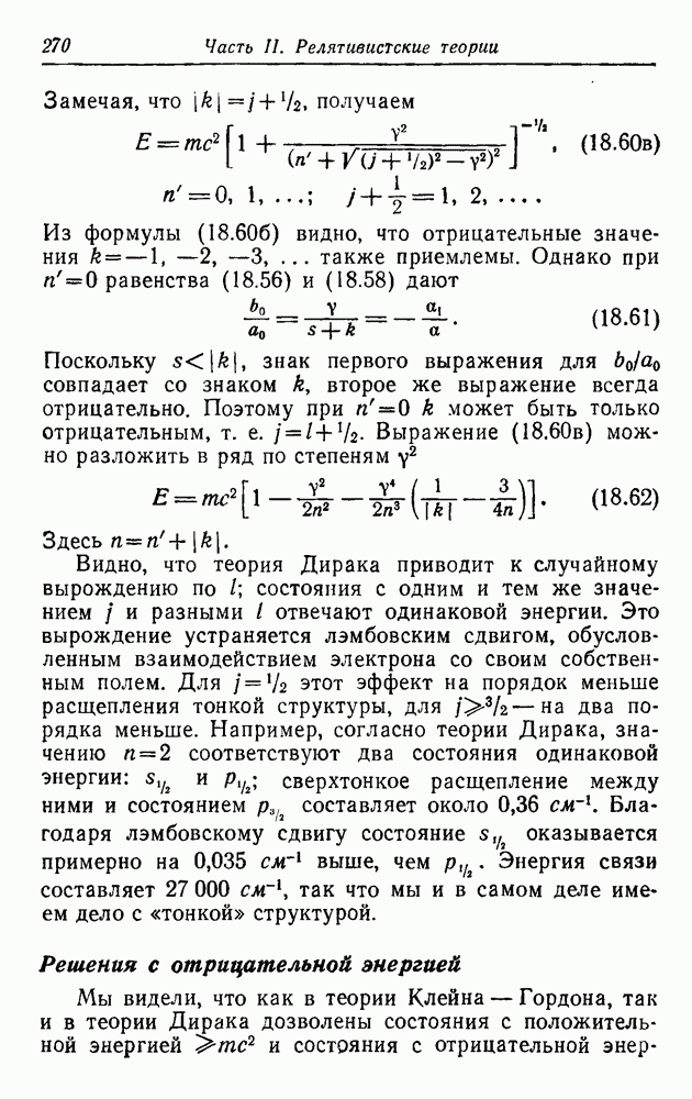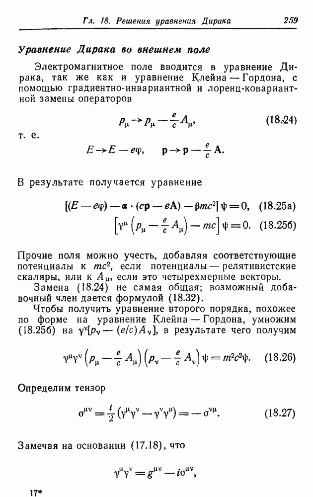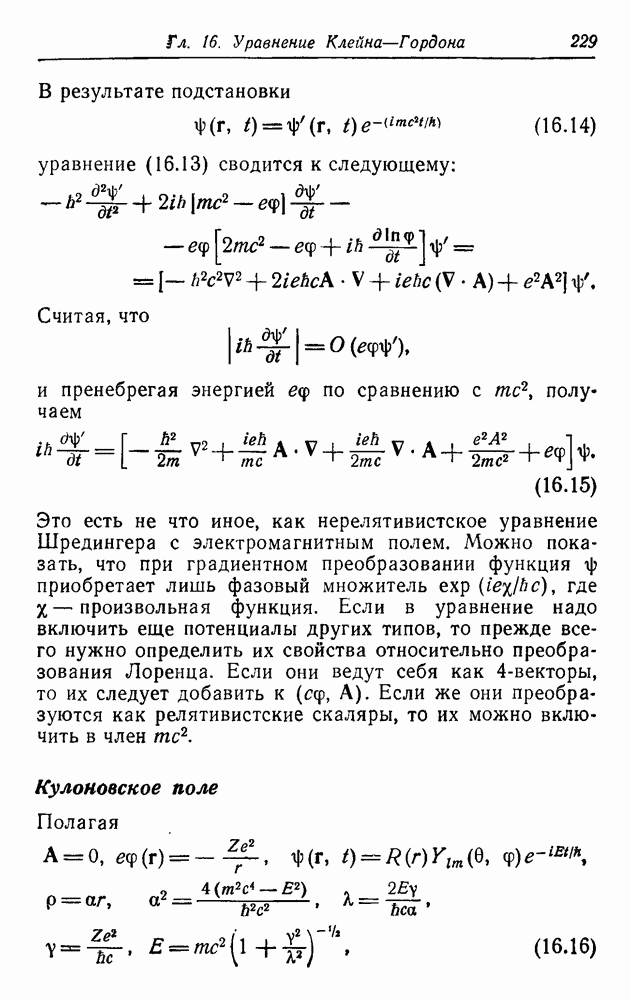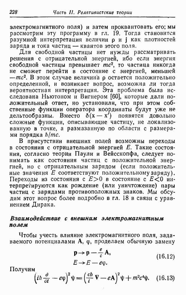 В нерелятивистском приближении Из-за этих затруднений от уравнения Клейна — Гордона сначала отказались. Правильную интерпретацию уравнения Клейна — Гордона дали Паули и Вейсскопф [38]. Они предложили рассматривать это уравнение как классическое уравнение поля (подобно уравнениям электромагнитного поля) и затем проквантовать его; мы рассмотрим эту программу в гл. 19. Тогда становится разумной интерпретация величин Для свободной частицы нет нужды рассматривать решения с отрицательной энергией, ибо если энергия свободной частицы превышает В присутствии внешних полей возможны переходы в состояния с отрицательной энергией Е. Такие состояния, согласно теории Паули и Вейсскопфа, следует понимать как состояния частиц с положительной энергией, но с отрицательным зарядом (если положительные значения Е соответствуют положительному заряду). Переходы из состояния с Взаимодействие с внешним электромагнитным полемЧтобы учесть влияние электромагнитного поля, задаваемого потенциалами