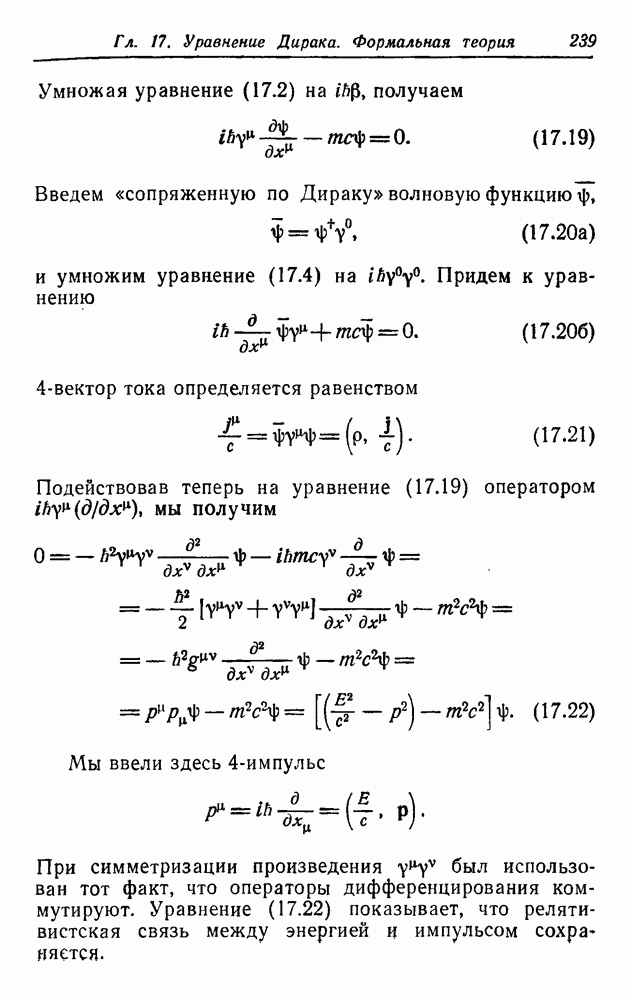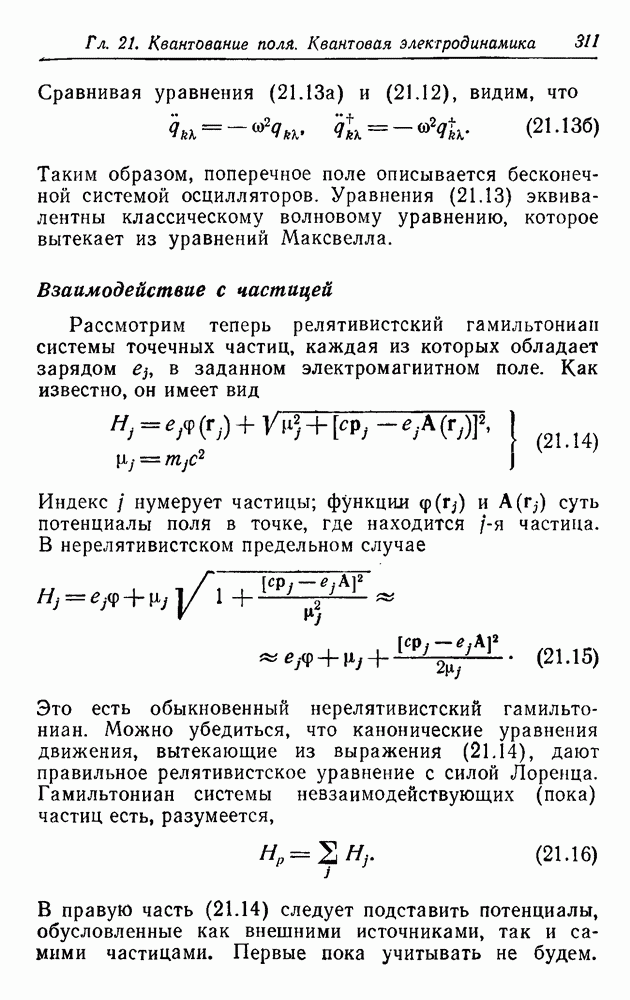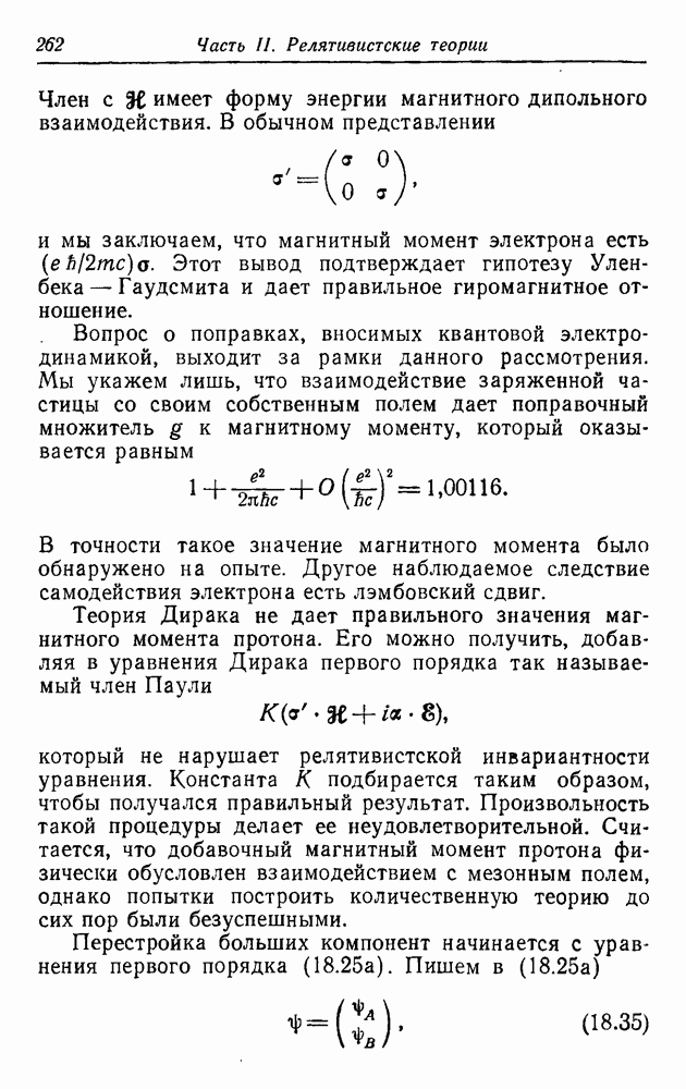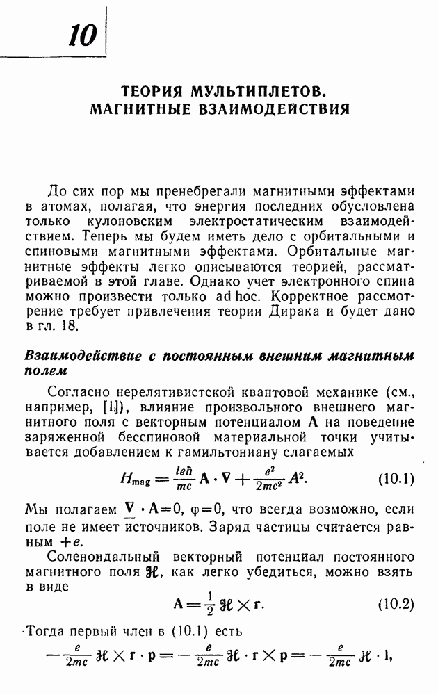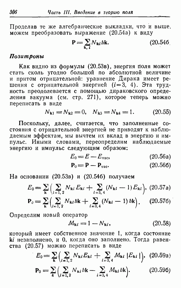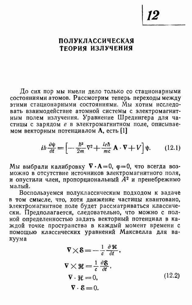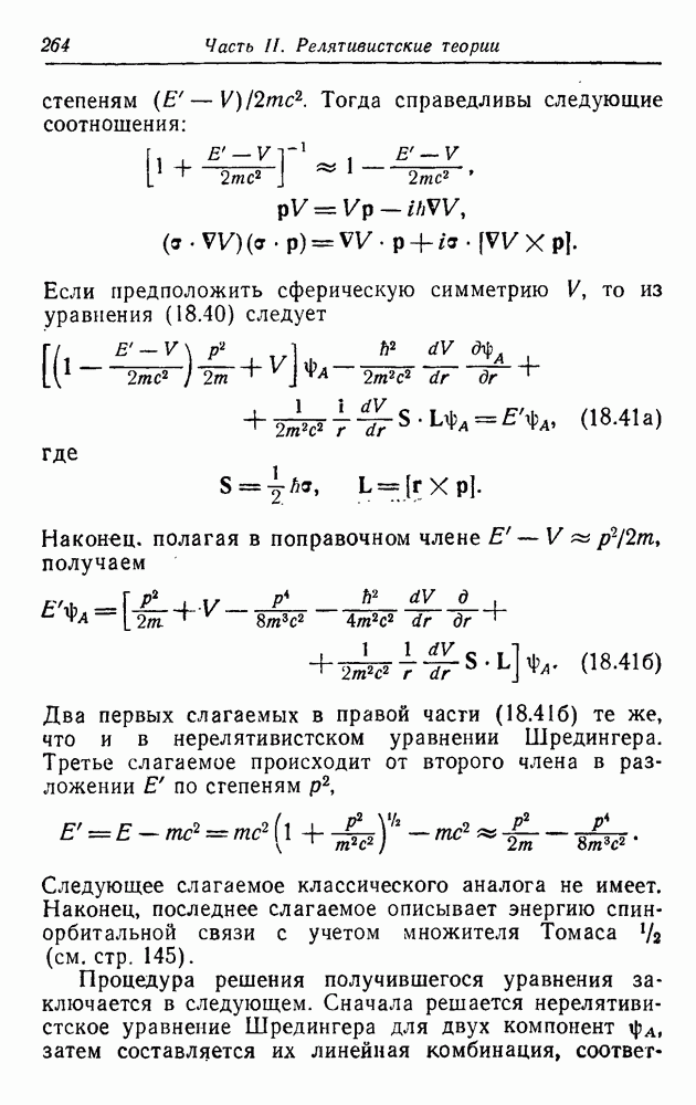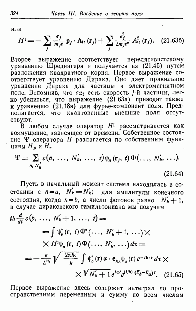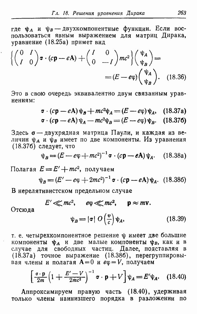 В нерелятивистском приближении Из-за этих затруднений от уравнения Клейна — Гордона сначала отказались. Правильную интерпретацию уравнения Клейна — Гордона дали Паули и Вейсскопф [38]. Они предложили рассматривать это уравнение как классическое уравнение поля (подобно уравнениям электромагнитного поля) и затем проквантовать его; мы рассмотрим эту программу в гл. 19. Тогда становится разумной интерпретация величин Для свободной частицы нет нужды рассматривать решения с отрицательной энергией, ибо если энергия свободной частицы превышает В присутствии внешних полей возможны переходы в состояния с отрицательной энергией Е. Такие состояния, согласно теории Паули и Вейсскопфа, следует понимать как состояния частиц с положительной энергией, но с отрицательным зарядом (если положительные значения Е соответствуют положительному заряду). Переходы из состояния с Взаимодействие с внешним электромагнитным полемЧтобы учесть влияние электромагнитного поля, задаваемого потенциалами