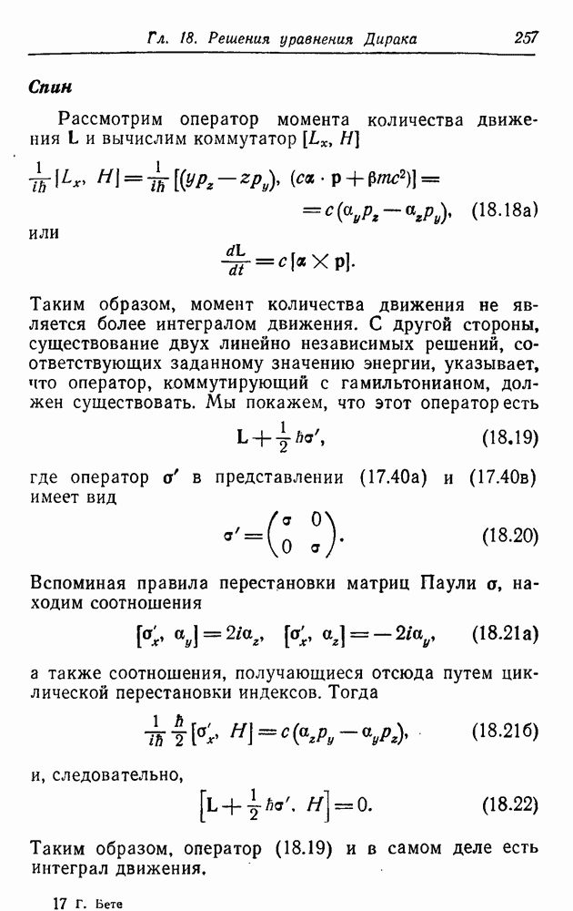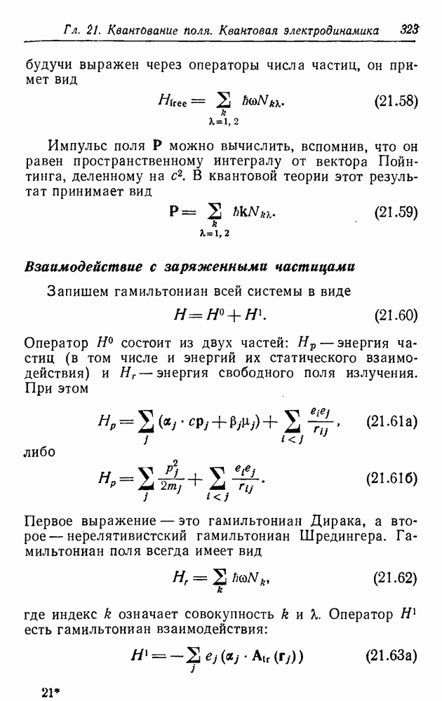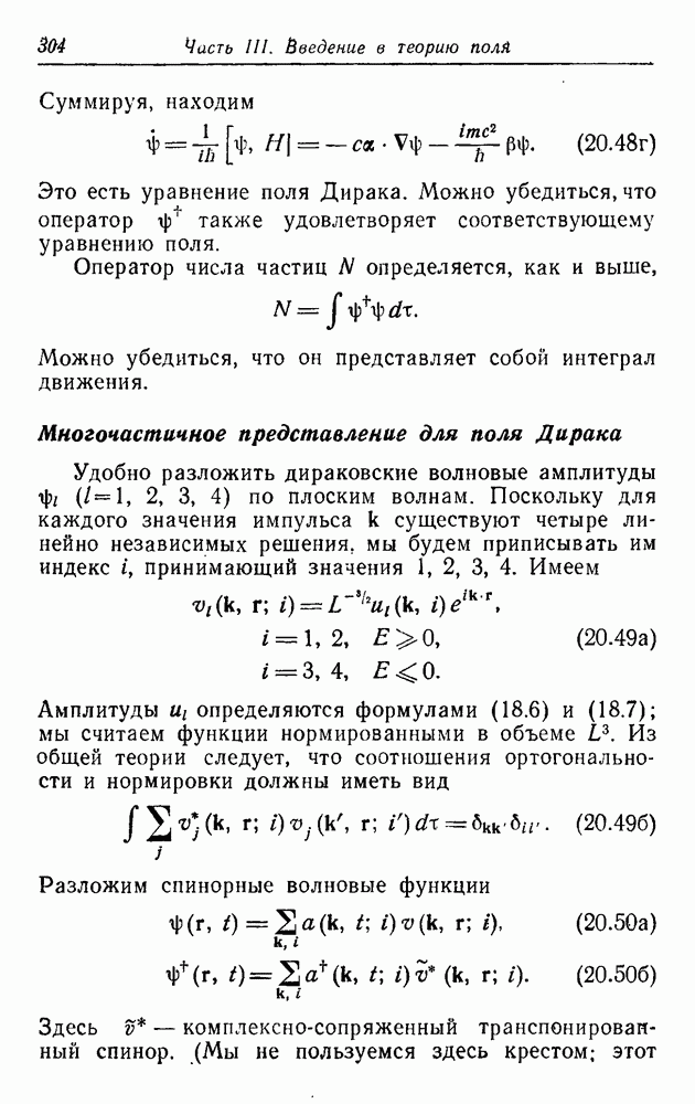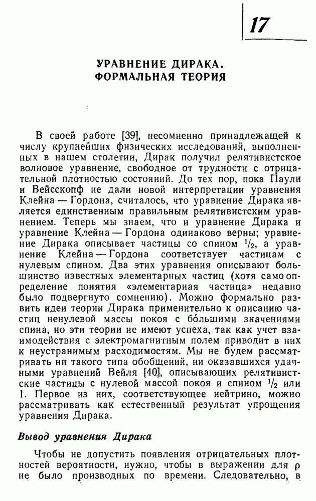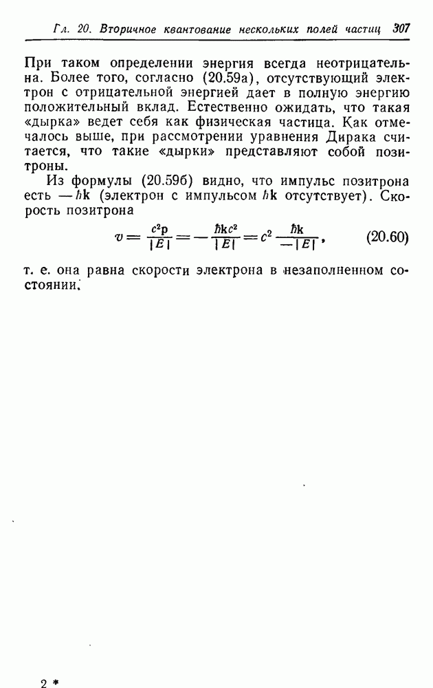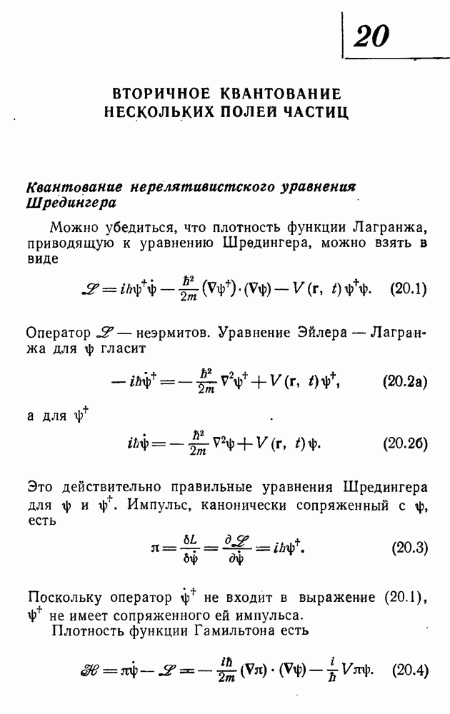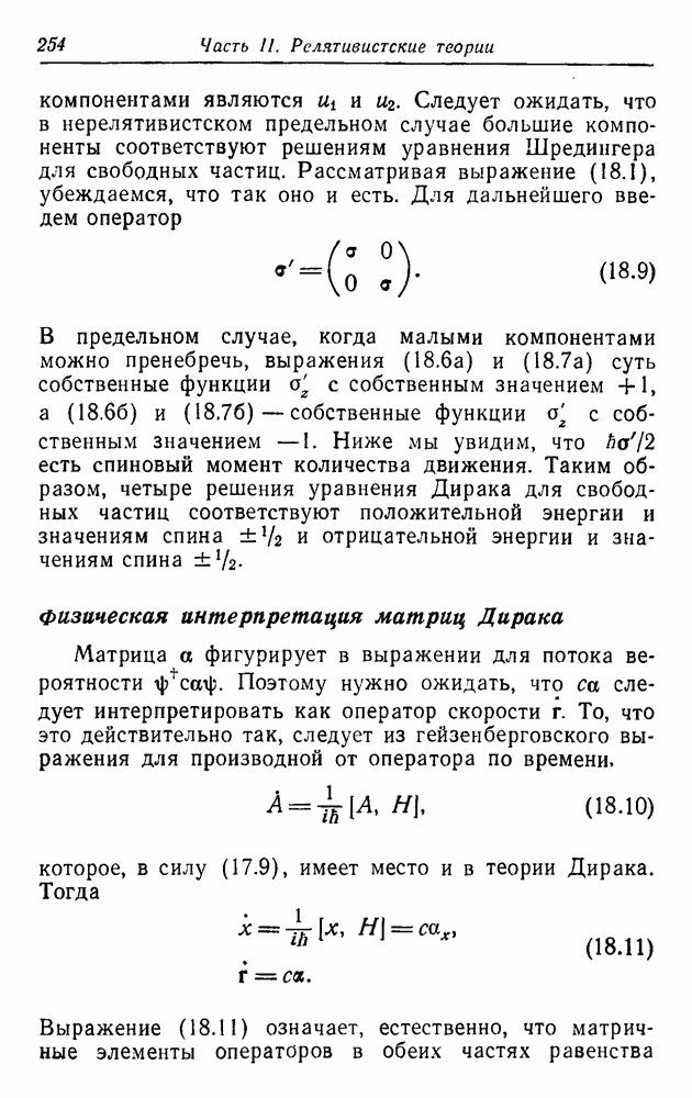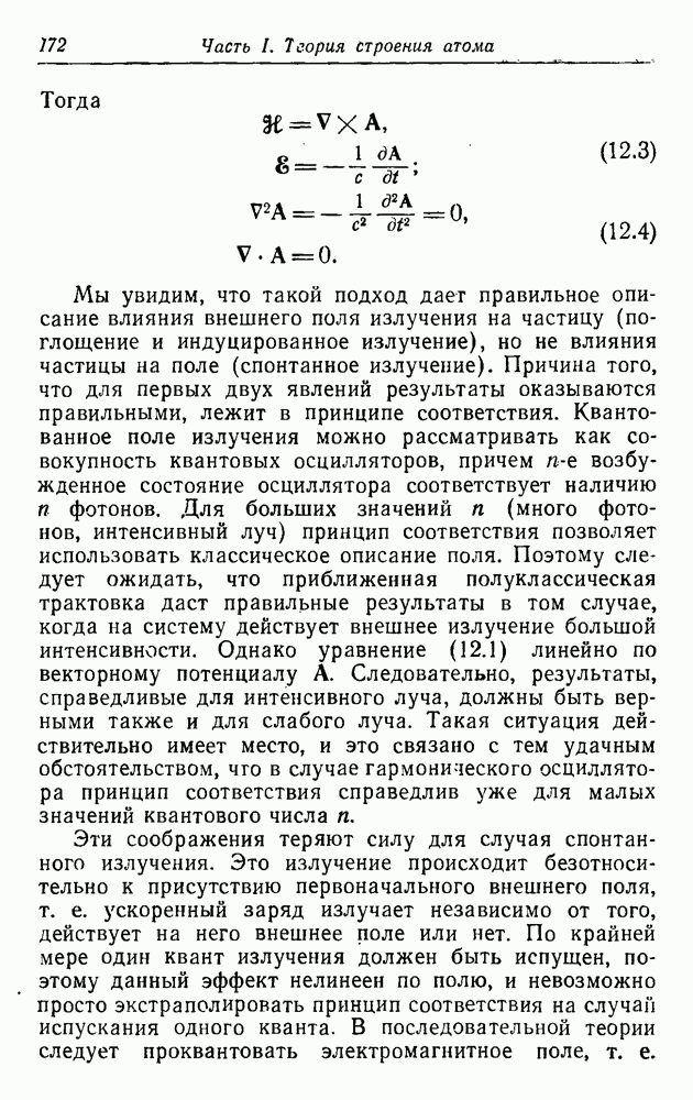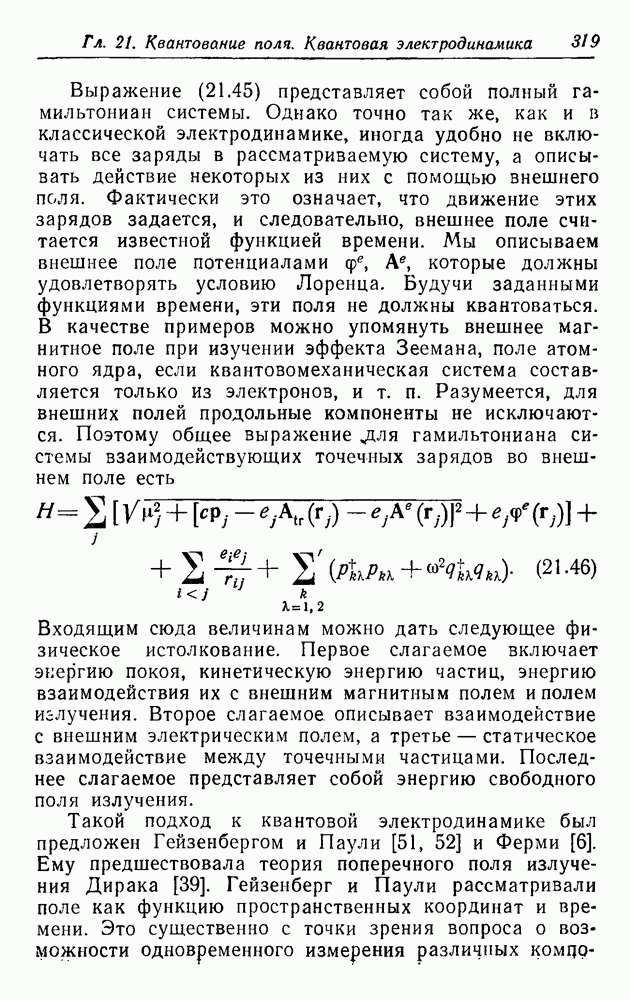 В нерелятивистском приближении Из-за этих затруднений от уравнения Клейна — Гордона сначала отказались. Правильную интерпретацию уравнения Клейна — Гордона дали Паули и Вейсскопф [38]. Они предложили рассматривать это уравнение как классическое уравнение поля (подобно уравнениям электромагнитного поля) и затем проквантовать его; мы рассмотрим эту программу в гл. 19. Тогда становится разумной интерпретация величин Для свободной частицы нет нужды рассматривать решения с отрицательной энергией, ибо если энергия свободной частицы превышает В присутствии внешних полей возможны переходы в состояния с отрицательной энергией Е. Такие состояния, согласно теории Паули и Вейсскопфа, следует понимать как состояния частиц с положительной энергией, но с отрицательным зарядом (если положительные значения Е соответствуют положительному заряду). Переходы из состояния с Взаимодействие с внешним электромагнитным полемЧтобы учесть влияние электромагнитного поля, задаваемого потенциалами