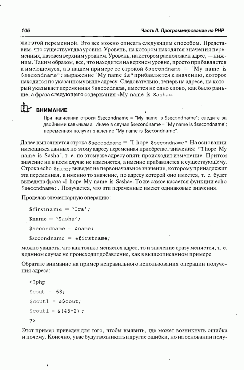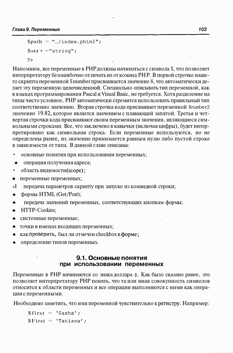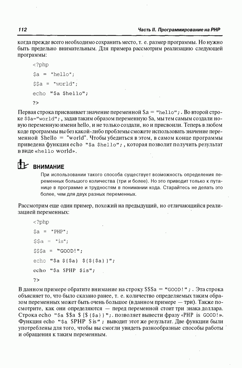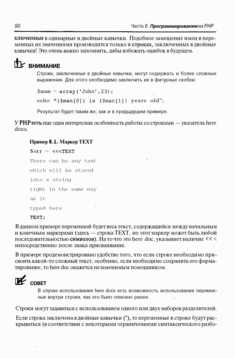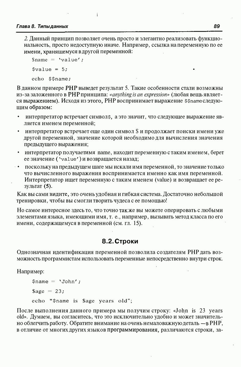 Возможность однозначно идентифицировать переменную позволила создателям РНР дать возможность программистам использовать переменные непосредственно внутри строк.
