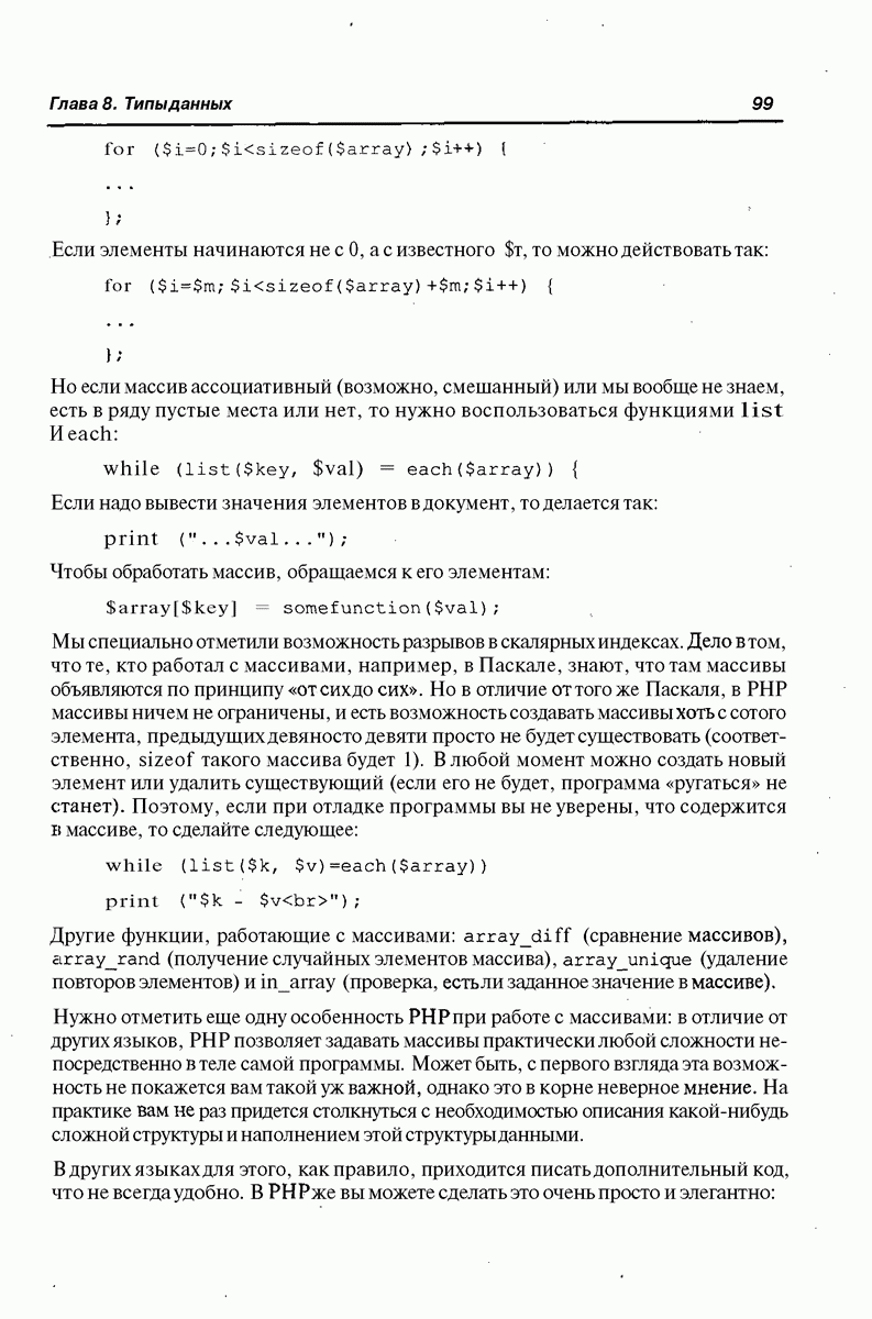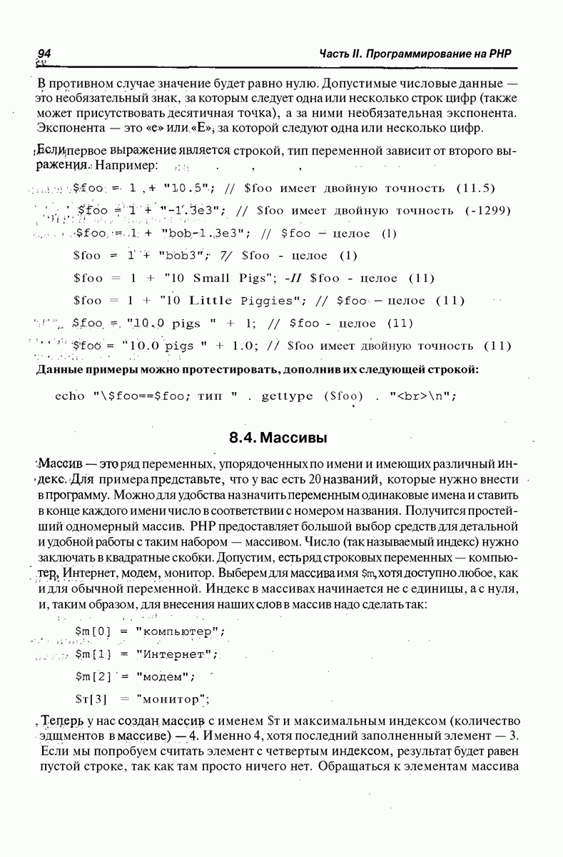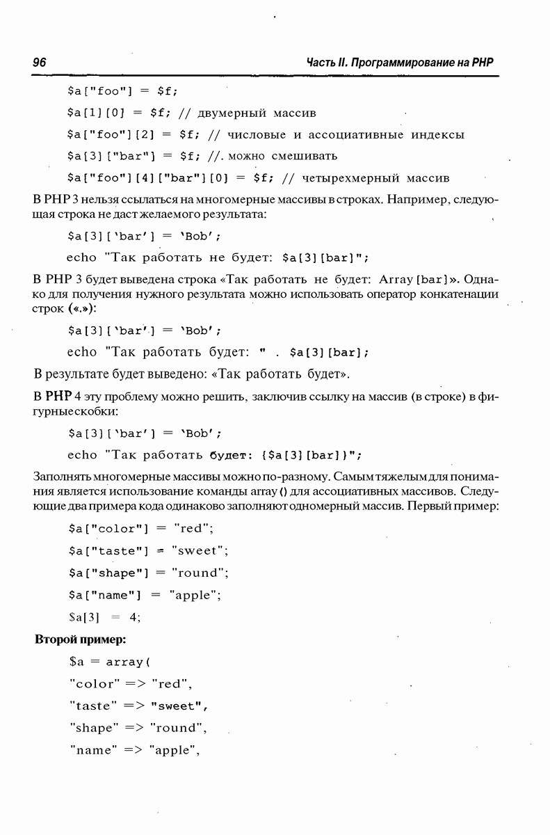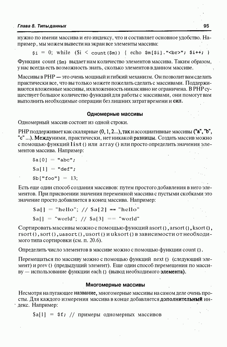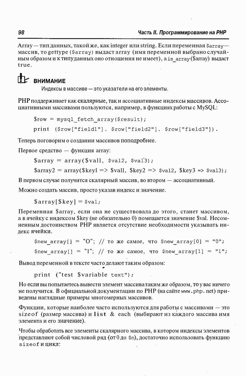 РНР поддерживает как скалярные, так и ассоциативные массивы. В отличие от других языков РНР позволяет задавать массивы практически любой сложности непосредственно в теле самой программы.