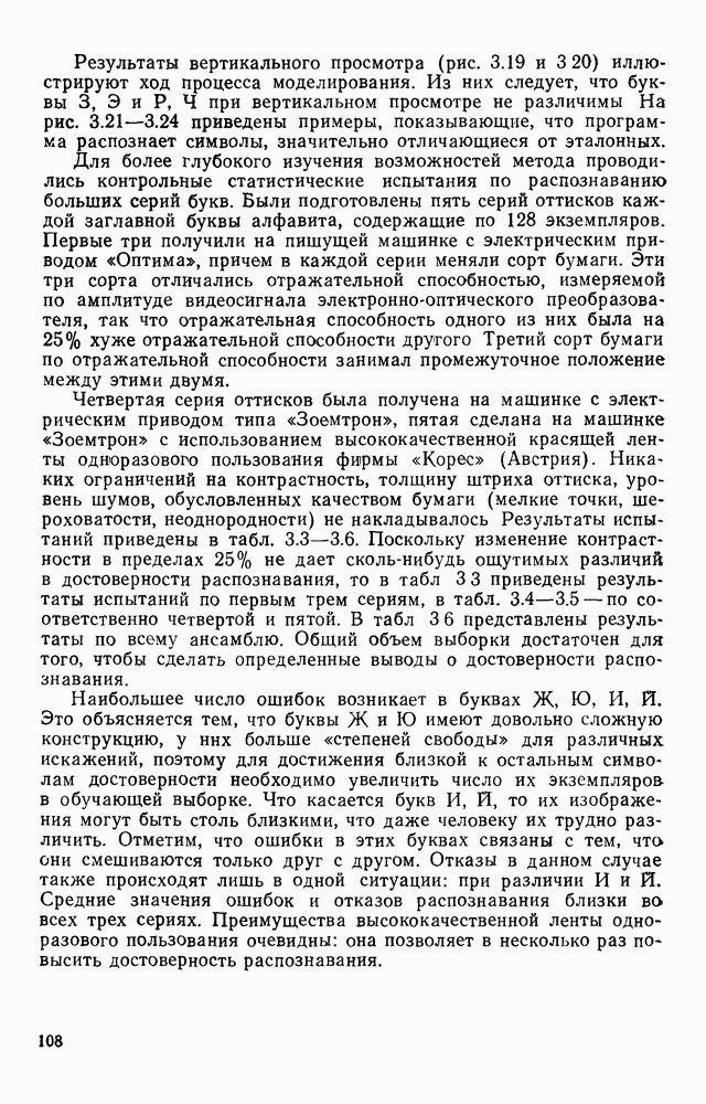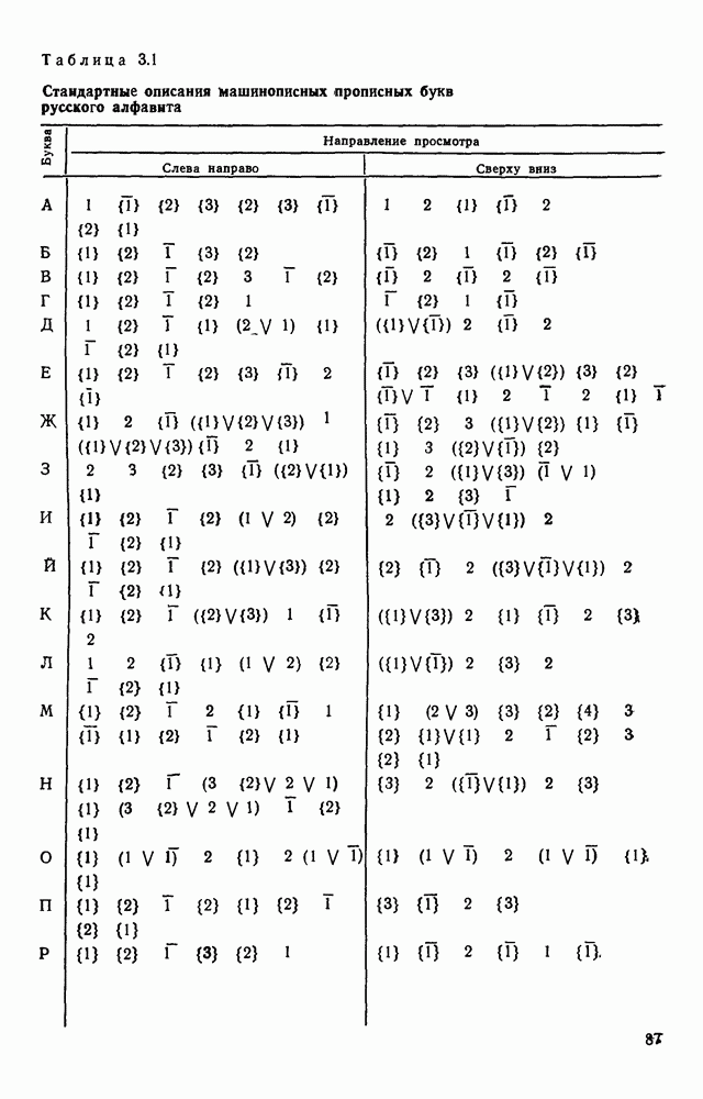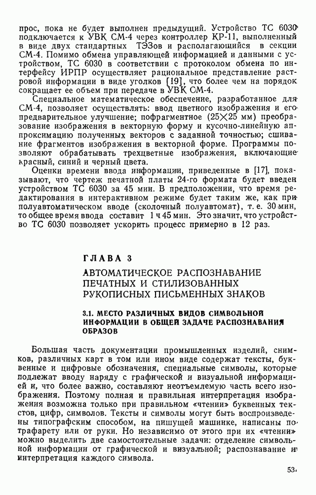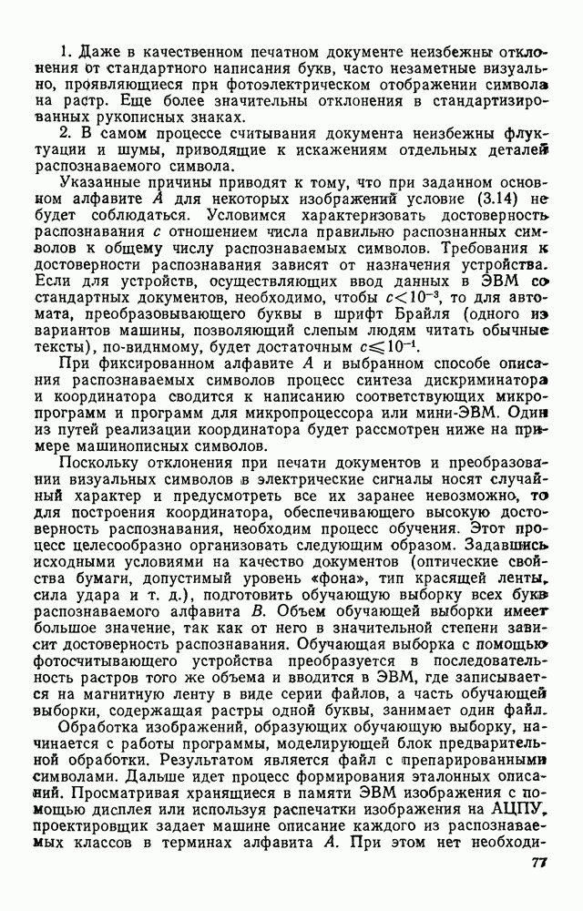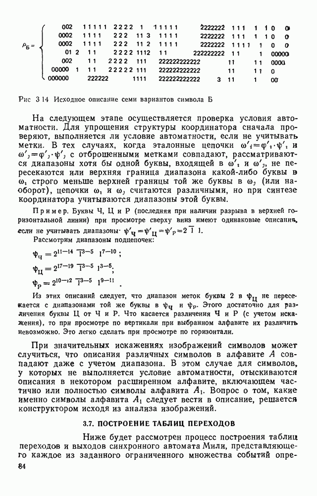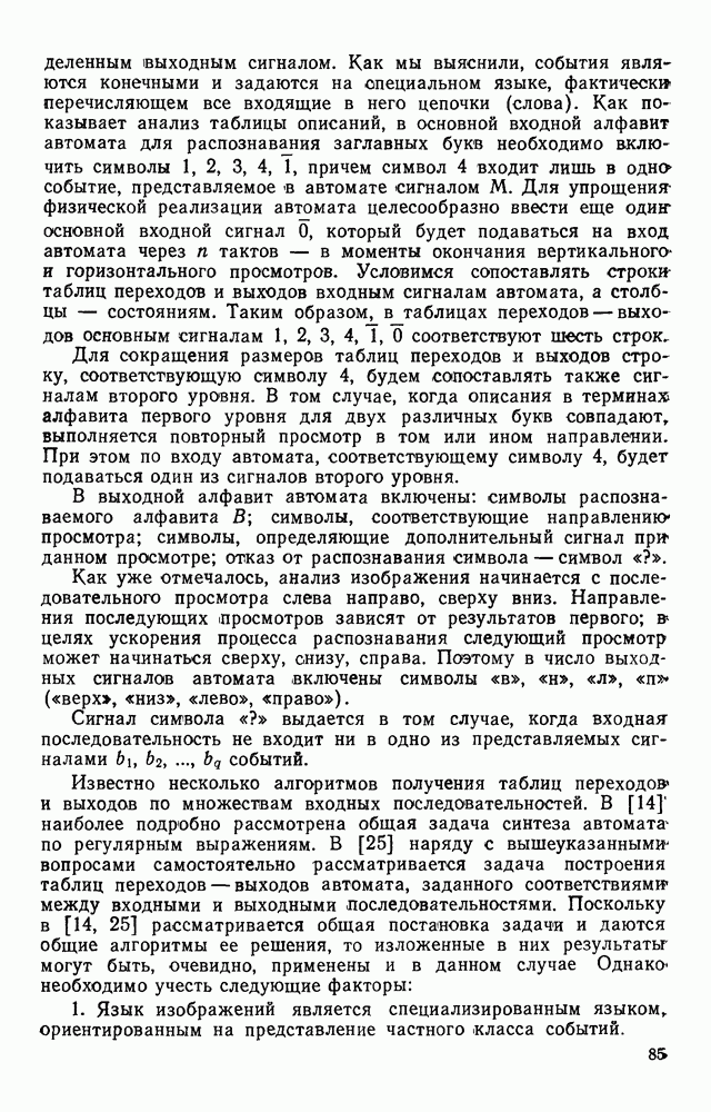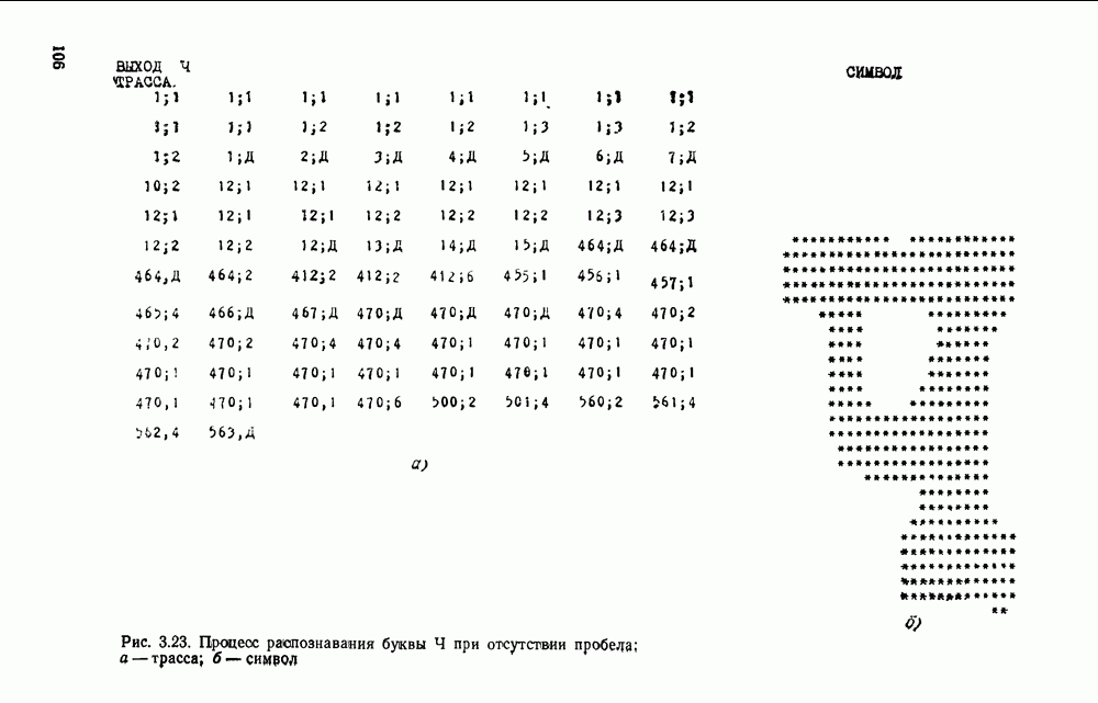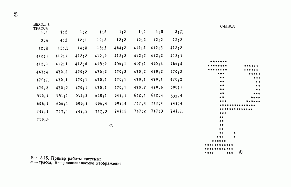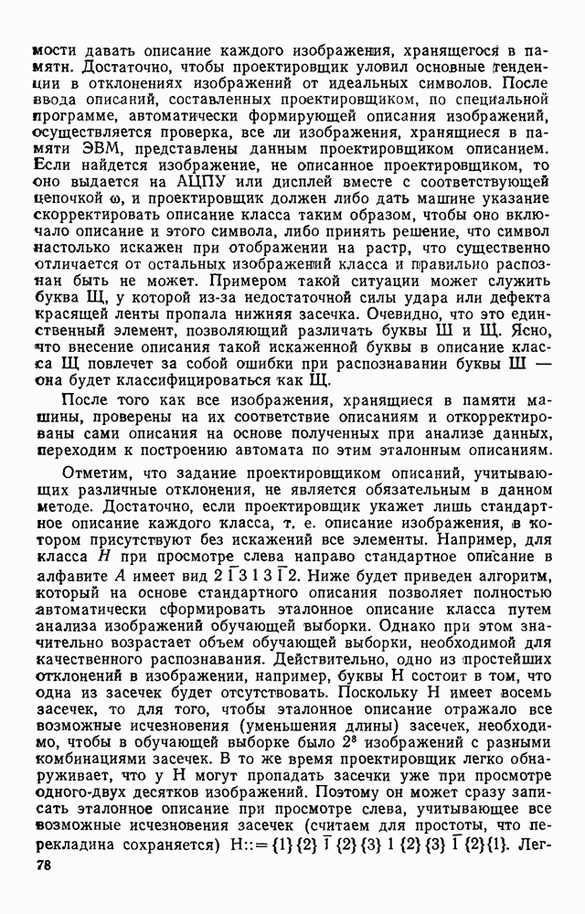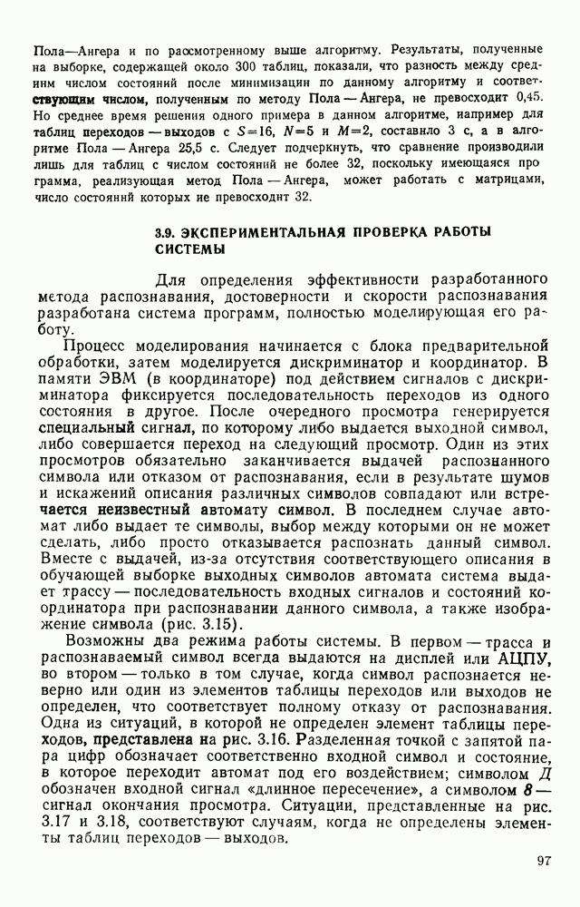 3.9. ЭКСПЕРИМЕНТАЛЬНАЯ ПРОВЕРКА РАБОТЫ СИСТЕМЫДля определения эффективности разработанного метода распознавания, достоверности и скорости распознавания разработана система программ, полностью моделирующая его работу. Процесс моделирования начинается с блока предварительной обработки, затем моделируется дискриминатор и координатор. В памяти ЭВМ (в координаторе) под действием сигналов с дискриминатора фиксируется последовательность переходов из одного состояния в другое. После очередного просмотра генерируется специальный сигнал, по которому либо выдается выходной символ, либо совершается переход на следующий просмотр. Один из этих просмотров обязательно заканчивается выдачей распознанного символа или отказом от распознавания, если в результате шумов и искажений описания различных символов совпадают или встречается неизвестный автомату символ. В последнем случае автомат либо выдает те символы, выбор между которыми он не может сделать, либо просто отказывается распознать данный символ. Вместе с выдачей, из-за отсутствия соответствующего описания в обучающей выборке выходных символов автомата система выдает трассу — последовательность входных сигналов и состояний координатора при распознавании данного символа, а также изображение символа (рис. 3.15). Возможны два режима работы системы. В первом — трасса и распознаваемый символ всегда выдаются на дисплей или АЦПУ, во втором — только в том случае, когда символ распознается неверно или один из элементов таблицы переходов или выходов не определен, что соответствует полному отказу от распознавания. Одна из ситуаций, в которой не определен элемент таблицы переходов, представлена на рис. 3.16. Разделенная точкой с запятой пара цифр обозначает соответственно входной символ и состояние, в которое переходит автомат под его воздействием; символом Д обозначен входной сигнал «длинное пересечение», а символом 8 — сигнал окончания просмотра. Ситуации, представленные на рис. 3.17 и 3.18, соответствуют случаям, когда не определены элементы таблиц переходов — выходов. (см. скан) Рис. 3.15. Пример работы системы: а — трасса; б — распознаваемое изображение (см. скан) Рис. 3.16 Отказ от распознавания: а — трасса; б — распознаваемое изображение (см. скан) Рис. 3.17. Отказ от распознавания: а — трасса; б — распознаваемое изображение (см. скан) Рис. 3.18. Отказ от распознавания: а - трасса; б — распознаваемое изображение (см. скан) Рис. 3.19. Распознавание букв 3 и Э, не различимых при вертикальном просмотре: а — трасса; б — символ (см. скан) Рис. 3.20. Распознавание букв Р и Ч, не различимых при вертикальном просмотре. а — трасса; б — символ (см. скан) Рис. 3.21. Пример распознавания существенно искаженного символа (см. скан) Рис. 3.22. Процесс распознавании буквы Н при отсутствии пробела а — трасса; б — символ (см. скан) Рис. 3.23. Процесс распознавания буквы Ч при отсутствии пробела; а — трасса; б — симрол (см. скан) Рис. 3.24. Распознавание значительно искаженного символа. а — трасса, б — символ Результаты вертикального просмотра (рис. 3.19 и 3 20) иллюстрируют ход процесса моделирования. Из них следует, что буквы З, Э и Р, Ч при вертикальном просмотре не различимы На рис. 3.21-3.24 приведены примеры, показывающие, что программа распознает символы, значительно отличающиеся от эталонных. Для более глубокого изучения возможностей мет