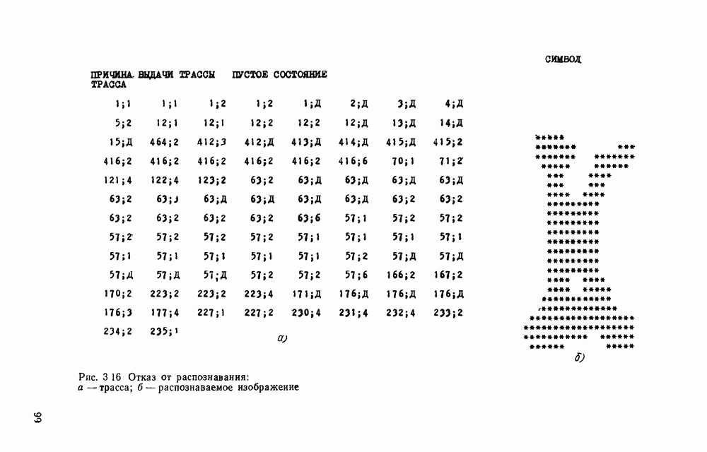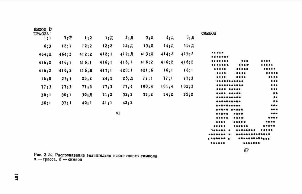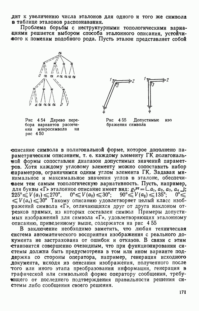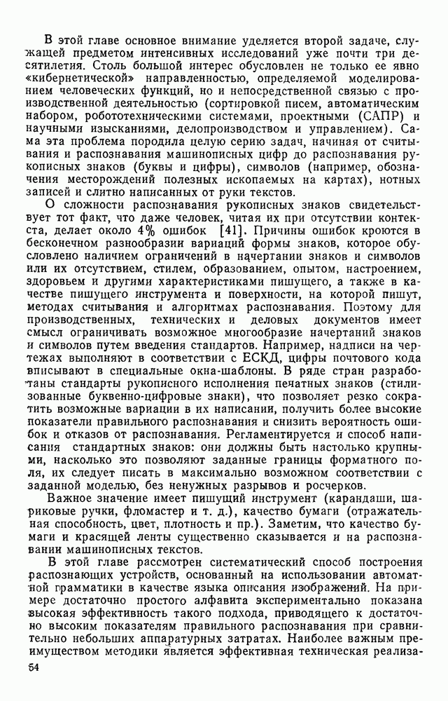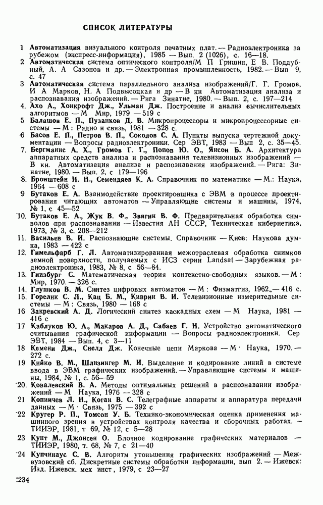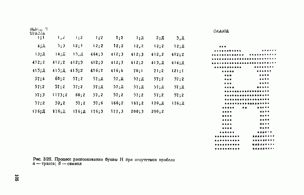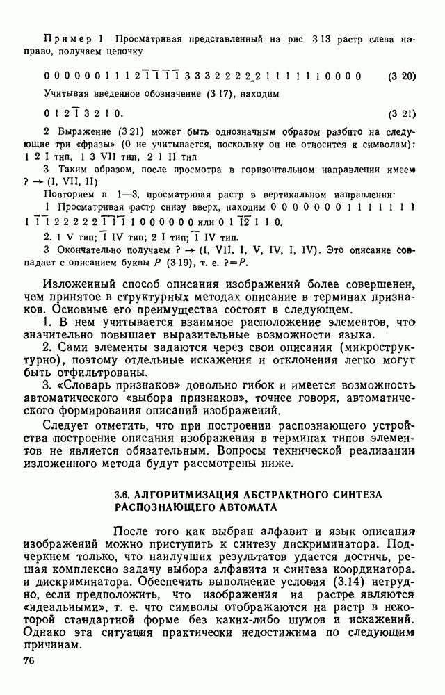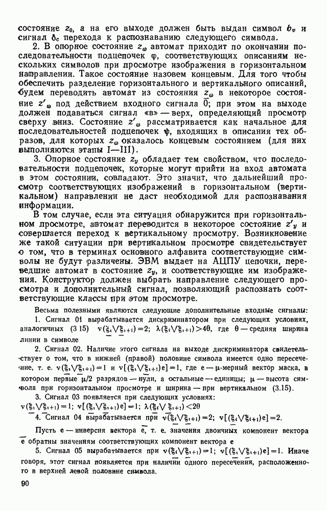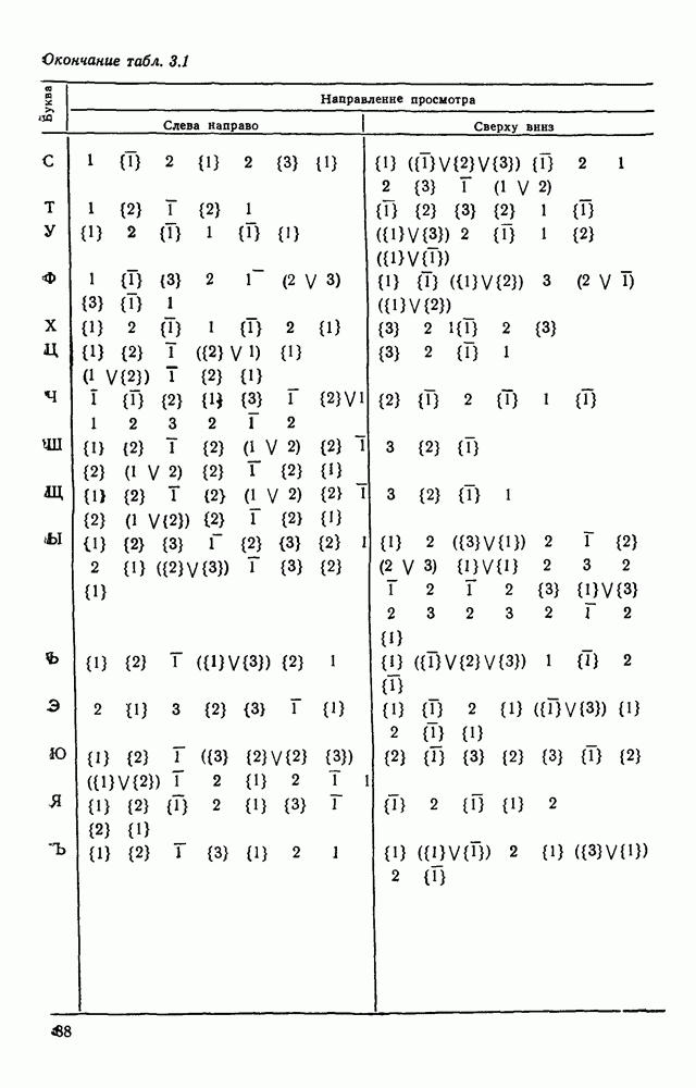 3.9. ЭКСПЕРИМЕНТАЛЬНАЯ ПРОВЕРКА РАБОТЫ СИСТЕМЫДля определения эффективности разработанного метода распознавания, достоверности и скорости распознавания разработана система программ, полностью моделирующая его работу. Процесс моделирования начинается с блока предварительной обработки, затем моделируется дискриминатор и координатор. В памяти ЭВМ (в координаторе) под действием сигналов с дискриминатора фиксируется последовательность переходов из одного состояния в другое. После очередного просмотра генерируется специальный сигнал, по которому либо выдается выходной символ, либо совершается переход на следующий просмотр. Один из этих просмотров обязательно заканчивается выдачей распознанного символа или отказом от распознавания, если в результате шумов и искажений описания различных символов совпадают или встречается неизвестный автомату символ. В последнем случае автомат либо выдает те символы, выбор между которыми он не может сделать, либо просто отказывается распознать данный символ. Вместе с выдачей, из-за отсутствия соответствующего описания в обучающей выборке выходных символов автомата система выдает трассу — последовательность входных сигналов и состояний координатора при распознавании данного символа, а также изображение символа (рис. 3.15). Возможны два режима работы системы. В первом — трасса и распознаваемый символ всегда выдаются на дисплей или АЦПУ, во втором — только в том случае, когда символ распознается неверно или один из элементов таблицы переходов или выходов не определен, что соответствует полному отказу от распознавания. Одна из ситуаций, в которой не определен элемент таблицы переходов, представлена на рис. 3.16. Разделенная точкой с запятой пара цифр обозначает соответственно входной символ и состояние, в которое переходит автомат под его воздействием; символом Д обозначен входной сигнал «длинное пересечение», а символом 8 — сигнал окончания просмотра. Ситуации, представленные на рис. 3.17 и 3.18, соответствуют случаям, когда не определены элементы таблиц переходов — выходов. (см. скан) Рис. 3.15. Пример работы системы: а — трасса; б — распознаваемое изображение (см. скан) Рис. 3.16 Отказ от распознавания: а — трасса; б — распознаваемое изображение (см. скан) Рис. 3.17. Отказ от распознавания: а — трасса; б — распознаваемое изображение (см. скан) Рис. 3.18. Отказ от распознавания: а - трасса; б — распознаваемое изображение (см. скан) Рис. 3.19. Распознавание букв 3 и Э, не различимых при вертикальном просмотре: а — трасса; б — символ (см. скан) Рис. 3.20. Распознавание букв Р и Ч, не различимых при вертикальном просмотре. а — трасса; б — символ (см. скан) Рис. 3.21. Пример распознавания существенно искаженного символа (см. скан) Рис. 3.22. Процесс распознавании буквы Н при отсутствии пробела а — трасса; б — символ (см. скан) Рис. 3.23. Процесс распознавания буквы Ч при отсутствии пробела; а — трасса; б — симрол (см. скан) Рис. 3.24. Распознавание значительно искаженного символа. а — трасса, б — символ Результаты вертикального просмотра (рис. 3.19 и 3 20) иллюстрируют ход процесса моделирования. Из них следует, что буквы З, Э и Р, Ч при вертикальном просмотре не различимы На рис. 3.21-3.24 приведены примеры, показывающие, что программа распознает символы, значительно отличающиеся от эталонных. Для более глубокого изучения возможностей мет