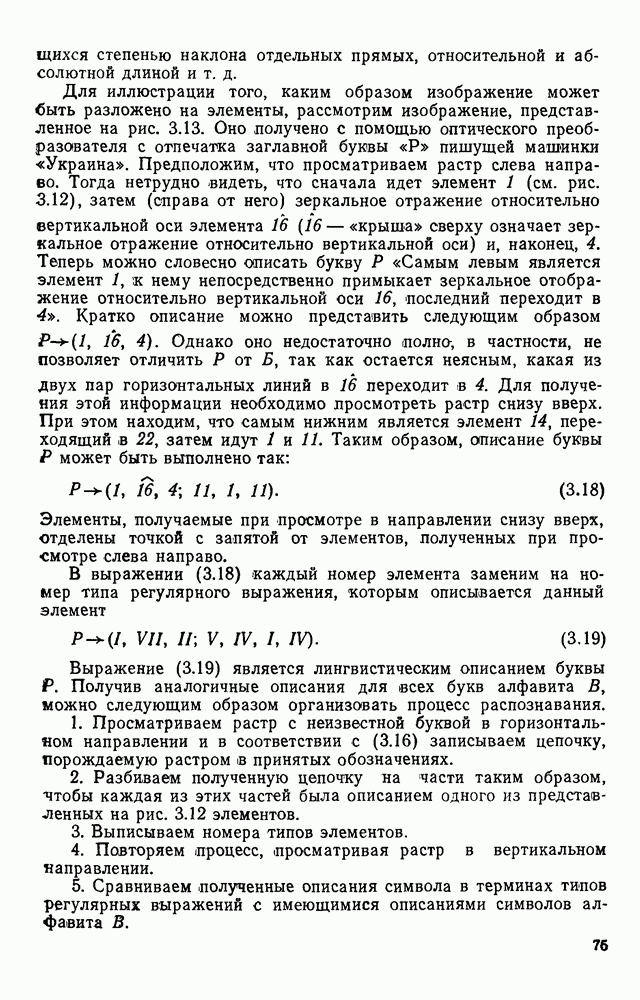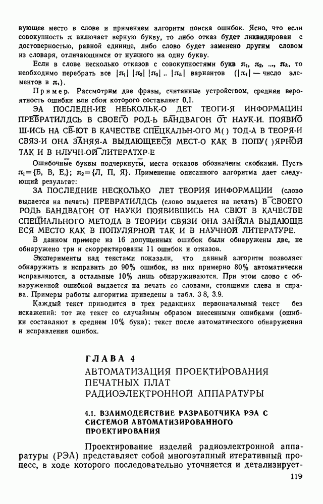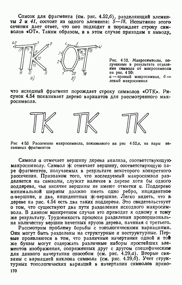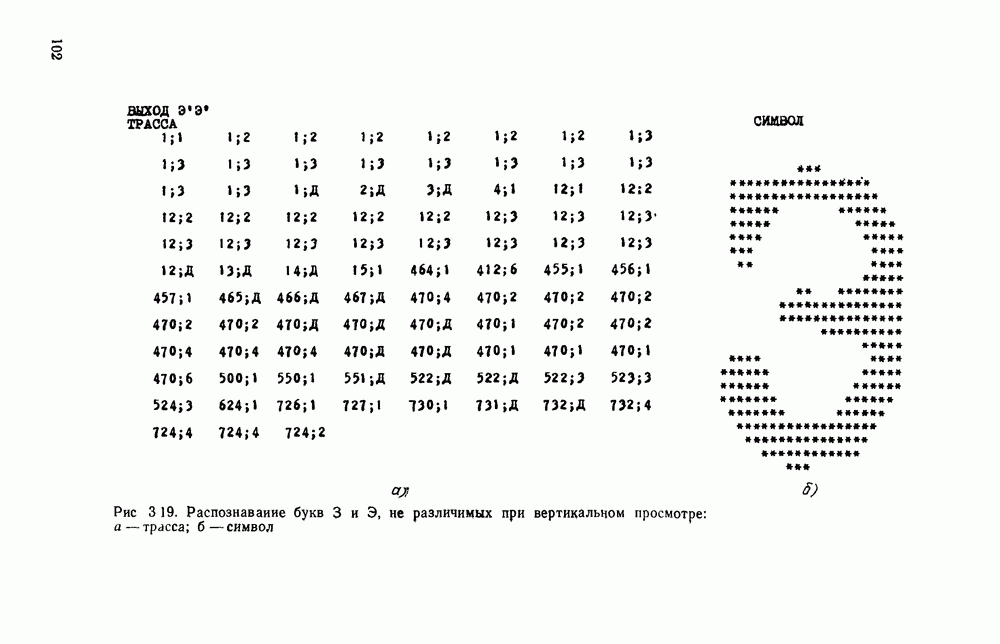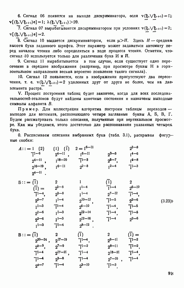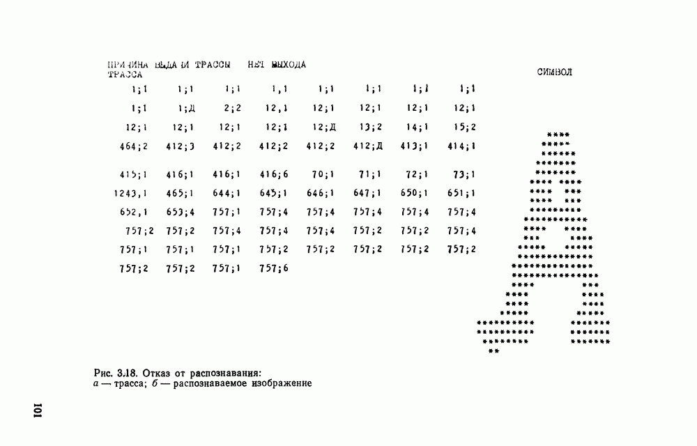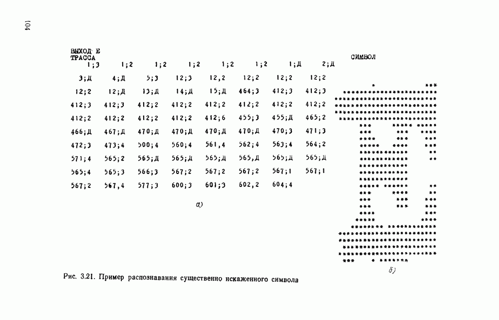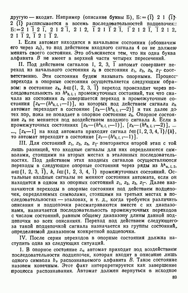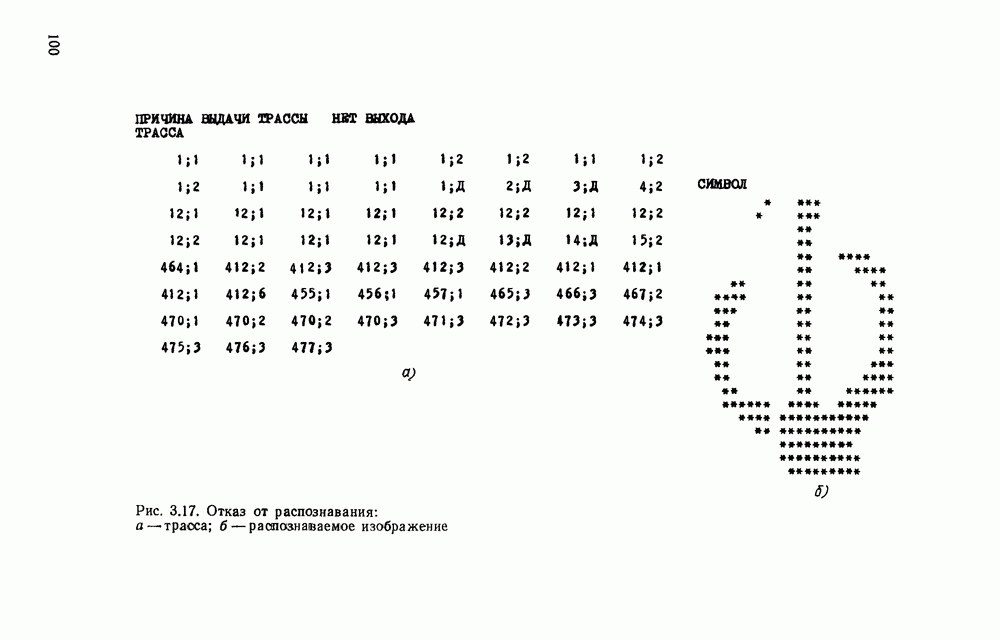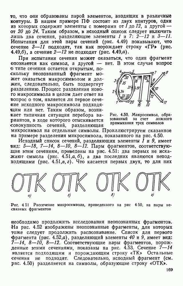 3.9. ЭКСПЕРИМЕНТАЛЬНАЯ ПРОВЕРКА РАБОТЫ СИСТЕМЫДля определения эффективности разработанного метода распознавания, достоверности и скорости распознавания разработана система программ, полностью моделирующая его работу. Процесс моделирования начинается с блока предварительной обработки, затем моделируется дискриминатор и координатор. В памяти ЭВМ (в координаторе) под действием сигналов с дискриминатора фиксируется последовательность переходов из одного состояния в другое. После очередного просмотра генерируется специальный сигнал, по которому либо выдается выходной символ, либо совершается переход на следующий просмотр. Один из этих просмотров обязательно заканчивается выдачей распознанного символа или отказом от распознавания, если в результате шумов и искажений описания различных символов совпадают или встречается неизвестный автомату символ. В последнем случае автомат либо выдает те символы, выбор между которыми он не может сделать, либо просто отказывается распознать данный символ. Вместе с выдачей, из-за отсутствия соответствующего описания в обучающей выборке выходных символов автомата система выдает трассу — последовательность входных сигналов и состояний координатора при распознавании данного символа, а также изображение символа (рис. 3.15). Возможны два режима работы системы. В первом — трасса и распознаваемый символ всегда выдаются на дисплей или АЦПУ, во втором — только в том случае, когда символ распознается неверно или один из элементов таблицы переходов или выходов не определен, что соответствует полному отказу от распознавания. Одна из ситуаций, в которой не определен элемент таблицы переходов, представлена на рис. 3.16. Разделенная точкой с запятой пара цифр обозначает соответственно входной символ и состояние, в которое переходит автомат под его воздействием; символом Д обозначен входной сигнал «длинное пересечение», а символом 8 — сигнал окончания просмотра. Ситуации, представленные на рис. 3.17 и 3.18, соответствуют случаям, когда не определены элементы таблиц переходов — выходов. (см. скан) Рис. 3.15. Пример работы системы: а — трасса; б — распознаваемое изображение (см. скан) Рис. 3.16 Отказ от распознавания: а — трасса; б — распознаваемое изображение (см. скан) Рис. 3.17. Отказ от распознавания: а — трасса; б — распознаваемое изображение (см. скан) Рис. 3.18. Отказ от распознавания: а - трасса; б — распознаваемое изображение (см. скан) Рис. 3.19. Распознавание букв 3 и Э, не различимых при вертикальном просмотре: а — трасса; б — символ (см. скан) Рис. 3.20. Распознавание букв Р и Ч, не различимых при вертикальном просмотре. а — трасса; б — символ (см. скан) Рис. 3.21. Пример распознавания существенно искаженного символа (см. скан) Рис. 3.22. Процесс распознавании буквы Н при отсутствии пробела а — трасса; б — символ (см. скан) Рис. 3.23. Процесс распознавания буквы Ч при отсутствии пробела; а — трасса; б — симрол (см. скан) Рис. 3.24. Распознавание значительно искаженного символа. а — трасса, б — символ Результаты вертикального просмотра (рис. 3.19 и 3 20) иллюстрируют ход процесса моделирования. Из них следует, что буквы З, Э и Р, Ч при вертикальном просмотре не различимы На рис. 3.21-3.24 приведены примеры, показывающие, что программа распознает символы, значительно отличающиеся от эталонных. Для более глубокого изучения возможностей мет