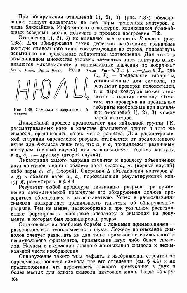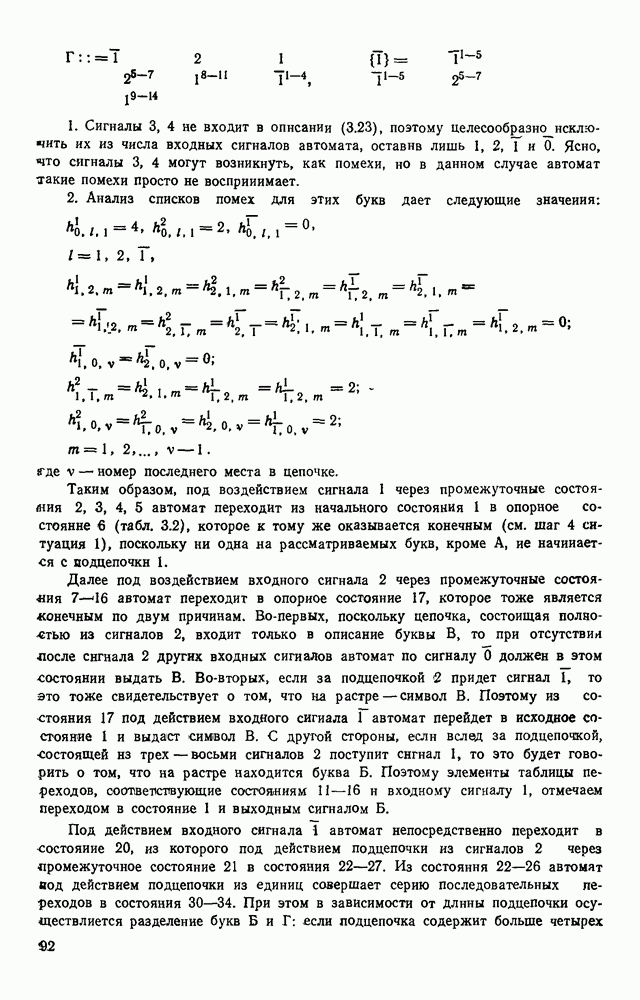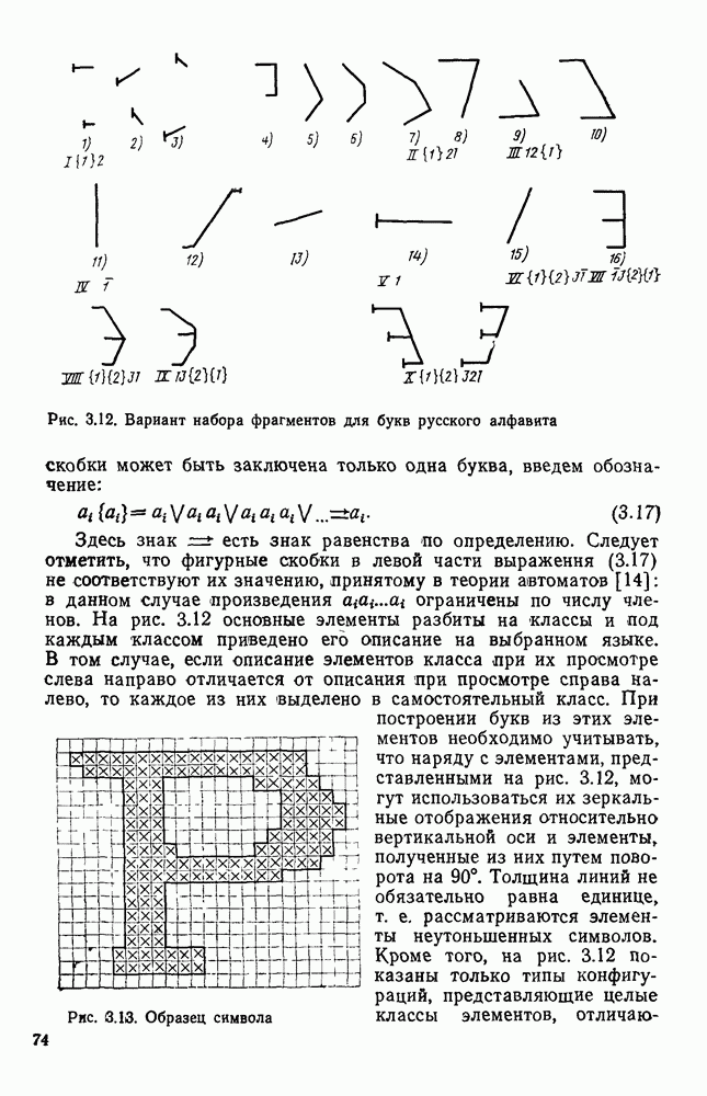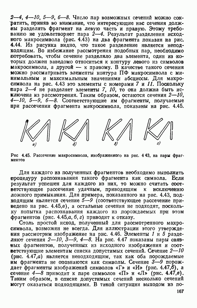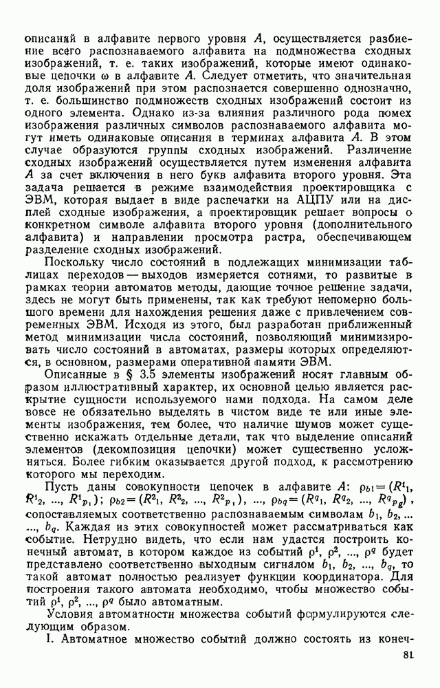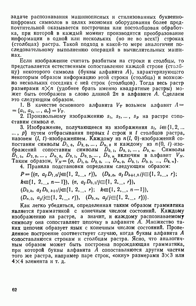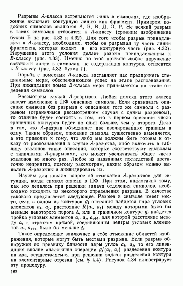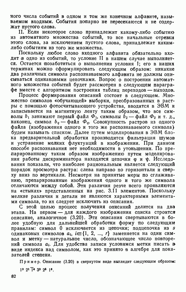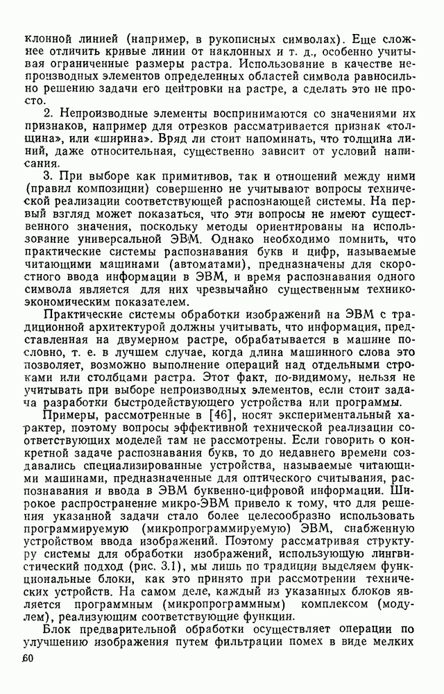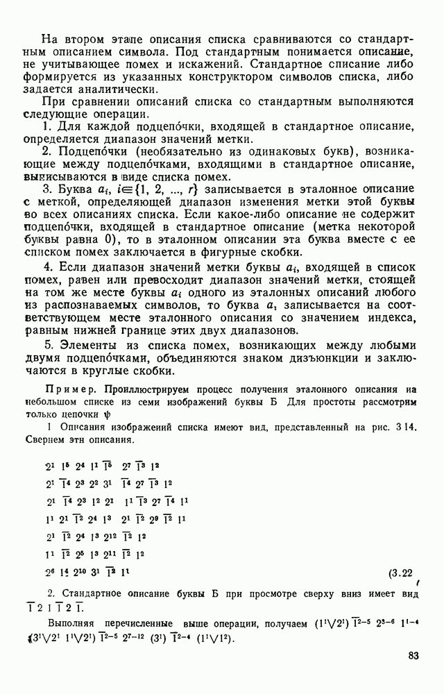 3.9. ЭКСПЕРИМЕНТАЛЬНАЯ ПРОВЕРКА РАБОТЫ СИСТЕМЫДля определения эффективности разработанного метода распознавания, достоверности и скорости распознавания разработана система программ, полностью моделирующая его работу. Процесс моделирования начинается с блока предварительной обработки, затем моделируется дискриминатор и координатор. В памяти ЭВМ (в координаторе) под действием сигналов с дискриминатора фиксируется последовательность переходов из одного состояния в другое. После очередного просмотра генерируется специальный сигнал, по которому либо выдается выходной символ, либо совершается переход на следующий просмотр. Один из этих просмотров обязательно заканчивается выдачей распознанного символа или отказом от распознавания, если в результате шумов и искажений описания различных символов совпадают или встречается неизвестный автомату символ. В последнем случае автомат либо выдает те символы, выбор между которыми он не может сделать, либо просто отказывается распознать данный символ. Вместе с выдачей, из-за отсутствия соответствующего описания в обучающей выборке выходных символов автомата система выдает трассу — последовательность входных сигналов и состояний координатора при распознавании данного символа, а также изображение символа (рис. 3.15). Возможны два режима работы системы. В первом — трасса и распознаваемый символ всегда выдаются на дисплей или АЦПУ, во втором — только в том случае, когда символ распознается неверно или один из элементов таблицы переходов или выходов не определен, что соответствует полному отказу от распознавания. Одна из ситуаций, в которой не определен элемент таблицы переходов, представлена на рис. 3.16. Разделенная точкой с запятой пара цифр обозначает соответственно входной символ и состояние, в которое переходит автомат под его воздействием; символом Д обозначен входной сигнал «длинное пересечение», а символом 8 — сигнал окончания просмотра. Ситуации, представленные на рис. 3.17 и 3.18, соответствуют случаям, когда не определены элементы таблиц переходов — выходов. (см. скан) Рис. 3.15. Пример работы системы: а — трасса; б — распознаваемое изображение (см. скан) Рис. 3.16 Отказ от распознавания: а — трасса; б — распознаваемое изображение (см. скан) Рис. 3.17. Отказ от распознавания: а — трасса; б — распознаваемое изображение (см. скан) Рис. 3.18. Отказ от распознавания: а - трасса; б — распознаваемое изображение (см. скан) Рис. 3.19. Распознавание букв 3 и Э, не различимых при вертикальном просмотре: а — трасса; б — символ (см. скан) Рис. 3.20. Распознавание букв Р и Ч, не различимых при вертикальном просмотре. а — трасса; б — символ (см. скан) Рис. 3.21. Пример распознавания существенно искаженного символа (см. скан) Рис. 3.22. Процесс распознавании буквы Н при отсутствии пробела а — трасса; б — символ (см. скан) Рис. 3.23. Процесс распознавания буквы Ч при отсутствии пробела; а — трасса; б — симрол (см. скан) Рис. 3.24. Распознавание значительно искаженного символа. а — трасса, б — символ Результаты вертикального просмотра (рис. 3.19 и 3 20) иллюстрируют ход процесса моделирования. Из них следует, что буквы З, Э и Р, Ч при вертикальном просмотре не различимы На рис. 3.21-3.24 приведены примеры, показывающие, что программа распознает символы, значительно отличающиеся от эталонных. Для более глубокого изучения возможностей мет