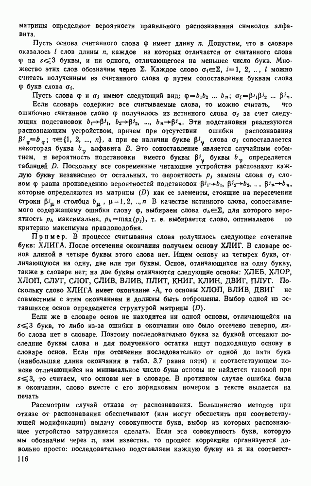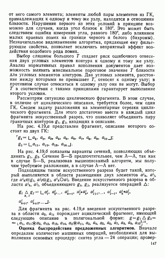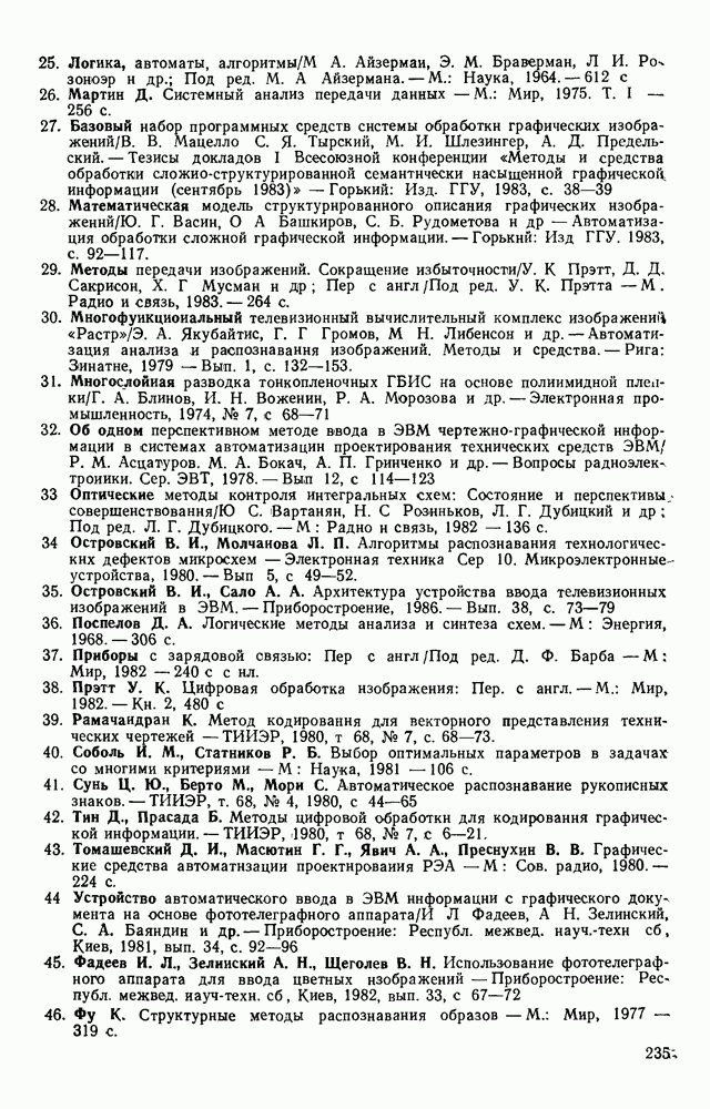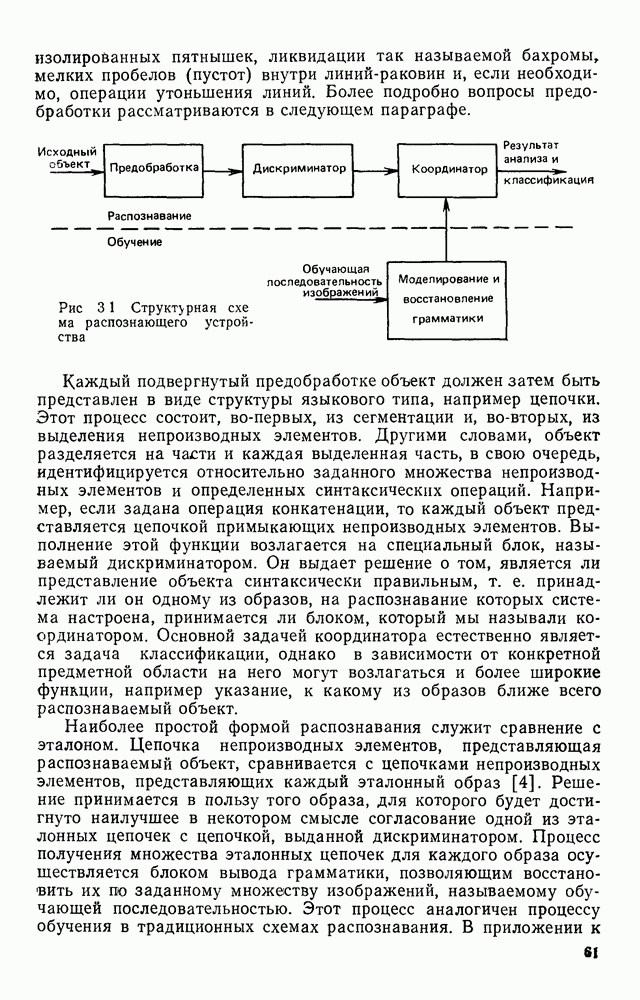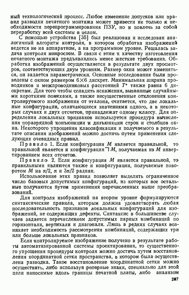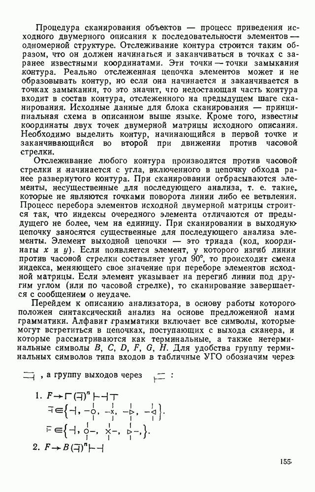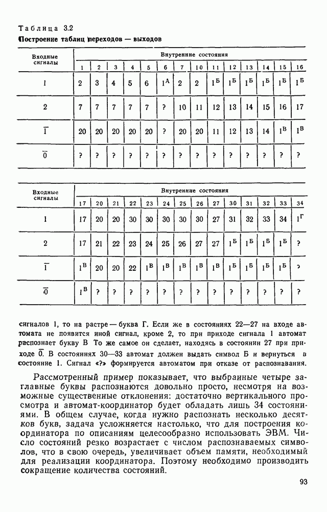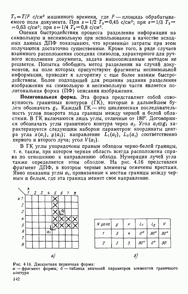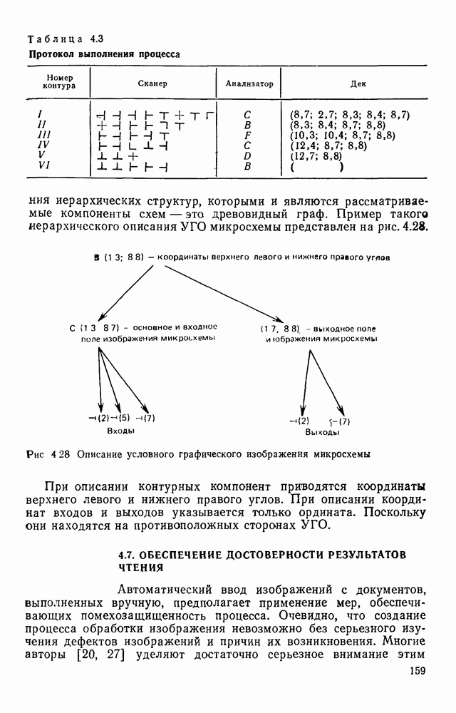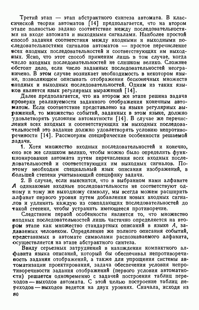 3.9. ЭКСПЕРИМЕНТАЛЬНАЯ ПРОВЕРКА РАБОТЫ СИСТЕМЫДля определения эффективности разработанного метода распознавания, достоверности и скорости распознавания разработана система программ, полностью моделирующая его работу. Процесс моделирования начинается с блока предварительной обработки, затем моделируется дискриминатор и координатор. В памяти ЭВМ (в координаторе) под действием сигналов с дискриминатора фиксируется последовательность переходов из одного состояния в другое. После очередного просмотра генерируется специальный сигнал, по которому либо выдается выходной символ, либо совершается переход на следующий просмотр. Один из этих просмотров обязательно заканчивается выдачей распознанного символа или отказом от распознавания, если в результате шумов и искажений описания различных символов совпадают или встречается неизвестный автомату символ. В последнем случае автомат либо выдает те символы, выбор между которыми он не может сделать, либо просто отказывается распознать данный символ. Вместе с выдачей, из-за отсутствия соответствующего описания в обучающей выборке выходных символов автомата система выдает трассу — последовательность входных сигналов и состояний координатора при распознавании данного символа, а также изображение символа (рис. 3.15). Возможны два режима работы системы. В первом — трасса и распознаваемый символ всегда выдаются на дисплей или АЦПУ, во втором — только в том случае, когда символ распознается неверно или один из элементов таблицы переходов или выходов не определен, что соответствует полному отказу от распознавания. Одна из ситуаций, в которой не определен элемент таблицы переходов, представлена на рис. 3.16. Разделенная точкой с запятой пара цифр обозначает соответственно входной символ и состояние, в которое переходит автомат под его воздействием; символом Д обозначен входной сигнал «длинное пересечение», а символом 8 — сигнал окончания просмотра. Ситуации, представленные на рис. 3.17 и 3.18, соответствуют случаям, когда не определены элементы таблиц переходов — выходов. (см. скан) Рис. 3.15. Пример работы системы: а — трасса; б — распознаваемое изображение (см. скан) Рис. 3.16 Отказ от распознавания: а — трасса; б — распознаваемое изображение (см. скан) Рис. 3.17. Отказ от распознавания: а — трасса; б — распознаваемое изображение (см. скан) Рис. 3.18. Отказ от распознавания: а - трасса; б — распознаваемое изображение (см. скан) Рис. 3.19. Распознавание букв 3 и Э, не различимых при вертикальном просмотре: а — трасса; б — символ (см. скан) Рис. 3.20. Распознавание букв Р и Ч, не различимых при вертикальном просмотре. а — трасса; б — символ (см. скан) Рис. 3.21. Пример распознавания существенно искаженного символа (см. скан) Рис. 3.22. Процесс распознавании буквы Н при отсутствии пробела а — трасса; б — символ (см. скан) Рис. 3.23. Процесс распознавания буквы Ч при отсутствии пробела; а — трасса; б — симрол (см. скан) Рис. 3.24. Распознавание значительно искаженного символа. а — трасса, б — символ Результаты вертикального просмотра (рис. 3.19 и 3 20) иллюстрируют ход процесса моделирования. Из них следует, что буквы З, Э и Р, Ч при вертикальном просмотре не различимы На рис. 3.21-3.24 приведены примеры, показывающие, что программа распознает символы, значительно отличающиеся от эталонных. Для более глубокого изучения возможностей мет