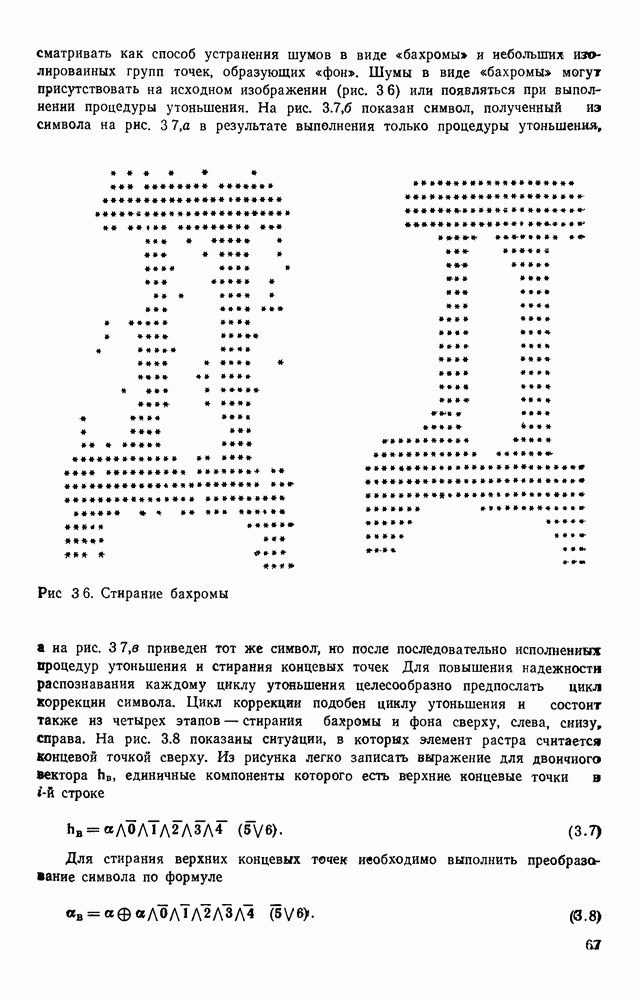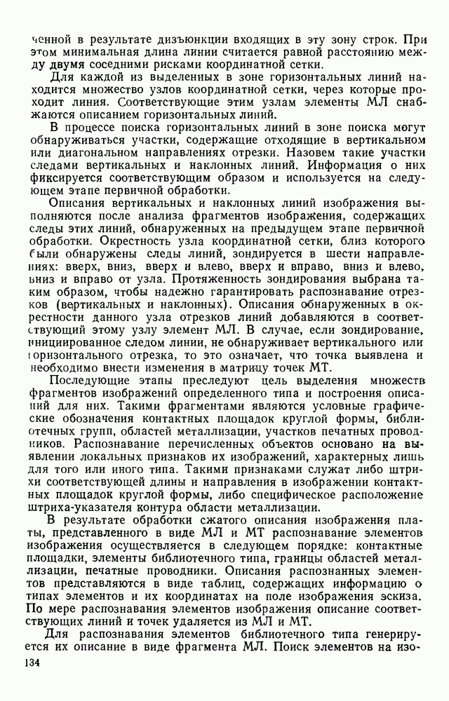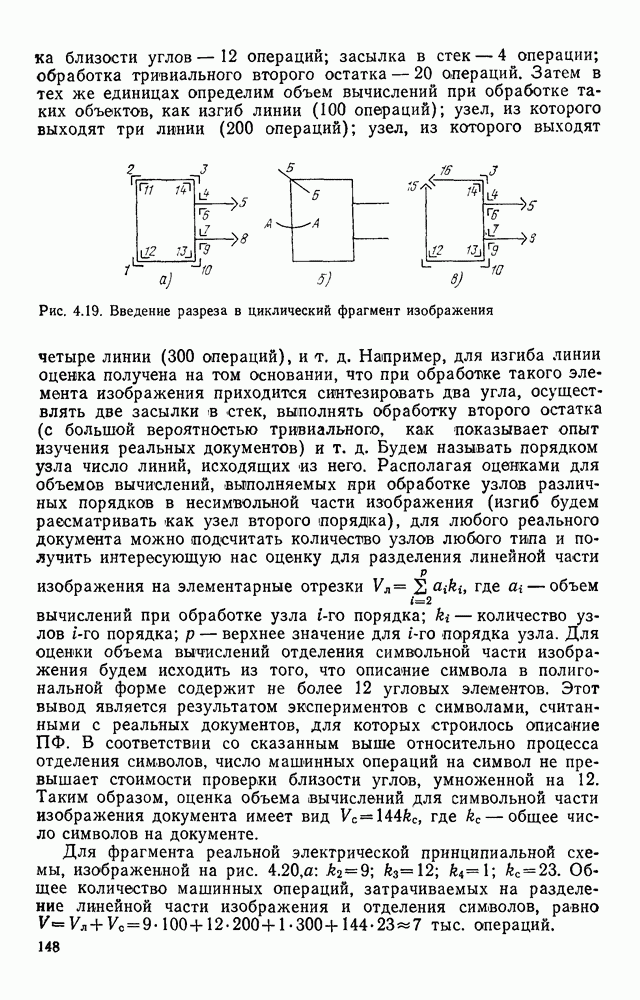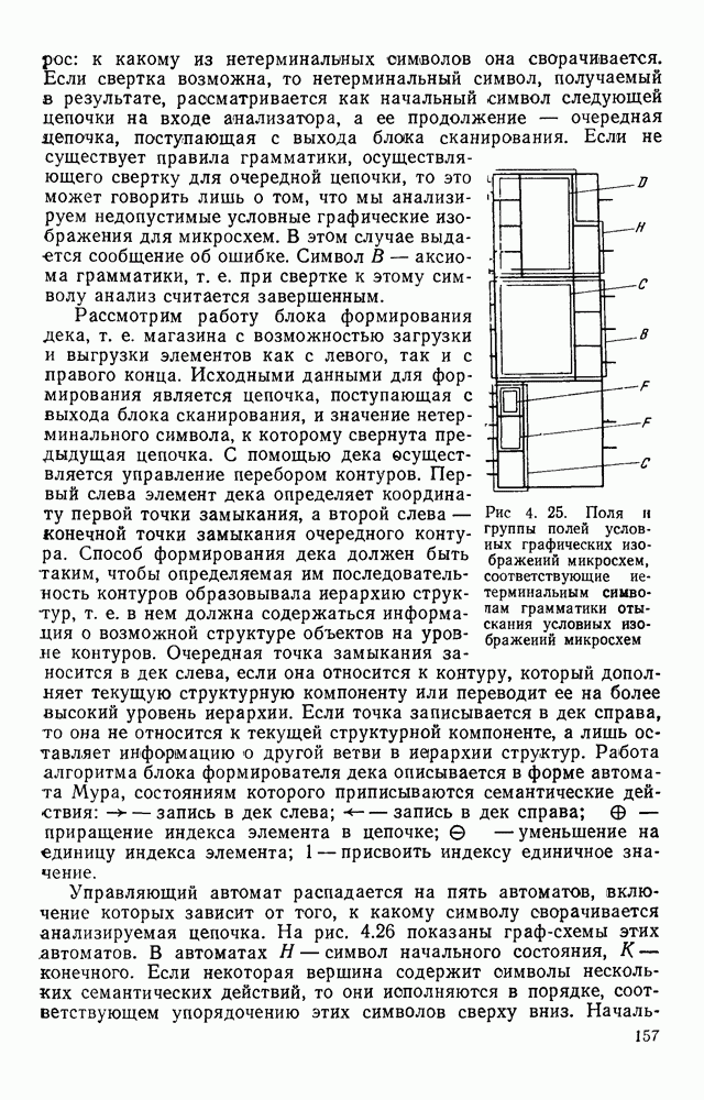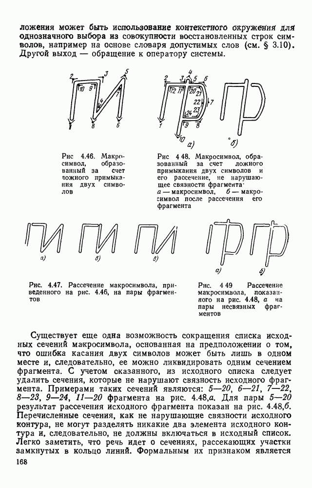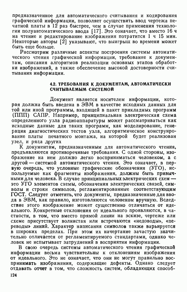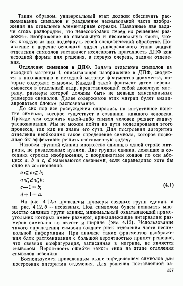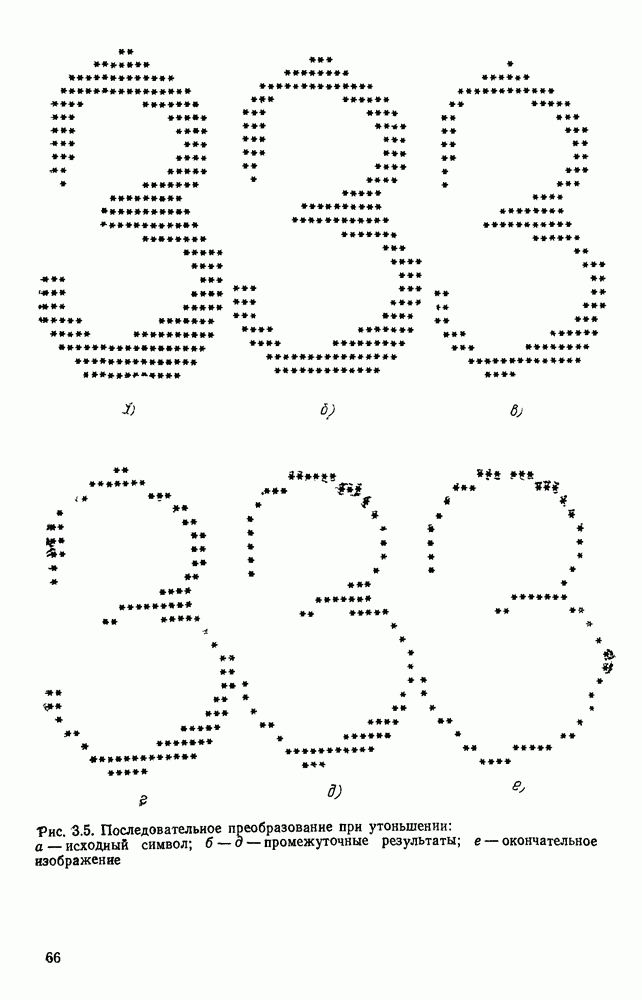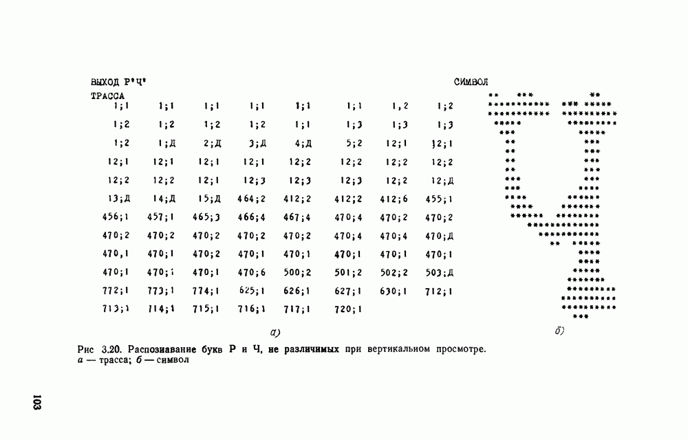 3.9. ЭКСПЕРИМЕНТАЛЬНАЯ ПРОВЕРКА РАБОТЫ СИСТЕМЫДля определения эффективности разработанного метода распознавания, достоверности и скорости распознавания разработана система программ, полностью моделирующая его работу. Процесс моделирования начинается с блока предварительной обработки, затем моделируется дискриминатор и координатор. В памяти ЭВМ (в координаторе) под действием сигналов с дискриминатора фиксируется последовательность переходов из одного состояния в другое. После очередного просмотра генерируется специальный сигнал, по которому либо выдается выходной символ, либо совершается переход на следующий просмотр. Один из этих просмотров обязательно заканчивается выдачей распознанного символа или отказом от распознавания, если в результате шумов и искажений описания различных символов совпадают или встречается неизвестный автомату символ. В последнем случае автомат либо выдает те символы, выбор между которыми он не может сделать, либо просто отказывается распознать данный символ. Вместе с выдачей, из-за отсутствия соответствующего описания в обучающей выборке выходных символов автомата система выдает трассу — последовательность входных сигналов и состояний координатора при распознавании данного символа, а также изображение символа (рис. 3.15). Возможны два режима работы системы. В первом — трасса и распознаваемый символ всегда выдаются на дисплей или АЦПУ, во втором — только в том случае, когда символ распознается неверно или один из элементов таблицы переходов или выходов не определен, что соответствует полному отказу от распознавания. Одна из ситуаций, в которой не определен элемент таблицы переходов, представлена на рис. 3.16. Разделенная точкой с запятой пара цифр обозначает соответственно входной символ и состояние, в которое переходит автомат под его воздействием; символом Д обозначен входной сигнал «длинное пересечение», а символом 8 — сигнал окончания просмотра. Ситуации, представленные на рис. 3.17 и 3.18, соответствуют случаям, когда не определены элементы таблиц переходов — выходов. (см. скан) Рис. 3.15. Пример работы системы: а — трасса; б — распознаваемое изображение (см. скан) Рис. 3.16 Отказ от распознавания: а — трасса; б — распознаваемое изображение (см. скан) Рис. 3.17. Отказ от распознавания: а — трасса; б — распознаваемое изображение (см. скан) Рис. 3.18. Отказ от распознавания: а - трасса; б — распознаваемое изображение (см. скан) Рис. 3.19. Распознавание букв 3 и Э, не различимых при вертикальном просмотре: а — трасса; б — символ (см. скан) Рис. 3.20. Распознавание букв Р и Ч, не различимых при вертикальном просмотре. а — трасса; б — символ (см. скан) Рис. 3.21. Пример распознавания существенно искаженного символа (см. скан) Рис. 3.22. Процесс распознавании буквы Н при отсутствии пробела а — трасса; б — символ (см. скан) Рис. 3.23. Процесс распознавания буквы Ч при отсутствии пробела; а — трасса; б — симрол (см. скан) Рис. 3.24. Распознавание значительно искаженного символа. а — трасса, б — символ Результаты вертикального просмотра (рис. 3.19 и 3 20) иллюстрируют ход процесса моделирования. Из них следует, что буквы З, Э и Р, Ч при вертикальном просмотре не различимы На рис. 3.21-3.24 приведены примеры, показывающие, что программа распознает символы, значительно отличающиеся от эталонных. Для более глубокого изучения возможностей мет