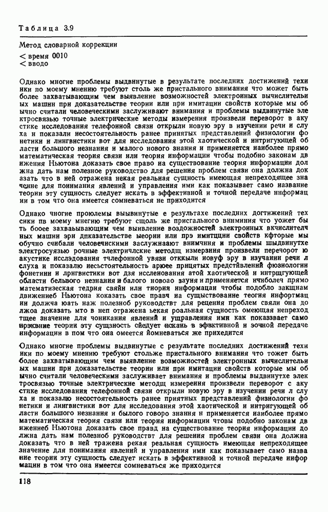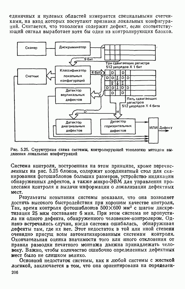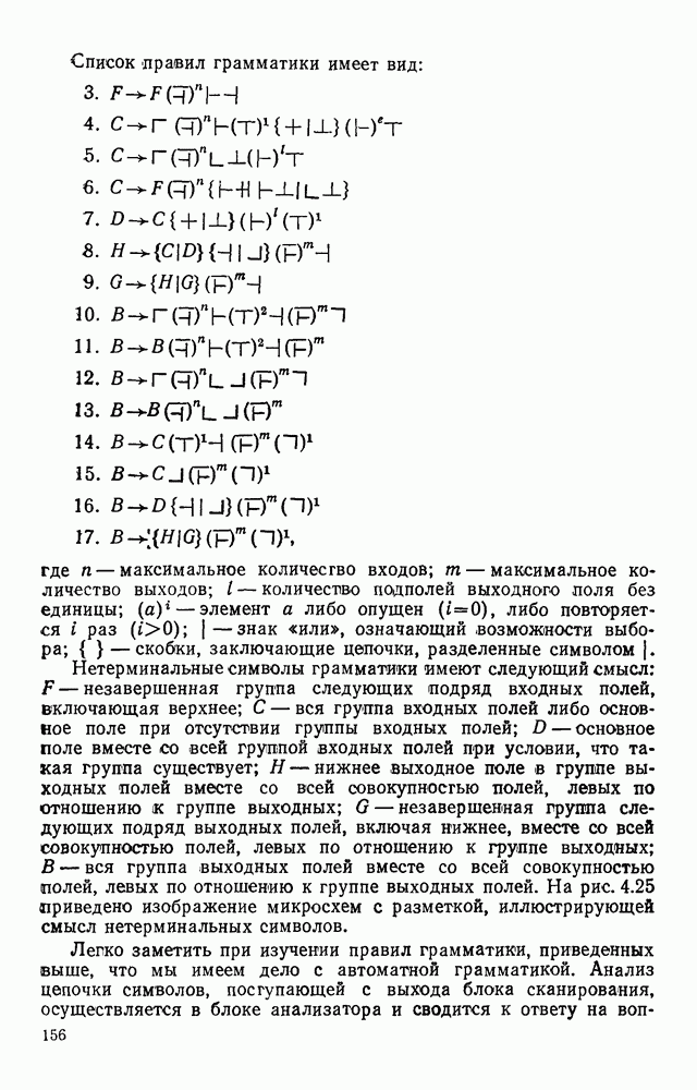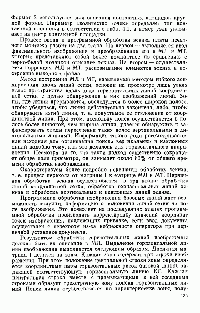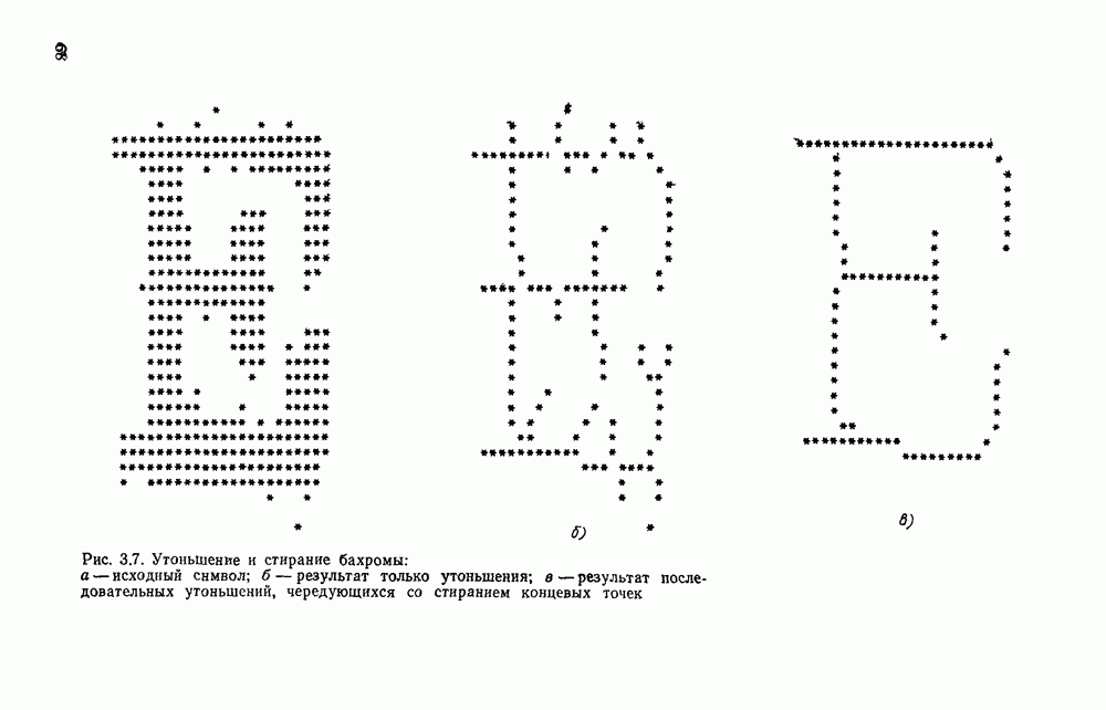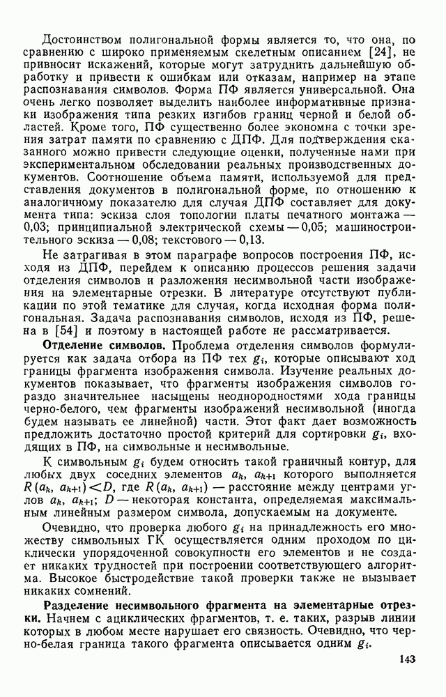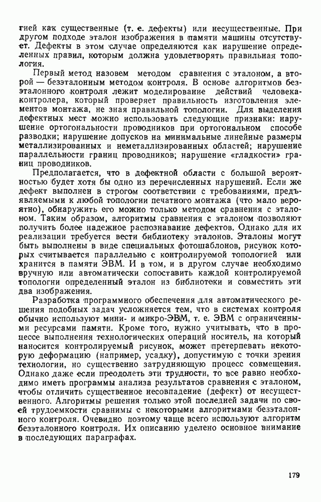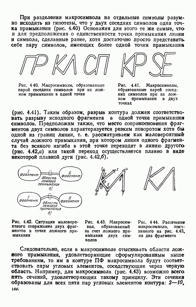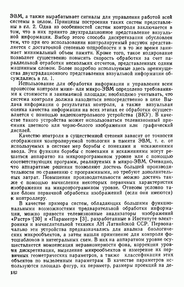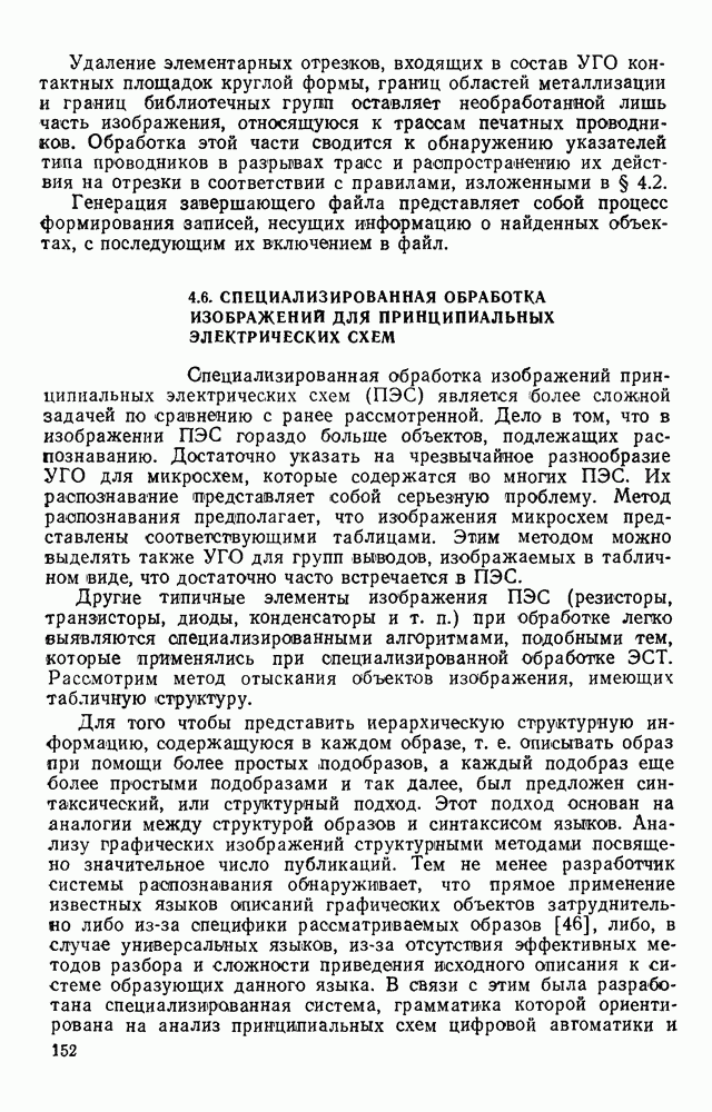 3.9. ЭКСПЕРИМЕНТАЛЬНАЯ ПРОВЕРКА РАБОТЫ СИСТЕМЫДля определения эффективности разработанного метода распознавания, достоверности и скорости распознавания разработана система программ, полностью моделирующая его работу. Процесс моделирования начинается с блока предварительной обработки, затем моделируется дискриминатор и координатор. В памяти ЭВМ (в координаторе) под действием сигналов с дискриминатора фиксируется последовательность переходов из одного состояния в другое. После очередного просмотра генерируется специальный сигнал, по которому либо выдается выходной символ, либо совершается переход на следующий просмотр. Один из этих просмотров обязательно заканчивается выдачей распознанного символа или отказом от распознавания, если в результате шумов и искажений описания различных символов совпадают или встречается неизвестный автомату символ. В последнем случае автомат либо выдает те символы, выбор между которыми он не может сделать, либо просто отказывается распознать данный символ. Вместе с выдачей, из-за отсутствия соответствующего описания в обучающей выборке выходных символов автомата система выдает трассу — последовательность входных сигналов и состояний координатора при распознавании данного символа, а также изображение символа (рис. 3.15). Возможны два режима работы системы. В первом — трасса и распознаваемый символ всегда выдаются на дисплей или АЦПУ, во втором — только в том случае, когда символ распознается неверно или один из элементов таблицы переходов или выходов не определен, что соответствует полному отказу от распознавания. Одна из ситуаций, в которой не определен элемент таблицы переходов, представлена на рис. 3.16. Разделенная точкой с запятой пара цифр обозначает соответственно входной символ и состояние, в которое переходит автомат под его воздействием; символом Д обозначен входной сигнал «длинное пересечение», а символом 8 — сигнал окончания просмотра. Ситуации, представленные на рис. 3.17 и 3.18, соответствуют случаям, когда не определены элементы таблиц переходов — выходов. (см. скан) Рис. 3.15. Пример работы системы: а — трасса; б — распознаваемое изображение (см. скан) Рис. 3.16 Отказ от распознавания: а — трасса; б — распознаваемое изображение (см. скан) Рис. 3.17. Отказ от распознавания: а — трасса; б — распознаваемое изображение (см. скан) Рис. 3.18. Отказ от распознавания: а - трасса; б — распознаваемое изображение (см. скан) Рис. 3.19. Распознавание букв 3 и Э, не различимых при вертикальном просмотре: а — трасса; б — символ (см. скан) Рис. 3.20. Распознавание букв Р и Ч, не различимых при вертикальном просмотре. а — трасса; б — символ (см. скан) Рис. 3.21. Пример распознавания существенно искаженного символа (см. скан) Рис. 3.22. Процесс распознавании буквы Н при отсутствии пробела а — трасса; б — символ (см. скан) Рис. 3.23. Процесс распознавания буквы Ч при отсутствии пробела; а — трасса; б — симрол (см. скан) Рис. 3.24. Распознавание значительно искаженного символа. а — трасса, б — символ Результаты вертикального просмотра (рис. 3.19 и 3 20) иллюстрируют ход процесса моделирования. Из них следует, что буквы З, Э и Р, Ч при вертикальном просмотре не различимы На рис. 3.21-3.24 приведены примеры, показывающие, что программа распознает символы, значительно отличающиеся от эталонных. Для более глубокого изучения возможностей мет