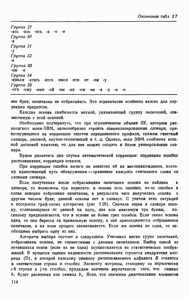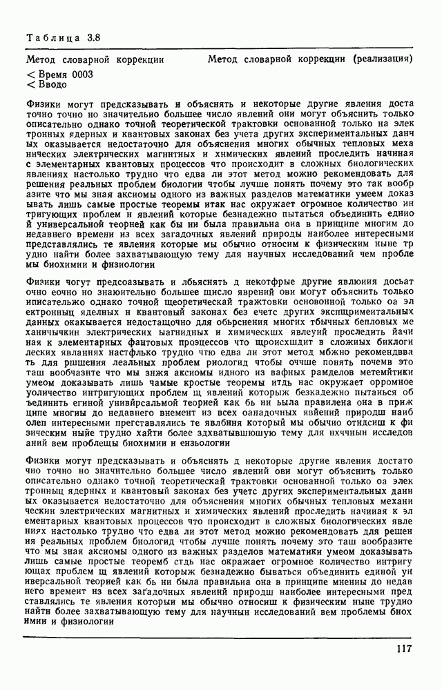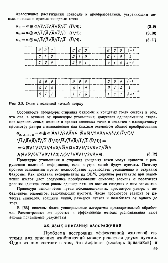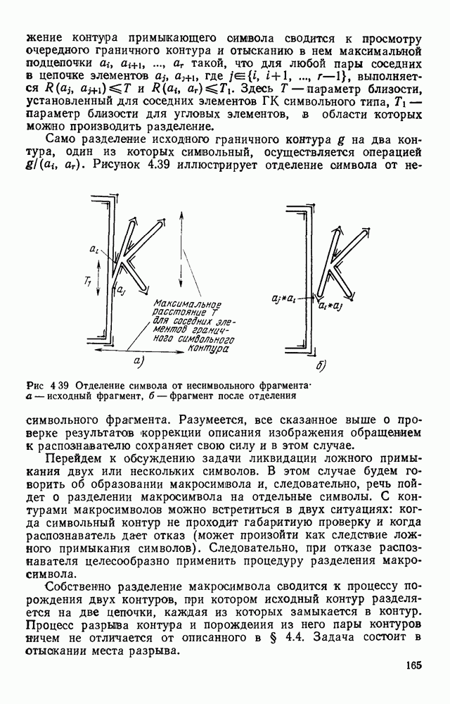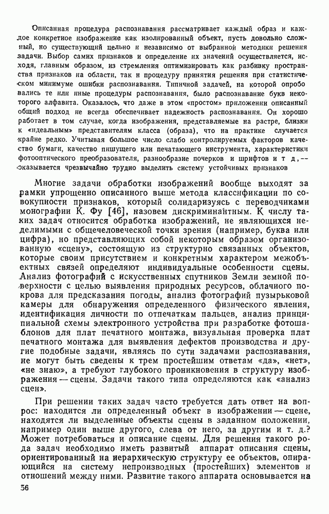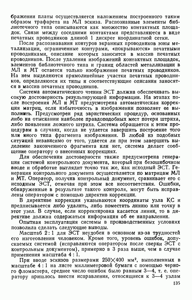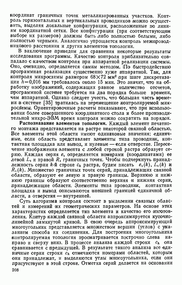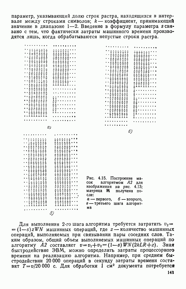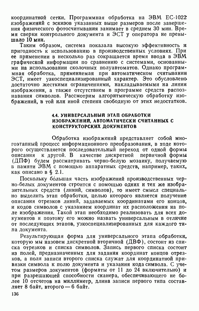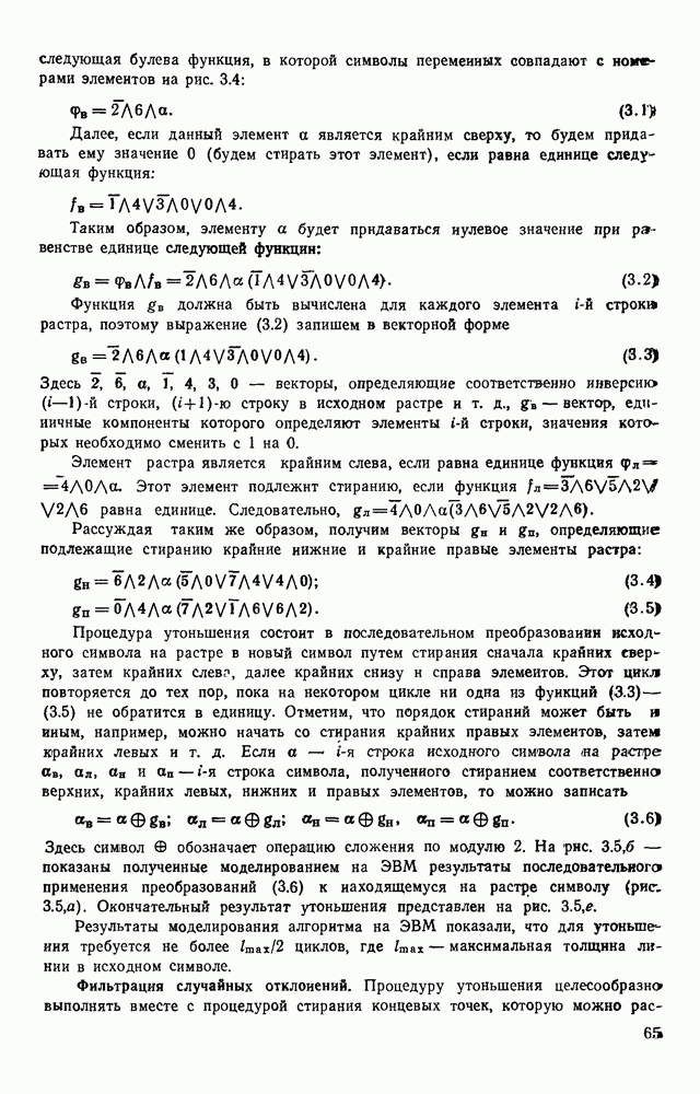 3.9. ЭКСПЕРИМЕНТАЛЬНАЯ ПРОВЕРКА РАБОТЫ СИСТЕМЫДля определения эффективности разработанного метода распознавания, достоверности и скорости распознавания разработана система программ, полностью моделирующая его работу. Процесс моделирования начинается с блока предварительной обработки, затем моделируется дискриминатор и координатор. В памяти ЭВМ (в координаторе) под действием сигналов с дискриминатора фиксируется последовательность переходов из одного состояния в другое. После очередного просмотра генерируется специальный сигнал, по которому либо выдается выходной символ, либо совершается переход на следующий просмотр. Один из этих просмотров обязательно заканчивается выдачей распознанного символа или отказом от распознавания, если в результате шумов и искажений описания различных символов совпадают или встречается неизвестный автомату символ. В последнем случае автомат либо выдает те символы, выбор между которыми он не может сделать, либо просто отказывается распознать данный символ. Вместе с выдачей, из-за отсутствия соответствующего описания в обучающей выборке выходных символов автомата система выдает трассу — последовательность входных сигналов и состояний координатора при распознавании данного символа, а также изображение символа (рис. 3.15). Возможны два режима работы системы. В первом — трасса и распознаваемый символ всегда выдаются на дисплей или АЦПУ, во втором — только в том случае, когда символ распознается неверно или один из элементов таблицы переходов или выходов не определен, что соответствует полному отказу от распознавания. Одна из ситуаций, в которой не определен элемент таблицы переходов, представлена на рис. 3.16. Разделенная точкой с запятой пара цифр обозначает соответственно входной символ и состояние, в которое переходит автомат под его воздействием; символом Д обозначен входной сигнал «длинное пересечение», а символом 8 — сигнал окончания просмотра. Ситуации, представленные на рис. 3.17 и 3.18, соответствуют случаям, когда не определены элементы таблиц переходов — выходов. (см. скан) Рис. 3.15. Пример работы системы: а — трасса; б — распознаваемое изображение (см. скан) Рис. 3.16 Отказ от распознавания: а — трасса; б — распознаваемое изображение (см. скан) Рис. 3.17. Отказ от распознавания: а — трасса; б — распознаваемое изображение (см. скан) Рис. 3.18. Отказ от распознавания: а - трасса; б — распознаваемое изображение (см. скан) Рис. 3.19. Распознавание букв 3 и Э, не различимых при вертикальном просмотре: а — трасса; б — символ (см. скан) Рис. 3.20. Распознавание букв Р и Ч, не различимых при вертикальном просмотре. а — трасса; б — символ (см. скан) Рис. 3.21. Пример распознавания существенно искаженного символа (см. скан) Рис. 3.22. Процесс распознавании буквы Н при отсутствии пробела а — трасса; б — символ (см. скан) Рис. 3.23. Процесс распознавания буквы Ч при отсутствии пробела; а — трасса; б — симрол (см. скан) Рис. 3.24. Распознавание значительно искаженного символа. а — трасса, б — символ Результаты вертикального просмотра (рис. 3.19 и 3 20) иллюстрируют ход процесса моделирования. Из них следует, что буквы З, Э и Р, Ч при вертикальном просмотре не различимы На рис. 3.21-3.24 приведены примеры, показывающие, что программа распознает символы, значительно отличающиеся от эталонных. Для более глубокого изучения возможностей мет