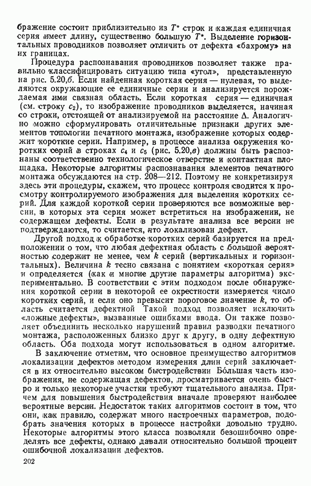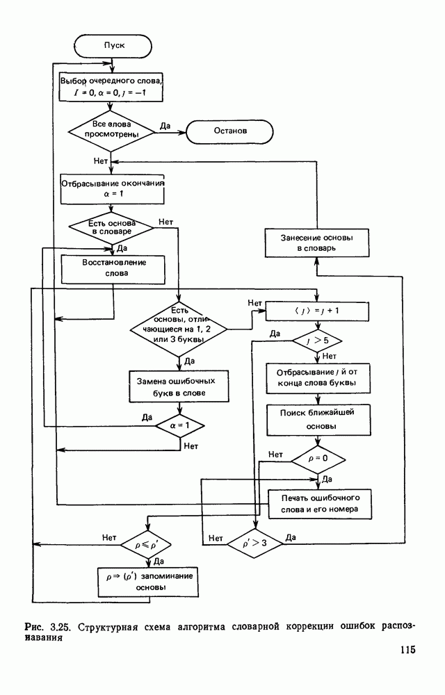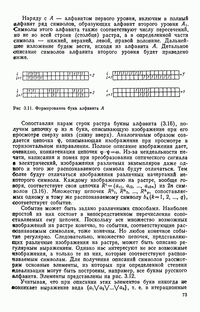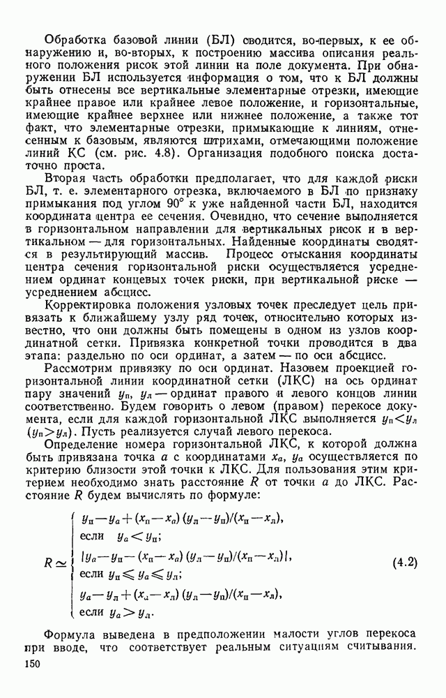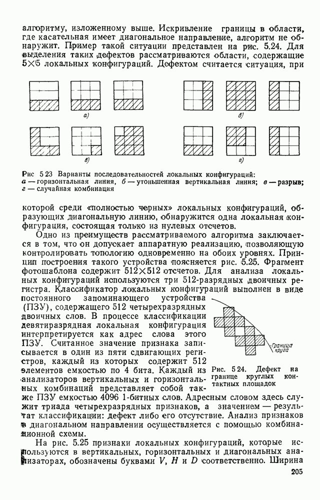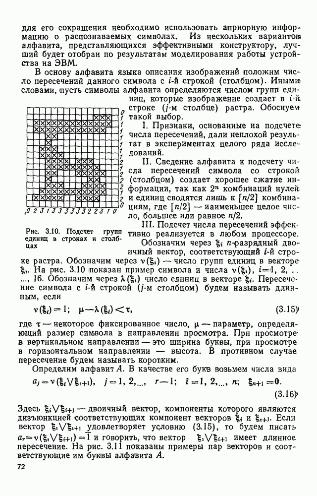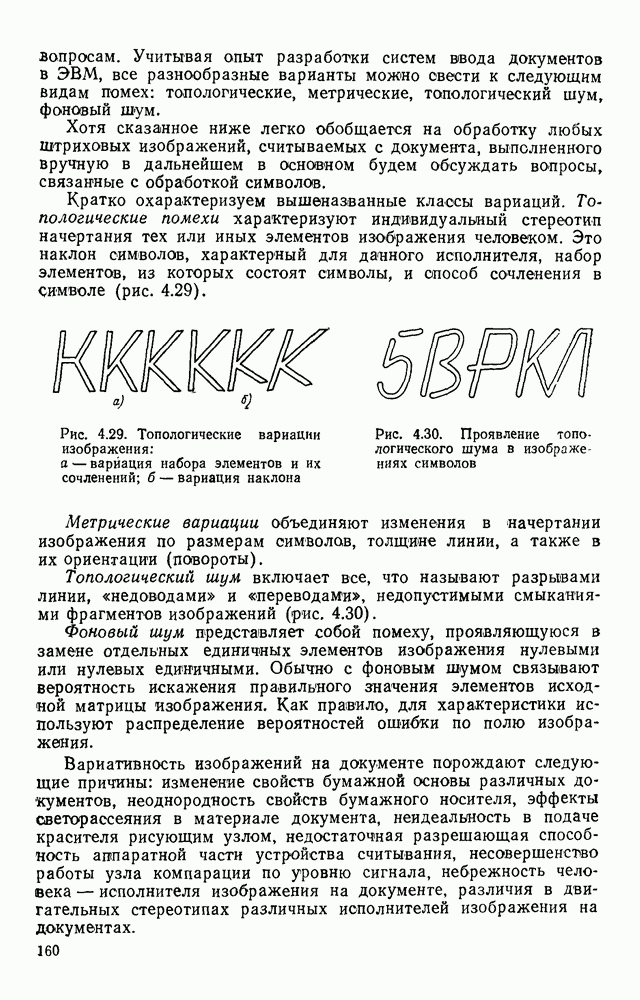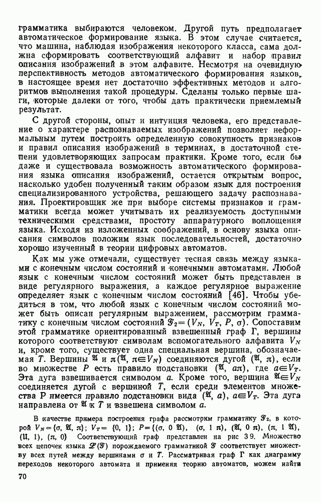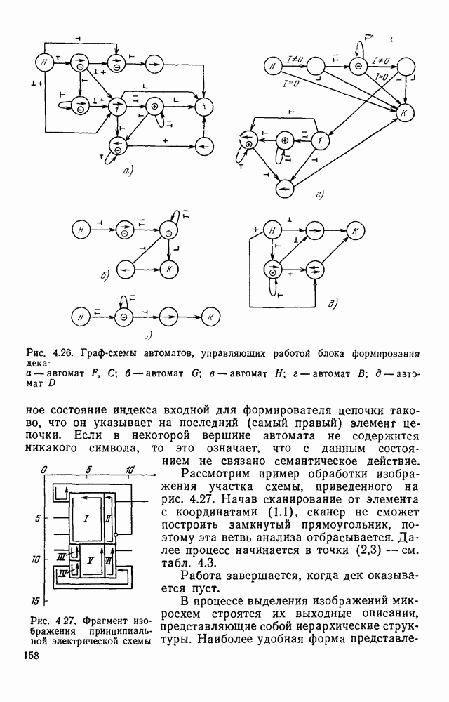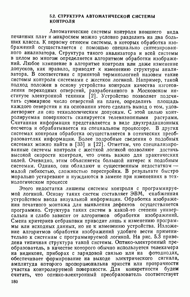3.9. ЭКСПЕРИМЕНТАЛЬНАЯ ПРОВЕРКА РАБОТЫ СИСТЕМЫДля определения эффективности разработанного метода распознавания, достоверности и скорости распознавания разработана система программ, полностью моделирующая его работу. Процесс моделирования начинается с блока предварительной обработки, затем моделируется дискриминатор и координатор. В памяти ЭВМ (в координаторе) под действием сигналов с дискриминатора фиксируется последовательность переходов из одного состояния в другое. После очередного просмотра генерируется специальный сигнал, по которому либо выдается выходной символ, либо совершается переход на следующий просмотр. Один из этих просмотров обязательно заканчивается выдачей распознанного символа или отказом от распознавания, если в результате шумов и искажений описания различных символов совпадают или встречается неизвестный автомату символ. В последнем случае автомат либо выдает те символы, выбор между которыми он не может сделать, либо просто отказывается распознать данный символ. Вместе с выдачей, из-за отсутствия соответствующего описания в обучающей выборке выходных символов автомата система выдает трассу — последовательность входных сигналов и состояний координатора при распознавании данного символа, а также изображение символа (рис. 3.15). Возможны два режима работы системы. В первом — трасса и распознаваемый символ всегда выдаются на дисплей или АЦПУ, во втором — только в том случае, когда символ распознается неверно или один из элементов таблицы переходов или выходов не определен, что соответствует полному отказу от распознавания. Одна из ситуаций, в которой не определен элемент таблицы переходов, представлена на рис. 3.16. Разделенная точкой с запятой пара цифр обозначает соответственно входной символ и состояние, в которое переходит автомат под его воздействием; символом Д обозначен входной сигнал «длинное пересечение», а символом 8 — сигнал окончания просмотра. Ситуации, представленные на рис. 3.17 и 3.18, соответствуют случаям, когда не определены элементы таблиц переходов — выходов. (см. скан) Рис. 3.15. Пример работы системы: а — трасса; б — распознаваемое изображение (см. скан) Рис. 3.16 Отказ от распознавания: а — трасса; б — распознаваемое изображение (см. скан) Рис. 3.17. Отказ от распознавания: а — трасса; б — распознаваемое изображение (см. скан) Рис. 3.18. Отказ от распознавания: а - трасса; б — распознаваемое изображение (см. скан) Рис. 3.19. Распознавание букв 3 и Э, не различимых при вертикальном просмотре: а — трасса; б — символ (см. скан) Рис. 3.20. Распознавание букв Р и Ч, не различимых при вертикальном просмотре. а — трасса; б — символ (см. скан) Рис. 3.21. Пример распознавания существенно искаженного символа (см. скан) Рис. 3.22. Процесс распознавании буквы Н при отсутствии пробела а — трасса; б — символ (см. скан) Рис. 3.23. Процесс распознавания буквы Ч при отсутствии пробела; а — трасса; б — симрол (см. скан) Рис. 3.24. Распознавание значительно искаженного символа. а — трасса, б — символ Результаты вертикального просмотра (рис. 3.19 и 3 20) иллюстрируют ход процесса моделирования. Из них следует, что буквы З, Э и Р, Ч при вертикальном просмотре не различимы На рис. 3.21-3.24 приведены примеры, показывающие, что программа распознает символы, значительно отличающиеся от эталонных. Для более глубокого изучения возможностей мет
