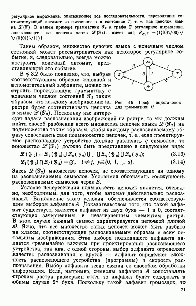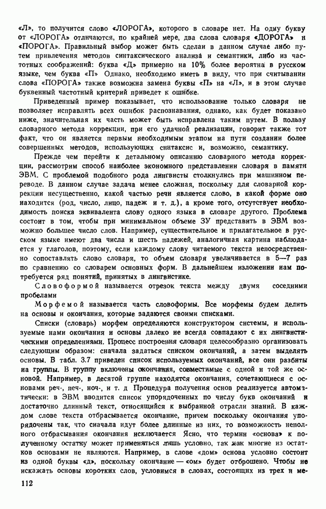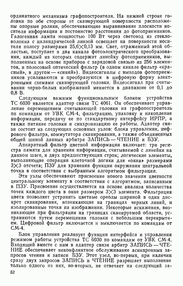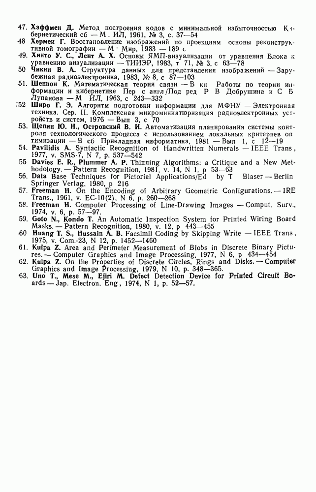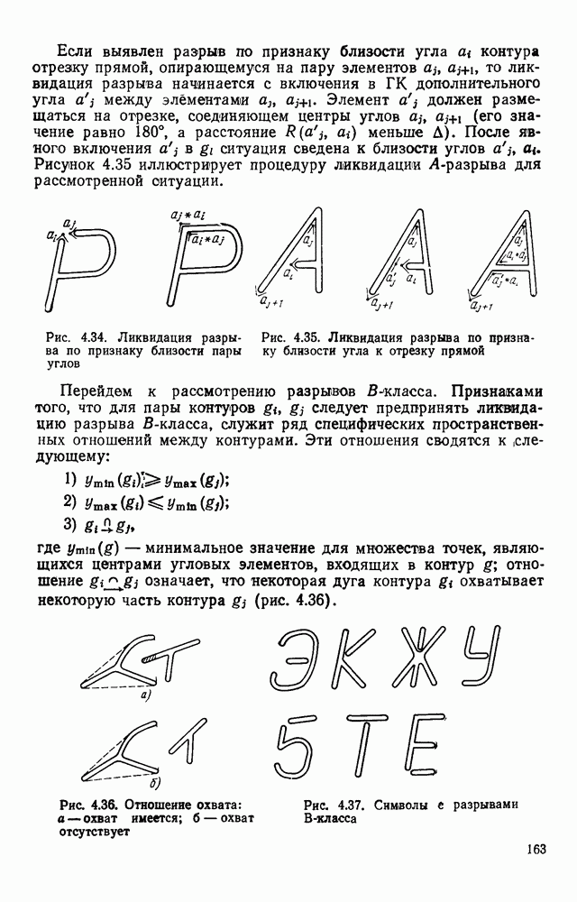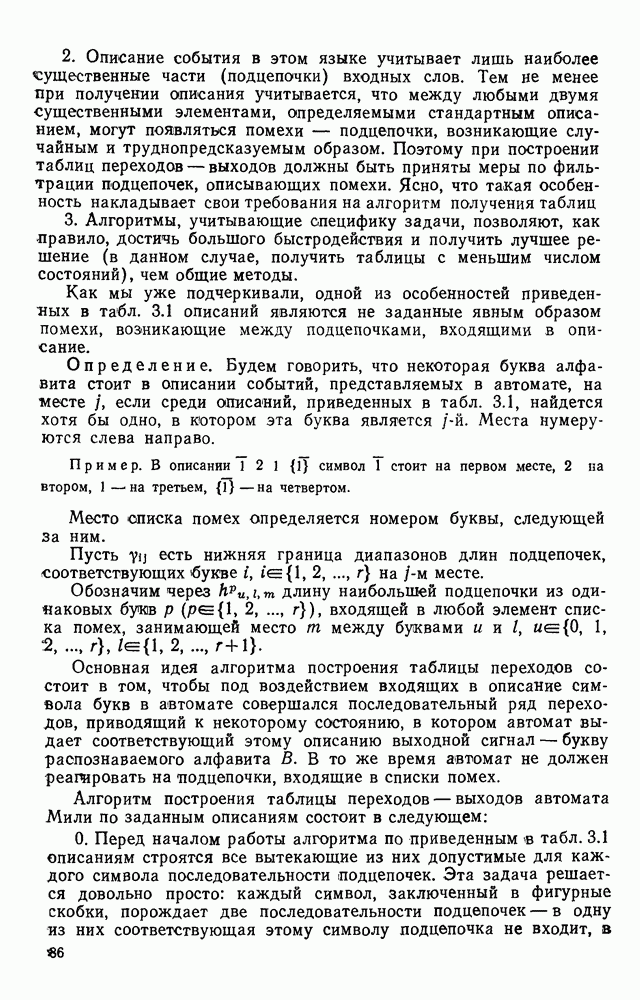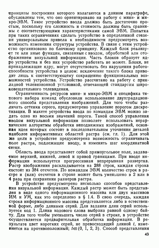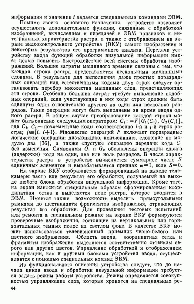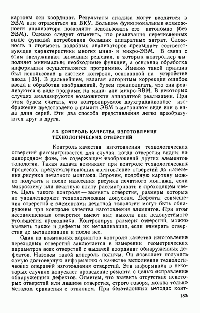 3.9. ЭКСПЕРИМЕНТАЛЬНАЯ ПРОВЕРКА РАБОТЫ СИСТЕМЫДля определения эффективности разработанного метода распознавания, достоверности и скорости распознавания разработана система программ, полностью моделирующая его работу. Процесс моделирования начинается с блока предварительной обработки, затем моделируется дискриминатор и координатор. В памяти ЭВМ (в координаторе) под действием сигналов с дискриминатора фиксируется последовательность переходов из одного состояния в другое. После очередного просмотра генерируется специальный сигнал, по которому либо выдается выходной символ, либо совершается переход на следующий просмотр. Один из этих просмотров обязательно заканчивается выдачей распознанного символа или отказом от распознавания, если в результате шумов и искажений описания различных символов совпадают или встречается неизвестный автомату символ. В последнем случае автомат либо выдает те символы, выбор между которыми он не может сделать, либо просто отказывается распознать данный символ. Вместе с выдачей, из-за отсутствия соответствующего описания в обучающей выборке выходных символов автомата система выдает трассу — последовательность входных сигналов и состояний координатора при распознавании данного символа, а также изображение символа (рис. 3.15). Возможны два режима работы системы. В первом — трасса и распознаваемый символ всегда выдаются на дисплей или АЦПУ, во втором — только в том случае, когда символ распознается неверно или один из элементов таблицы переходов или выходов не определен, что соответствует полному отказу от распознавания. Одна из ситуаций, в которой не определен элемент таблицы переходов, представлена на рис. 3.16. Разделенная точкой с запятой пара цифр обозначает соответственно входной символ и состояние, в которое переходит автомат под его воздействием; символом Д обозначен входной сигнал «длинное пересечение», а символом 8 — сигнал окончания просмотра. Ситуации, представленные на рис. 3.17 и 3.18, соответствуют случаям, когда не определены элементы таблиц переходов — выходов. (см. скан) Рис. 3.15. Пример работы системы: а — трасса; б — распознаваемое изображение (см. скан) Рис. 3.16 Отказ от распознавания: а — трасса; б — распознаваемое изображение (см. скан) Рис. 3.17. Отказ от распознавания: а — трасса; б — распознаваемое изображение (см. скан) Рис. 3.18. Отказ от распознавания: а - трасса; б — распознаваемое изображение (см. скан) Рис. 3.19. Распознавание букв 3 и Э, не различимых при вертикальном просмотре: а — трасса; б — символ (см. скан) Рис. 3.20. Распознавание букв Р и Ч, не различимых при вертикальном просмотре. а — трасса; б — символ (см. скан) Рис. 3.21. Пример распознавания существенно искаженного символа (см. скан) Рис. 3.22. Процесс распознавании буквы Н при отсутствии пробела а — трасса; б — символ (см. скан) Рис. 3.23. Процесс распознавания буквы Ч при отсутствии пробела; а — трасса; б — симрол (см. скан) Рис. 3.24. Распознавание значительно искаженного символа. а — трасса, б — символ Результаты вертикального просмотра (рис. 3.19 и 3 20) иллюстрируют ход процесса моделирования. Из них следует, что буквы З, Э и Р, Ч при вертикальном просмотре не различимы На рис. 3.21-3.24 приведены примеры, показывающие, что программа распознает символы, значительно отличающиеся от эталонных. Для более глубокого изучения возможностей мет