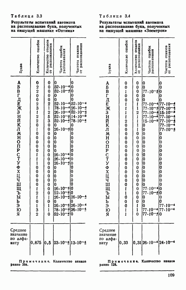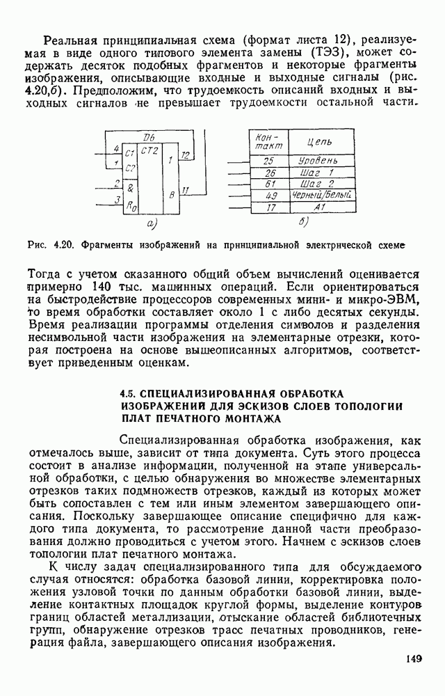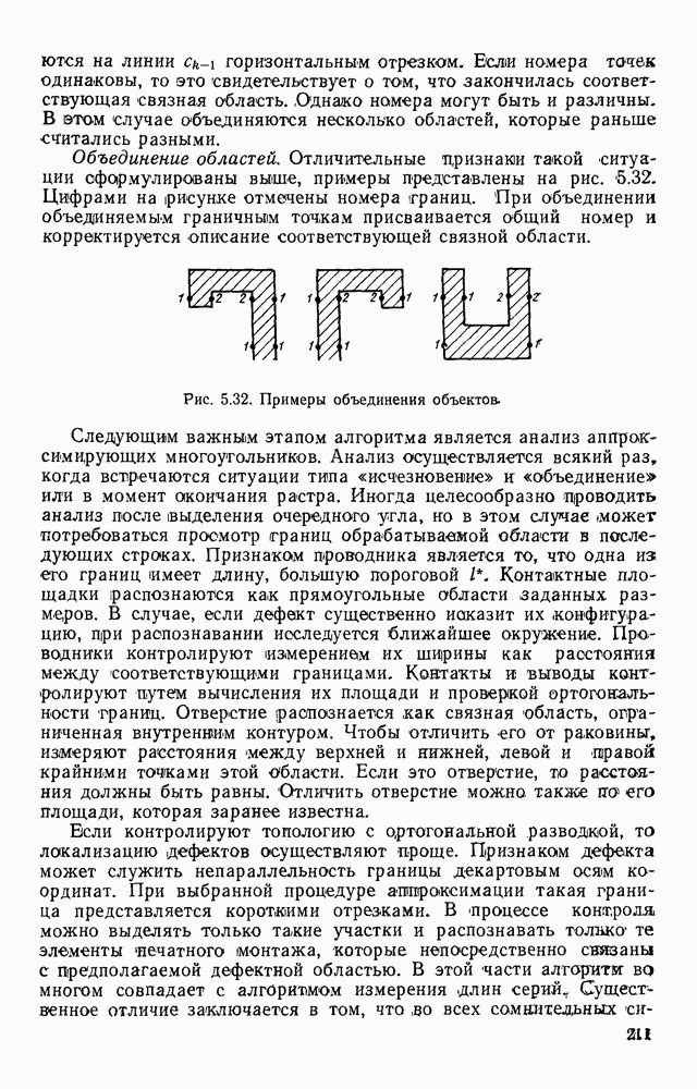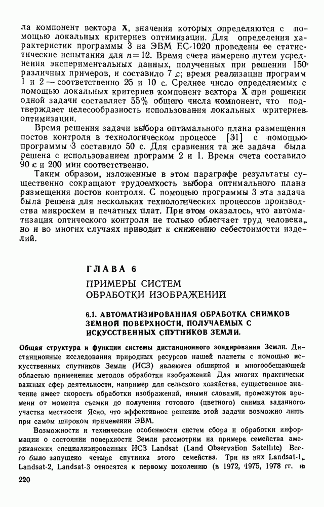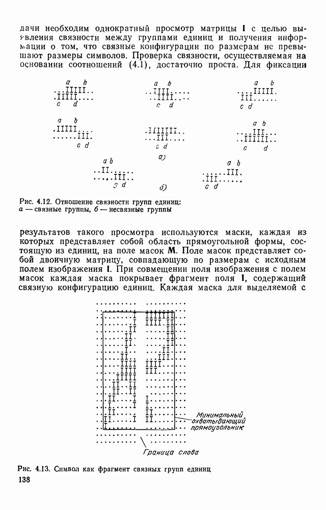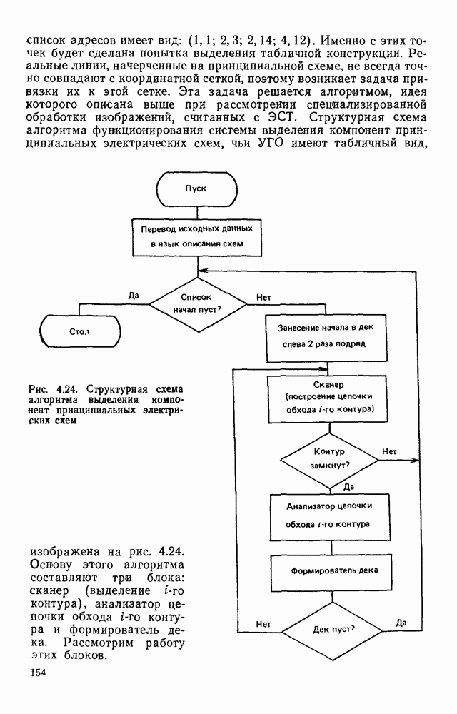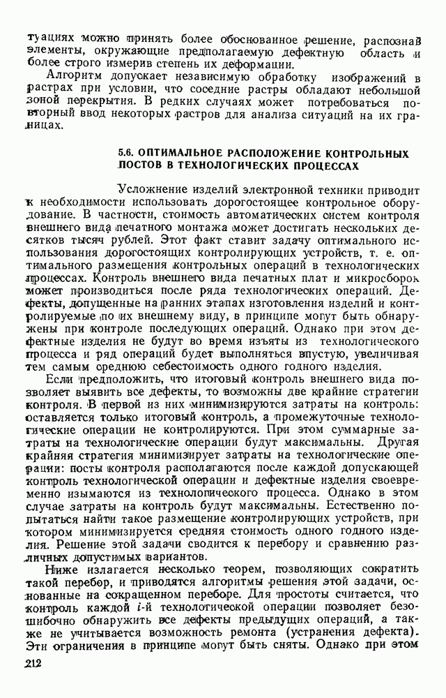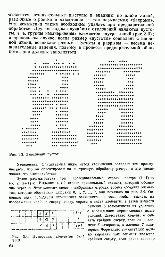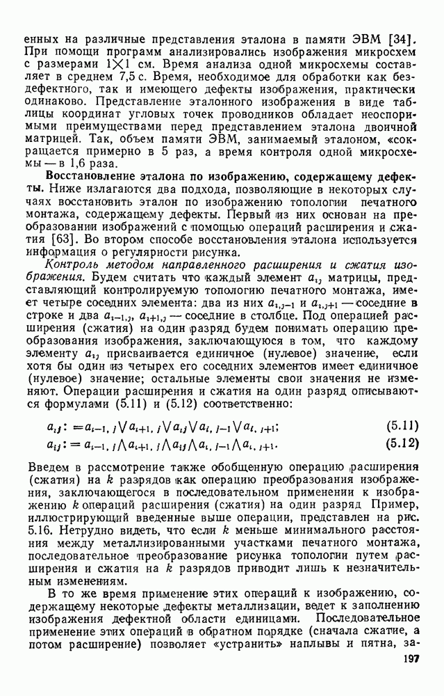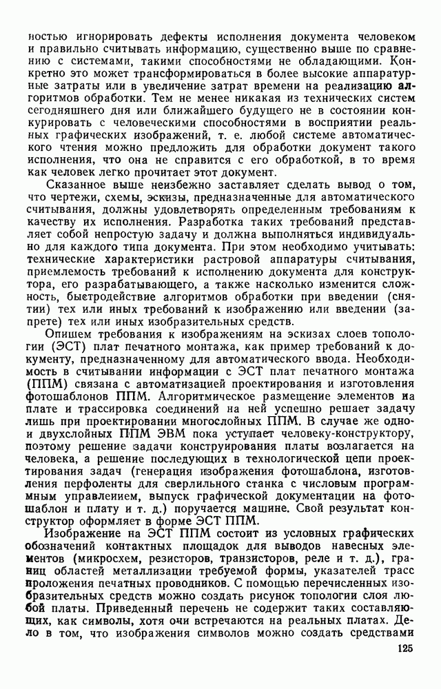 3.9. ЭКСПЕРИМЕНТАЛЬНАЯ ПРОВЕРКА РАБОТЫ СИСТЕМЫДля определения эффективности разработанного метода распознавания, достоверности и скорости распознавания разработана система программ, полностью моделирующая его работу. Процесс моделирования начинается с блока предварительной обработки, затем моделируется дискриминатор и координатор. В памяти ЭВМ (в координаторе) под действием сигналов с дискриминатора фиксируется последовательность переходов из одного состояния в другое. После очередного просмотра генерируется специальный сигнал, по которому либо выдается выходной символ, либо совершается переход на следующий просмотр. Один из этих просмотров обязательно заканчивается выдачей распознанного символа или отказом от распознавания, если в результате шумов и искажений описания различных символов совпадают или встречается неизвестный автомату символ. В последнем случае автомат либо выдает те символы, выбор между которыми он не может сделать, либо просто отказывается распознать данный символ. Вместе с выдачей, из-за отсутствия соответствующего описания в обучающей выборке выходных символов автомата система выдает трассу — последовательность входных сигналов и состояний координатора при распознавании данного символа, а также изображение символа (рис. 3.15). Возможны два режима работы системы. В первом — трасса и распознаваемый символ всегда выдаются на дисплей или АЦПУ, во втором — только в том случае, когда символ распознается неверно или один из элементов таблицы переходов или выходов не определен, что соответствует полному отказу от распознавания. Одна из ситуаций, в которой не определен элемент таблицы переходов, представлена на рис. 3.16. Разделенная точкой с запятой пара цифр обозначает соответственно входной символ и состояние, в которое переходит автомат под его воздействием; символом Д обозначен входной сигнал «длинное пересечение», а символом 8 — сигнал окончания просмотра. Ситуации, представленные на рис. 3.17 и 3.18, соответствуют случаям, когда не определены элементы таблиц переходов — выходов. (см. скан) Рис. 3.15. Пример работы системы: а — трасса; б — распознаваемое изображение (см. скан) Рис. 3.16 Отказ от распознавания: а — трасса; б — распознаваемое изображение (см. скан) Рис. 3.17. Отказ от распознавания: а — трасса; б — распознаваемое изображение (см. скан) Рис. 3.18. Отказ от распознавания: а - трасса; б — распознаваемое изображение (см. скан) Рис. 3.19. Распознавание букв 3 и Э, не различимых при вертикальном просмотре: а — трасса; б — символ (см. скан) Рис. 3.20. Распознавание букв Р и Ч, не различимых при вертикальном просмотре. а — трасса; б — символ (см. скан) Рис. 3.21. Пример распознавания существенно искаженного символа (см. скан) Рис. 3.22. Процесс распознавании буквы Н при отсутствии пробела а — трасса; б — символ (см. скан) Рис. 3.23. Процесс распознавания буквы Ч при отсутствии пробела; а — трасса; б — симрол (см. скан) Рис. 3.24. Распознавание значительно искаженного символа. а — трасса, б — символ Результаты вертикального просмотра (рис. 3.19 и 3 20) иллюстрируют ход процесса моделирования. Из них следует, что буквы З, Э и Р, Ч при вертикальном просмотре не различимы На рис. 3.21-3.24 приведены примеры, показывающие, что программа распознает символы, значительно отличающиеся от эталонных. Для более глубокого изучения возможностей мет