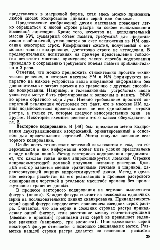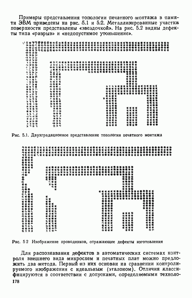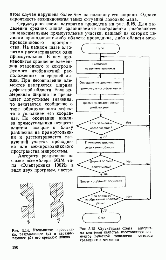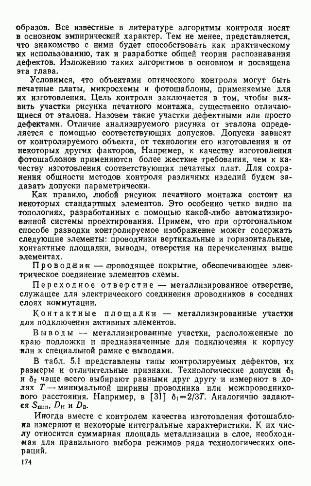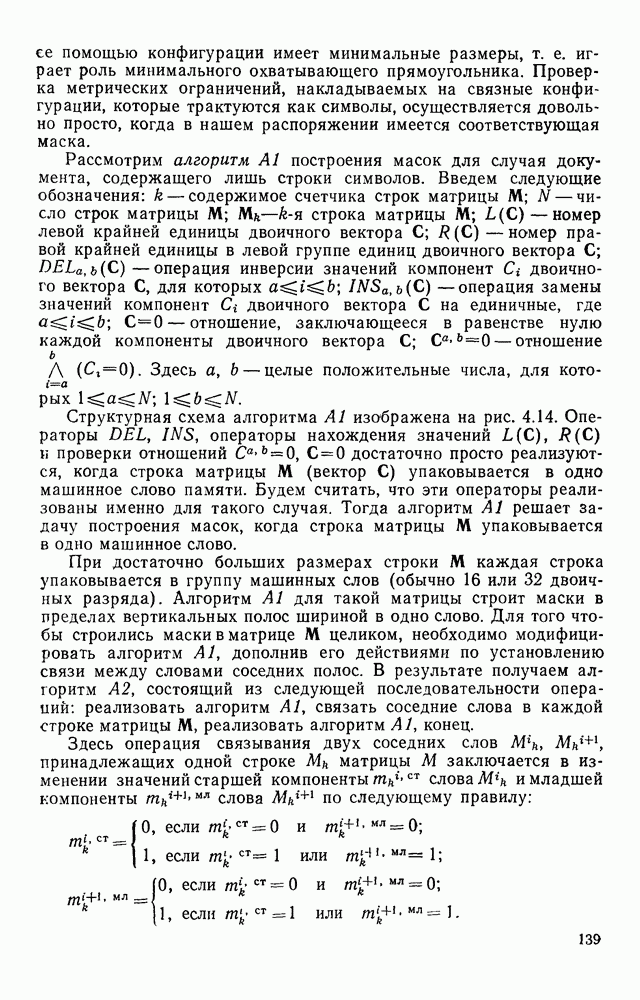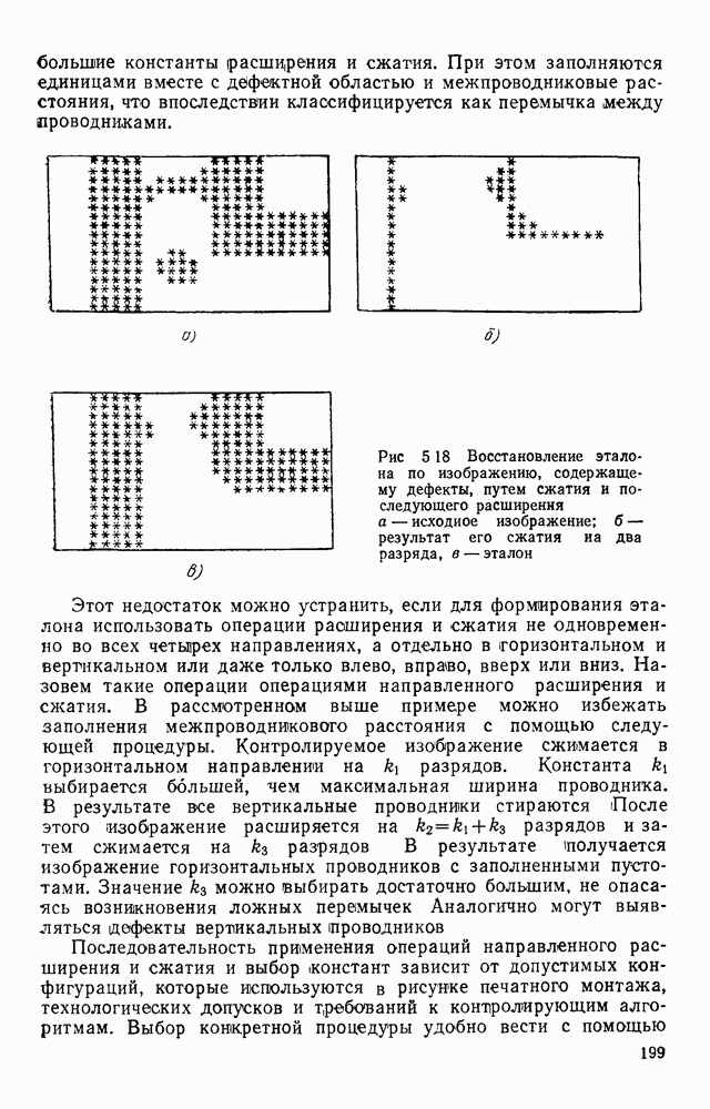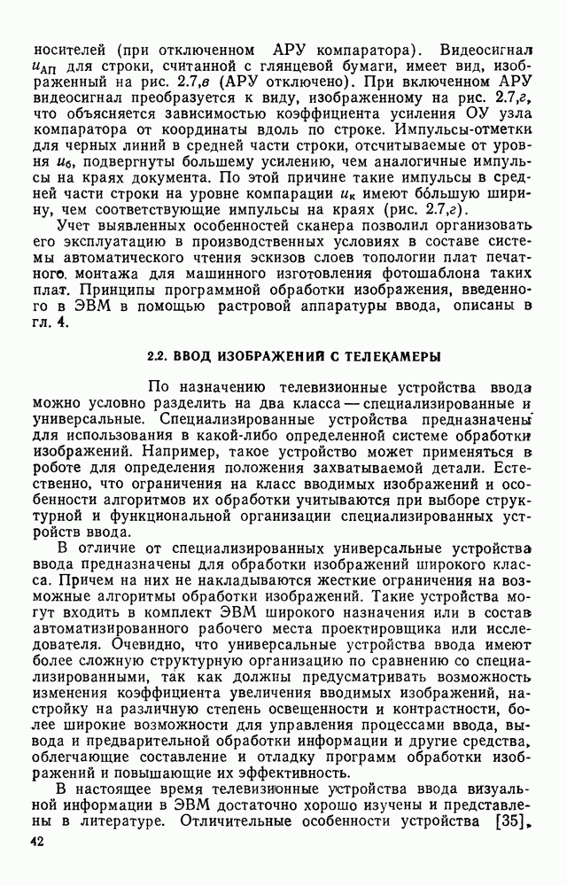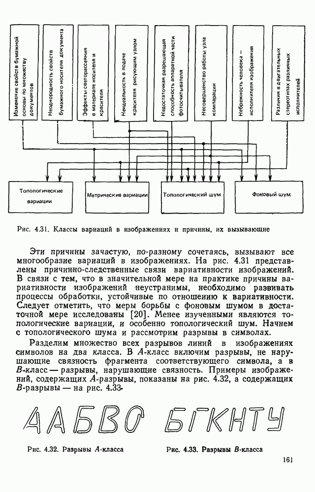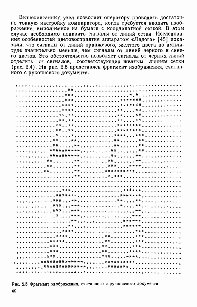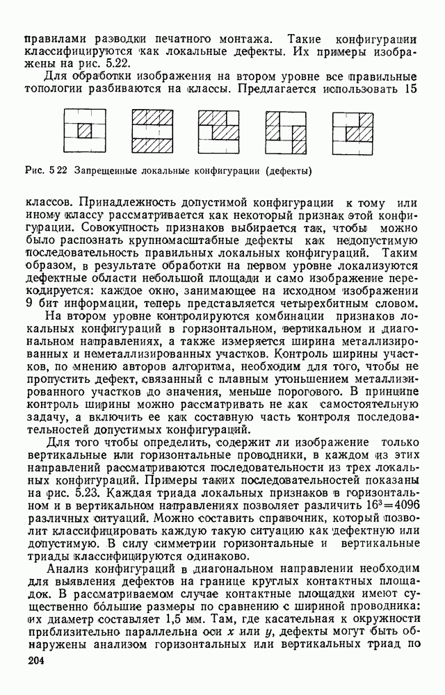 3.9. ЭКСПЕРИМЕНТАЛЬНАЯ ПРОВЕРКА РАБОТЫ СИСТЕМЫДля определения эффективности разработанного метода распознавания, достоверности и скорости распознавания разработана система программ, полностью моделирующая его работу. Процесс моделирования начинается с блока предварительной обработки, затем моделируется дискриминатор и координатор. В памяти ЭВМ (в координаторе) под действием сигналов с дискриминатора фиксируется последовательность переходов из одного состояния в другое. После очередного просмотра генерируется специальный сигнал, по которому либо выдается выходной символ, либо совершается переход на следующий просмотр. Один из этих просмотров обязательно заканчивается выдачей распознанного символа или отказом от распознавания, если в результате шумов и искажений описания различных символов совпадают или встречается неизвестный автомату символ. В последнем случае автомат либо выдает те символы, выбор между которыми он не может сделать, либо просто отказывается распознать данный символ. Вместе с выдачей, из-за отсутствия соответствующего описания в обучающей выборке выходных символов автомата система выдает трассу — последовательность входных сигналов и состояний координатора при распознавании данного символа, а также изображение символа (рис. 3.15). Возможны два режима работы системы. В первом — трасса и распознаваемый символ всегда выдаются на дисплей или АЦПУ, во втором — только в том случае, когда символ распознается неверно или один из элементов таблицы переходов или выходов не определен, что соответствует полному отказу от распознавания. Одна из ситуаций, в которой не определен элемент таблицы переходов, представлена на рис. 3.16. Разделенная точкой с запятой пара цифр обозначает соответственно входной символ и состояние, в которое переходит автомат под его воздействием; символом Д обозначен входной сигнал «длинное пересечение», а символом 8 — сигнал окончания просмотра. Ситуации, представленные на рис. 3.17 и 3.18, соответствуют случаям, когда не определены элементы таблиц переходов — выходов. (см. скан) Рис. 3.15. Пример работы системы: а — трасса; б — распознаваемое изображение (см. скан) Рис. 3.16 Отказ от распознавания: а — трасса; б — распознаваемое изображение (см. скан) Рис. 3.17. Отказ от распознавания: а — трасса; б — распознаваемое изображение (см. скан) Рис. 3.18. Отказ от распознавания: а - трасса; б — распознаваемое изображение (см. скан) Рис. 3.19. Распознавание букв 3 и Э, не различимых при вертикальном просмотре: а — трасса; б — символ (см. скан) Рис. 3.20. Распознавание букв Р и Ч, не различимых при вертикальном просмотре. а — трасса; б — символ (см. скан) Рис. 3.21. Пример распознавания существенно искаженного символа (см. скан) Рис. 3.22. Процесс распознавании буквы Н при отсутствии пробела а — трасса; б — символ (см. скан) Рис. 3.23. Процесс распознавания буквы Ч при отсутствии пробела; а — трасса; б — симрол (см. скан) Рис. 3.24. Распознавание значительно искаженного символа. а — трасса, б — символ Результаты вертикального просмотра (рис. 3.19 и 3 20) иллюстрируют ход процесса моделирования. Из них следует, что буквы З, Э и Р, Ч при вертикальном просмотре не различимы На рис. 3.21-3.24 приведены примеры, показывающие, что программа распознает символы, значительно отличающиеся от эталонных. Для более глубокого изучения возможностей мет