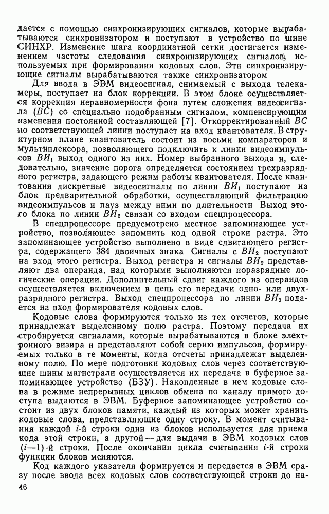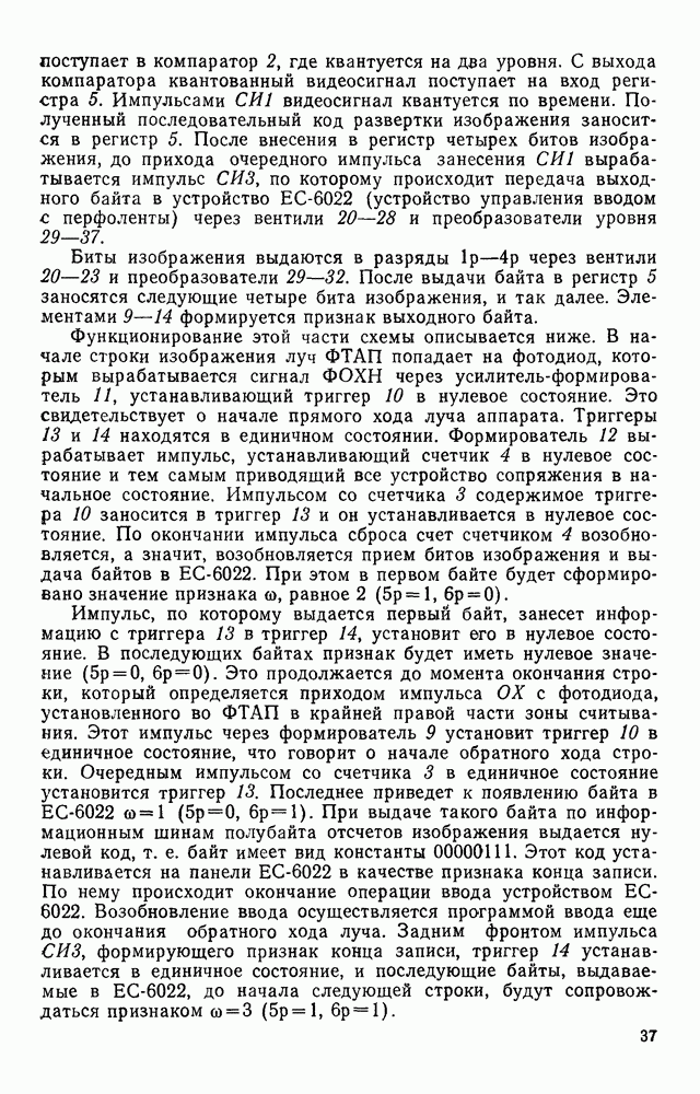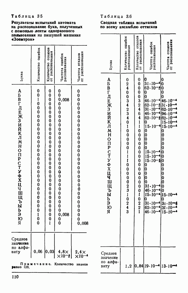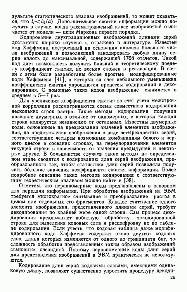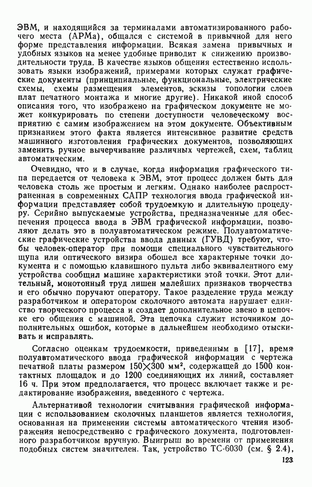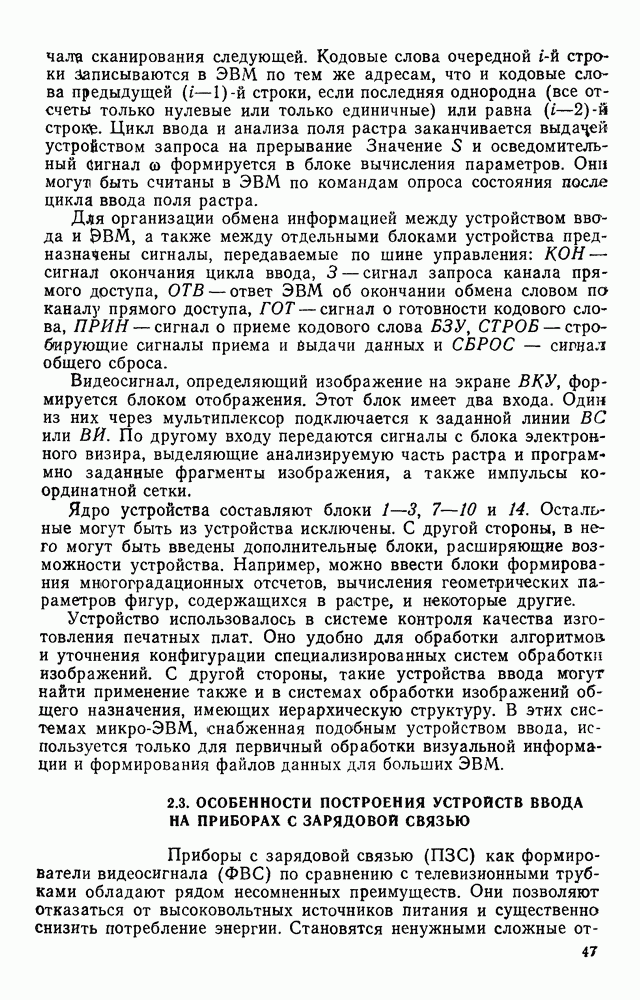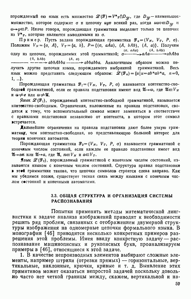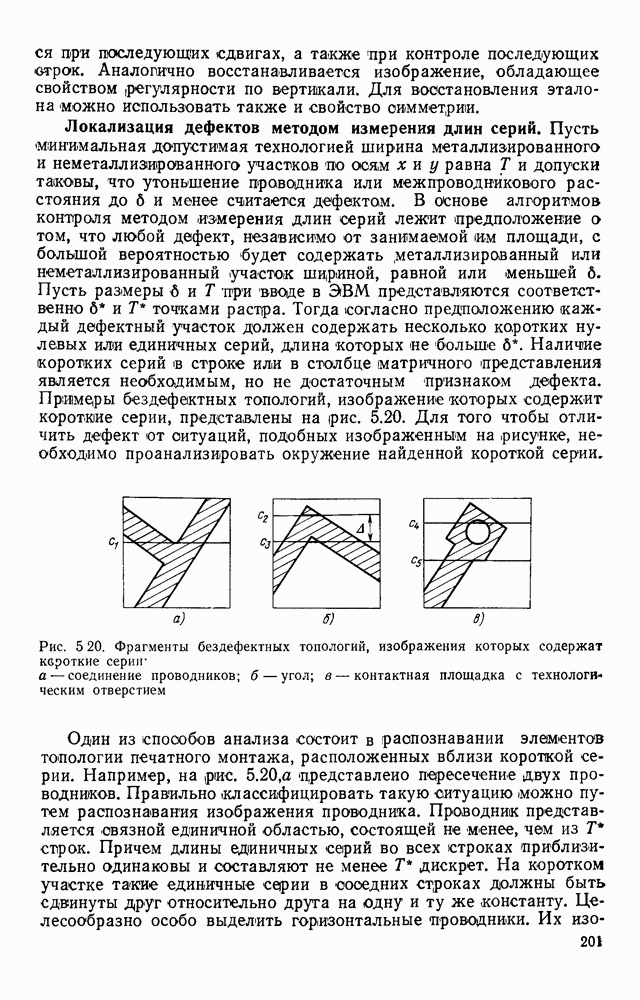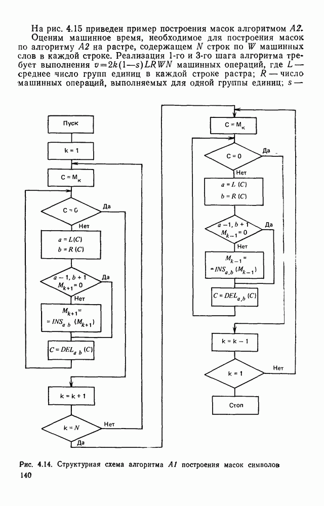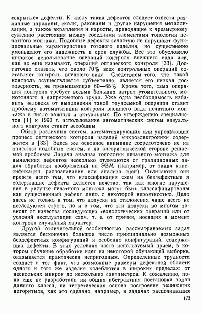 3.9. ЭКСПЕРИМЕНТАЛЬНАЯ ПРОВЕРКА РАБОТЫ СИСТЕМЫДля определения эффективности разработанного метода распознавания, достоверности и скорости распознавания разработана система программ, полностью моделирующая его работу. Процесс моделирования начинается с блока предварительной обработки, затем моделируется дискриминатор и координатор. В памяти ЭВМ (в координаторе) под действием сигналов с дискриминатора фиксируется последовательность переходов из одного состояния в другое. После очередного просмотра генерируется специальный сигнал, по которому либо выдается выходной символ, либо совершается переход на следующий просмотр. Один из этих просмотров обязательно заканчивается выдачей распознанного символа или отказом от распознавания, если в результате шумов и искажений описания различных символов совпадают или встречается неизвестный автомату символ. В последнем случае автомат либо выдает те символы, выбор между которыми он не может сделать, либо просто отказывается распознать данный символ. Вместе с выдачей, из-за отсутствия соответствующего описания в обучающей выборке выходных символов автомата система выдает трассу — последовательность входных сигналов и состояний координатора при распознавании данного символа, а также изображение символа (рис. 3.15). Возможны два режима работы системы. В первом — трасса и распознаваемый символ всегда выдаются на дисплей или АЦПУ, во втором — только в том случае, когда символ распознается неверно или один из элементов таблицы переходов или выходов не определен, что соответствует полному отказу от распознавания. Одна из ситуаций, в которой не определен элемент таблицы переходов, представлена на рис. 3.16. Разделенная точкой с запятой пара цифр обозначает соответственно входной символ и состояние, в которое переходит автомат под его воздействием; символом Д обозначен входной сигнал «длинное пересечение», а символом 8 — сигнал окончания просмотра. Ситуации, представленные на рис. 3.17 и 3.18, соответствуют случаям, когда не определены элементы таблиц переходов — выходов. (см. скан) Рис. 3.15. Пример работы системы: а — трасса; б — распознаваемое изображение (см. скан) Рис. 3.16 Отказ от распознавания: а — трасса; б — распознаваемое изображение (см. скан) Рис. 3.17. Отказ от распознавания: а — трасса; б — распознаваемое изображение (см. скан) Рис. 3.18. Отказ от распознавания: а - трасса; б — распознаваемое изображение (см. скан) Рис. 3.19. Распознавание букв 3 и Э, не различимых при вертикальном просмотре: а — трасса; б — символ (см. скан) Рис. 3.20. Распознавание букв Р и Ч, не различимых при вертикальном просмотре. а — трасса; б — символ (см. скан) Рис. 3.21. Пример распознавания существенно искаженного символа (см. скан) Рис. 3.22. Процесс распознавании буквы Н при отсутствии пробела а — трасса; б — символ (см. скан) Рис. 3.23. Процесс распознавания буквы Ч при отсутствии пробела; а — трасса; б — симрол (см. скан) Рис. 3.24. Распознавание значительно искаженного символа. а — трасса, б — символ Результаты вертикального просмотра (рис. 3.19 и 3 20) иллюстрируют ход процесса моделирования. Из них следует, что буквы З, Э и Р, Ч при вертикальном просмотре не различимы На рис. 3.21-3.24 приведены примеры, показывающие, что программа распознает символы, значительно отличающиеся от эталонных. Для более глубокого изучения возможностей мет