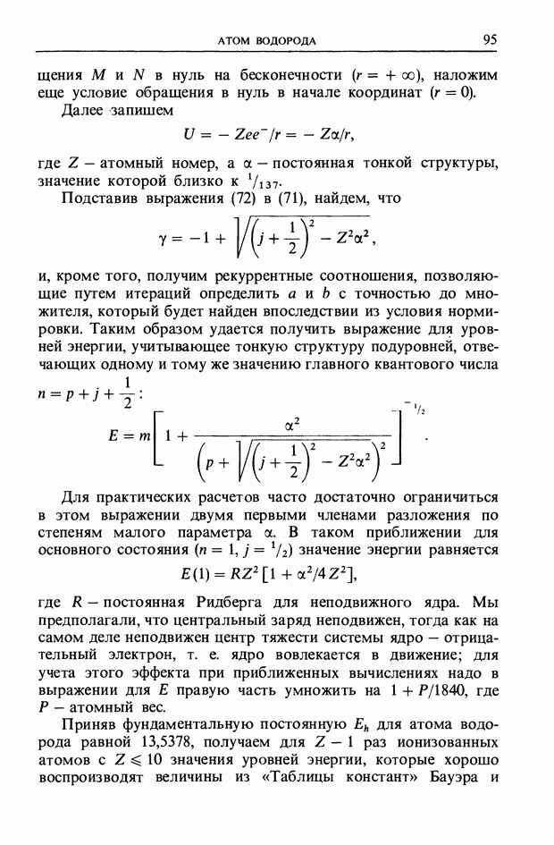 и, кроме того, получим рекуррентные соотношения, позволяющие путем итераций определить а и b с точностью до множителя, который будет найден впоследствии из условия нормировки. Таким образом удается получить выражение для уровней энергии, учитывающее тонкую структуру подуровней, отвечающих одному и тому же значению главного квантового числа 1