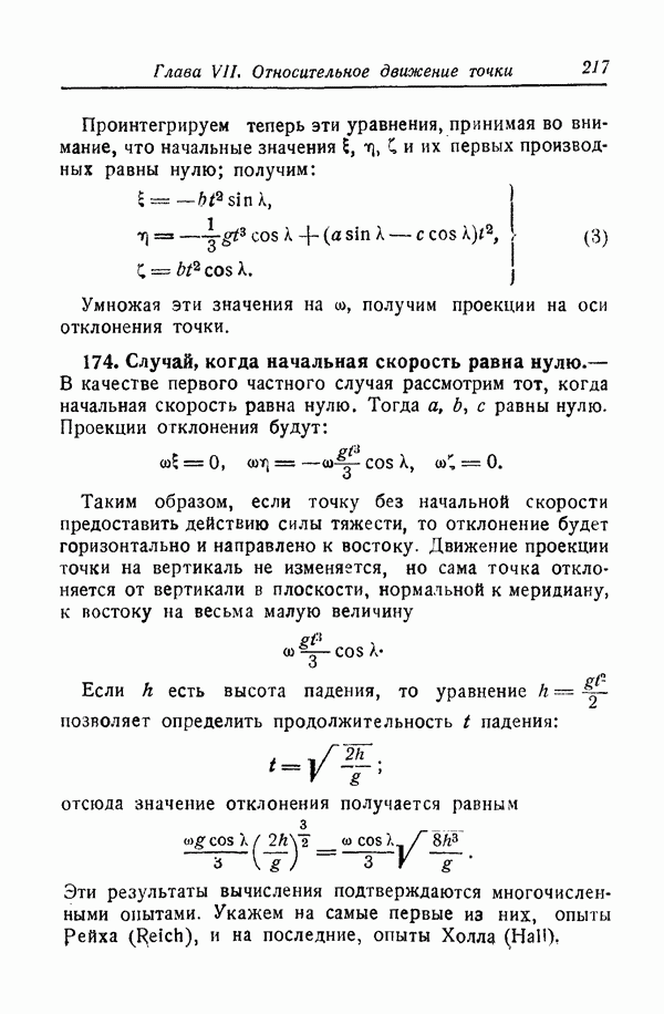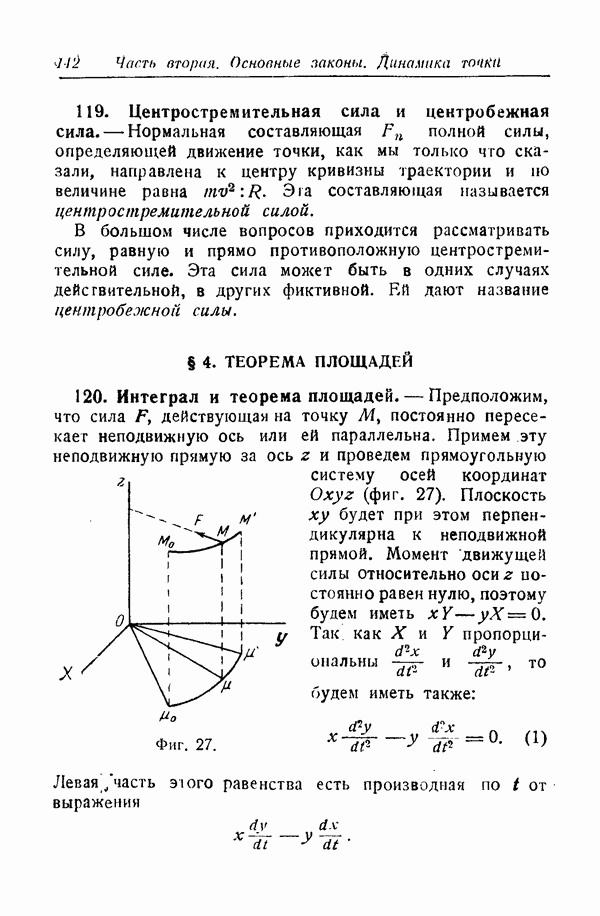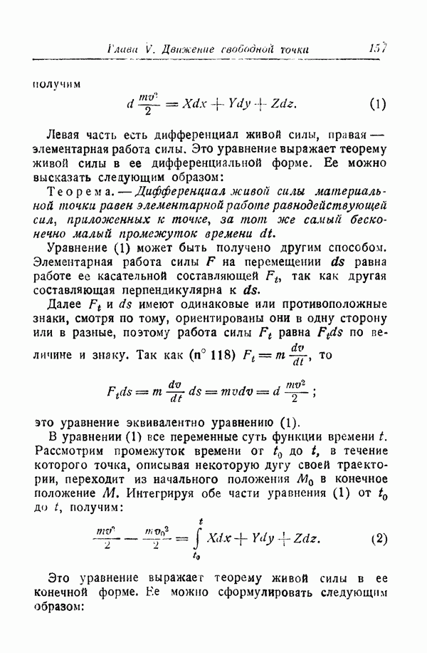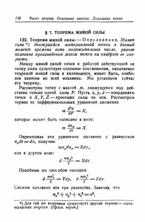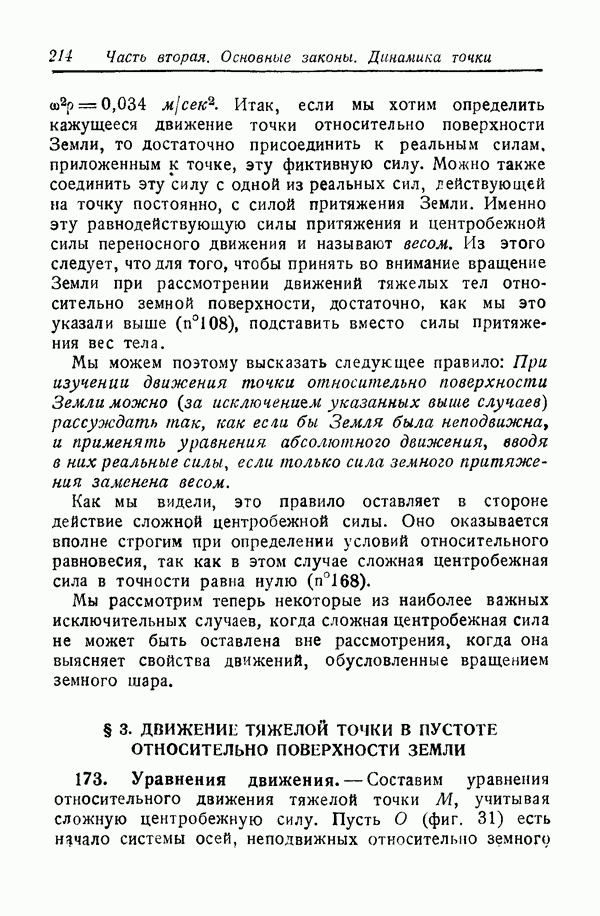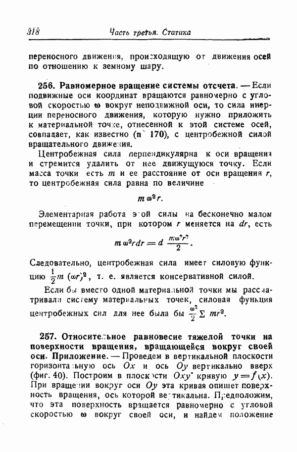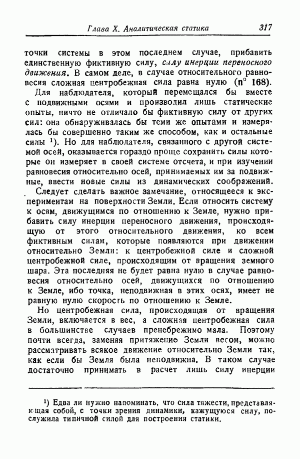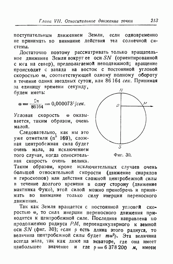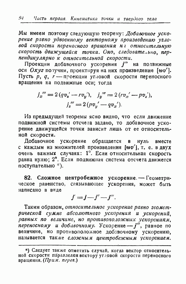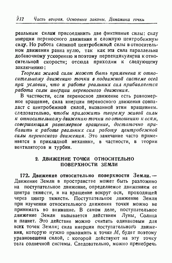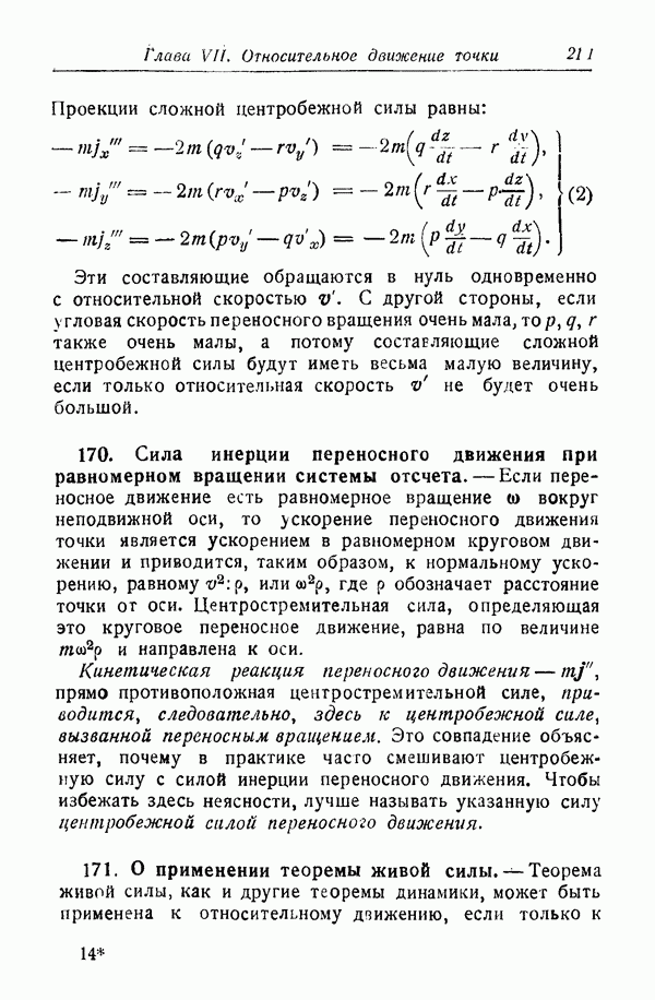 Эти составляющие обращаются в нуль одновременно с относительной скоростью 170. Сила инерции переносного движения при равномерном вращении системы отсчета.Если переносное движение есть равномерное вращение Кинетическая реакция переносного движения — 171. О применении теоремы живой силы.Теорема живой силы, как и другие теоремы динамики, может быть применена к относительному движению, если только к реальным силам присоединить две фиктивные силы: силу инерции переносного движения и сложную центробежную силу. Но работа сложной центробежной силы в относительном движении равна нулю, так как эта сила параллельна добавочному ускорению и поэтому перпендикулярна к относительной скорости; отсюда приходим к следующему заключению: Теорема живой силы может быть применена к относительному движению точки в подвижной системе осей при, условии, что к работе реальных сил прибавляется работа силы инерции переносного движения. В частности, если переносное движение есть равномерное вращение, сила инерции переносного движения совпадает с центробежной силой, вызванной этим вращением, следовательно, чтобы приложить теорему живой силы к относительному движению точки по отношению к осям, совершающим равномерное вращение, достаточно прибавить к работе реальных сил работу центробежной силы переносного движения. Это замечание часто применяется в прикладной механике, в частности, в теории вентиляторов и турбин.