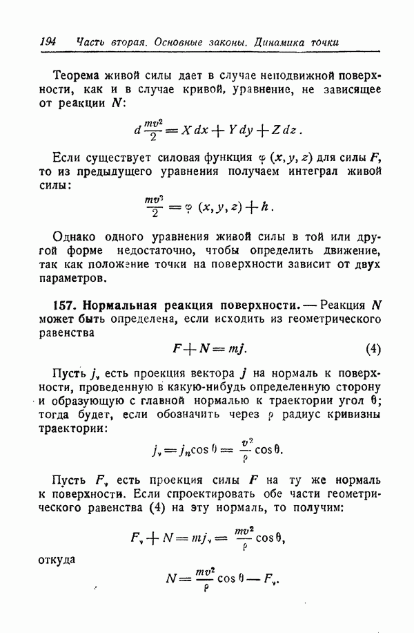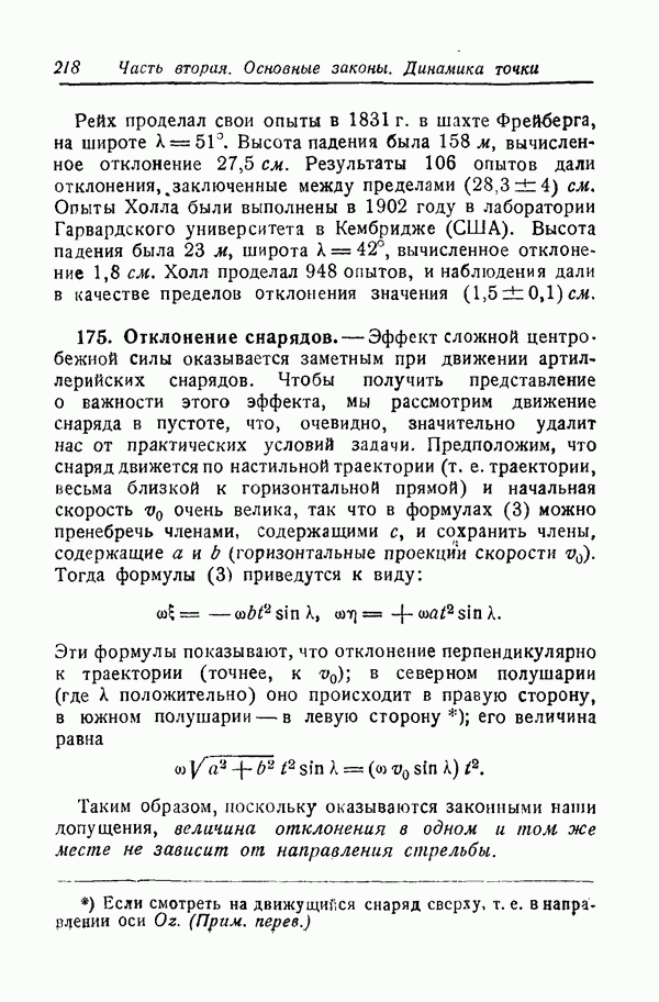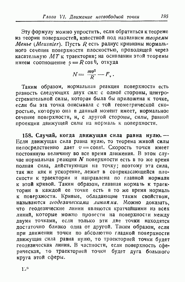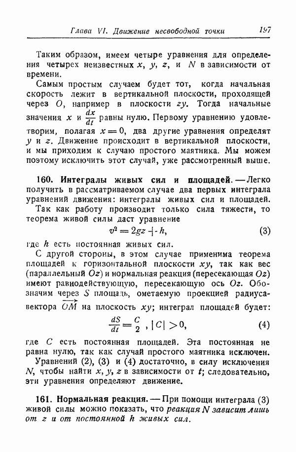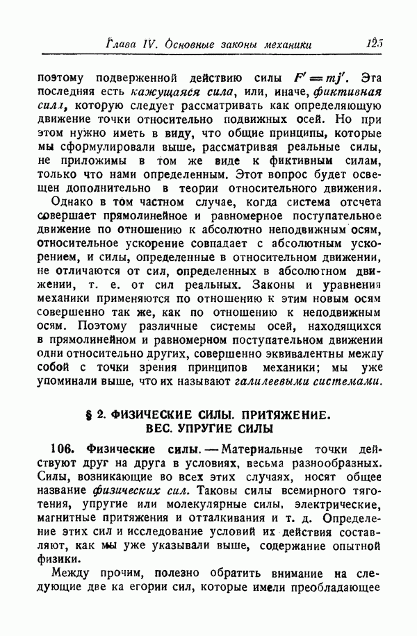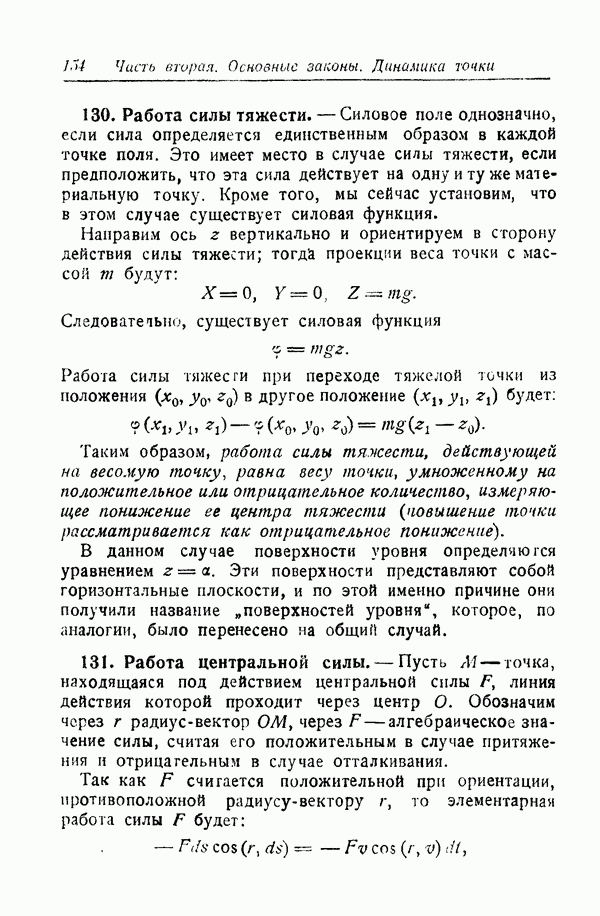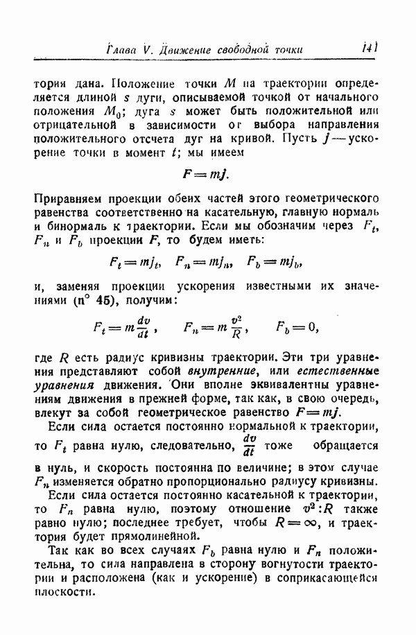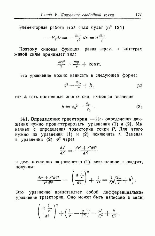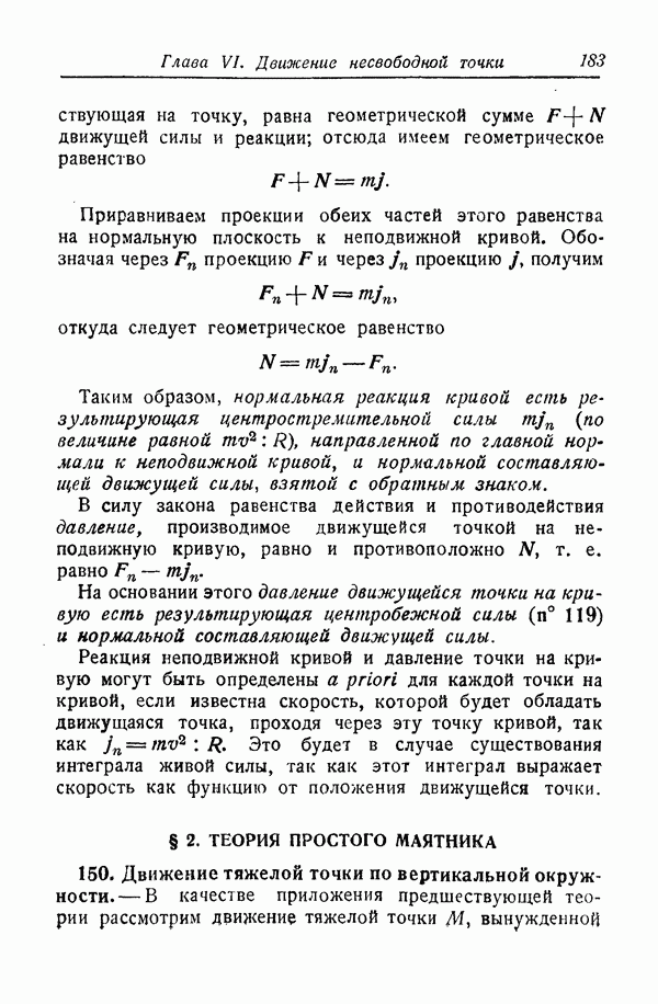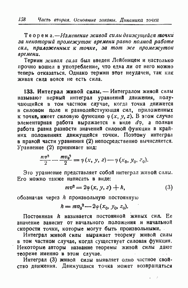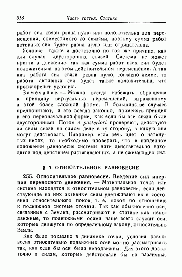Эти составляющие обращаются в нуль одновременно с относительной скоростью 170. Сила инерции переносного движения при равномерном вращении системы отсчета.Если переносное движение есть равномерное вращение Кинетическая реакция переносного движения — 171. О применении теоремы живой силы.Теорема живой силы, как и другие теоремы динамики, может быть применена к относительному движению, если только к реальным силам присоединить две фиктивные силы: силу инерции переносного движения и сложную центробежную силу. Но работа сложной центробежной силы в относительном движении равна нулю, так как эта сила параллельна добавочному ускорению и поэтому перпендикулярна к относительной скорости; отсюда приходим к следующему заключению: Теорема живой силы может быть применена к относительному движению точки в подвижной системе осей при, условии, что к работе реальных сил прибавляется работа силы инерции переносного движения. В частности, если переносное движение есть равномерное вращение, сила инерции переносного движения совпадает с центробежной силой, вызванной этим вращением, следовательно, чтобы приложить теорему живой силы к относительному движению точки по отношению к осям, совершающим равномерное вращение, достаточно прибавить к работе реальных сил работу центробежной силы переносного движения. Это замечание часто применяется в прикладной механике, в частности, в теории вентиляторов и турбин.