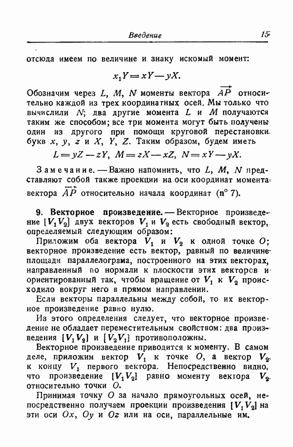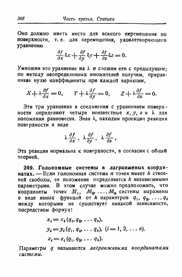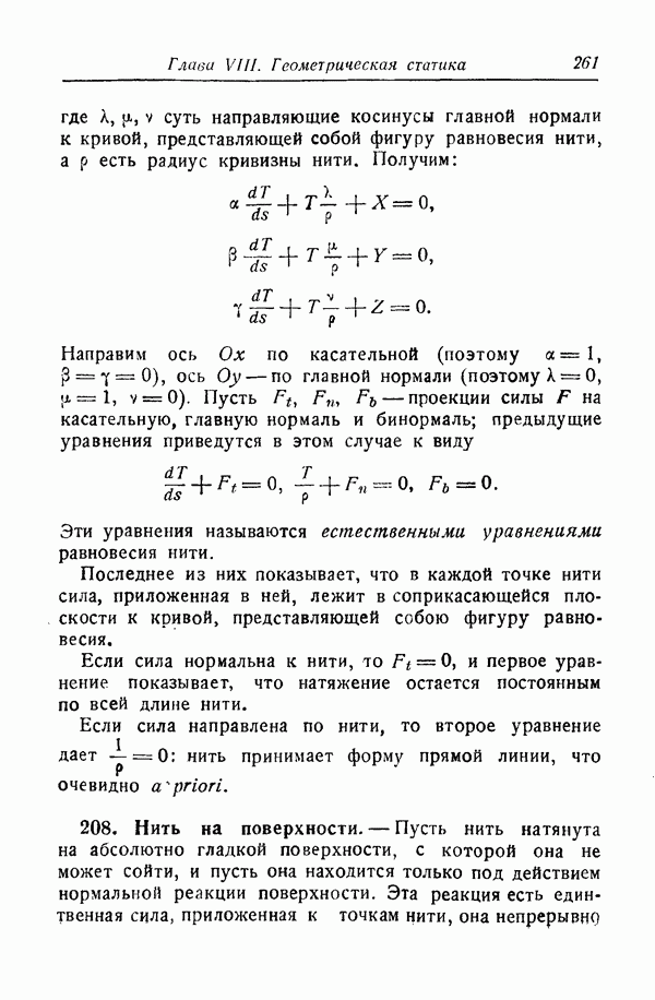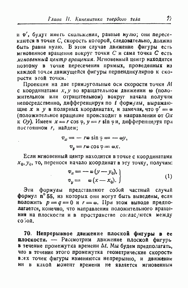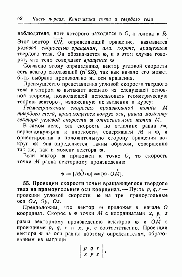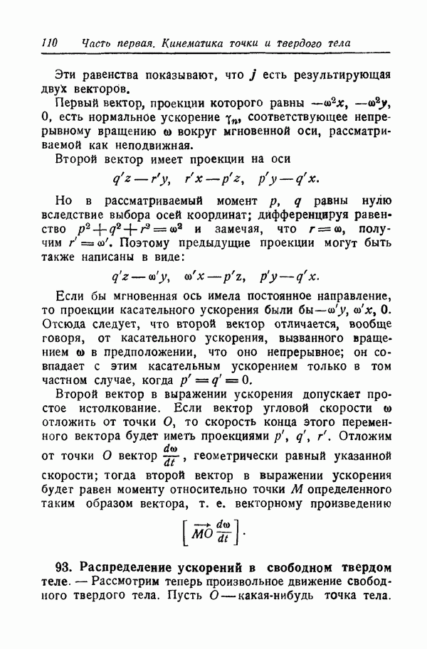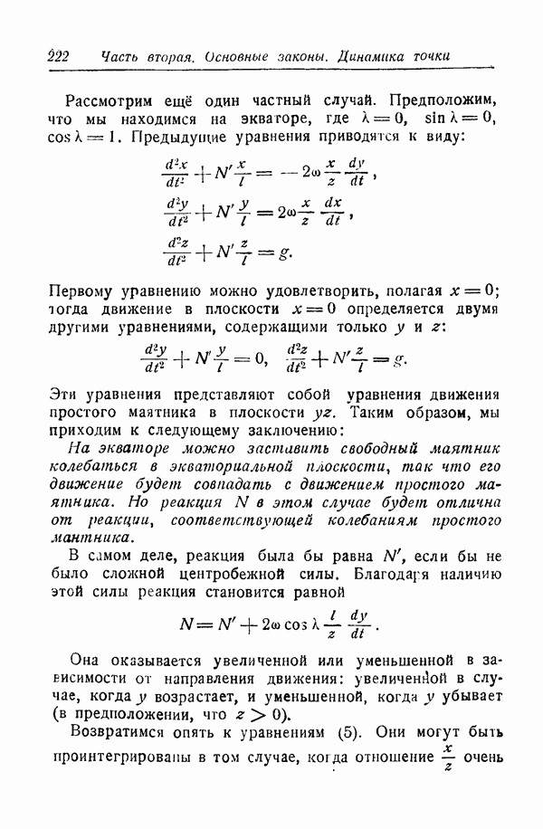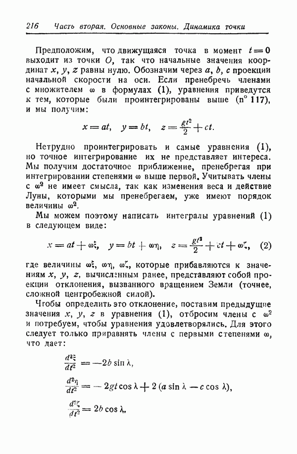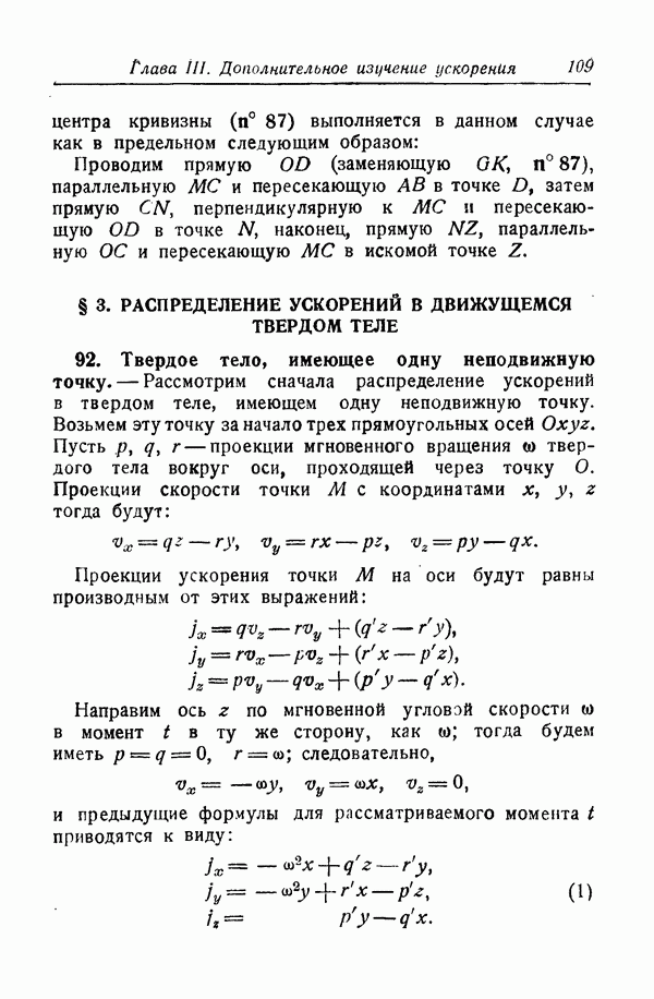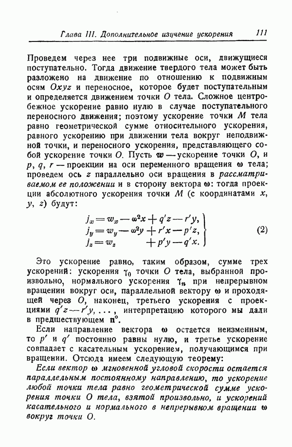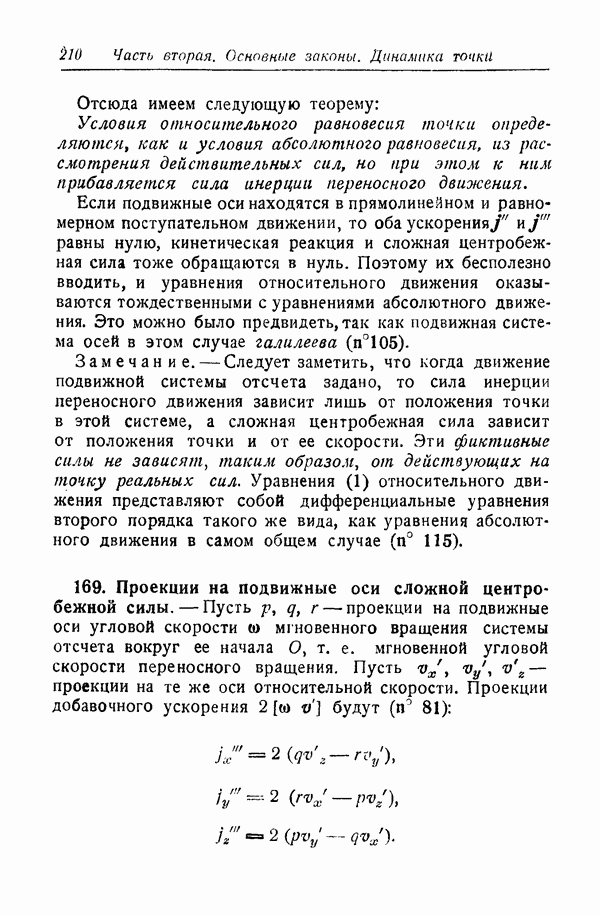 Эти уравнения представляют собой уравнения относительного движения точки М. В кинематике (п° 80 и 81) мы дали способ определения проекций векторов Фиктивную силу, равную Фиктивную силу, равную — Уравнения (1) выражают, таким образом, следующую теорему: Относительное движение точки по отношению к Добавочное ускорение, как известно (п° 81), исчезает, если относительная скорость равна нулю (т. е. если точка находится в относительном покое). То же самое имеет место и Для сложной центробежной силы. Отсюда имеем следующую теорему: Условия относительного равновесия точки определяются, как и условия абсолютного равновесия, из рассмотрения действительных сил, но при этом к ним прибавляется сила инерции переносного движения. Если подвижные оси находятся в прямолинейном и равномерном поступательном движении, то оба ускорения Замечание. — Следует заметить, что когда движение подвижной системы отсчета задано, то сила инерции переносного движения зависит лишь от положения точки в этой системе, а сложная центробежная сила зависит от положения точки и от ее скорости. Эти фиктивные силы не зависят, таким образом, от действующих на точку реальных сил. Уравнения (1) относительного движения представляют собой дифференциальные уравнения второго порядка такого же вида, как уравнения абсолютного движения в самом общем случае (п° 115). 169. Проекции на подвижные оси сложной центробежной силы.Пусть