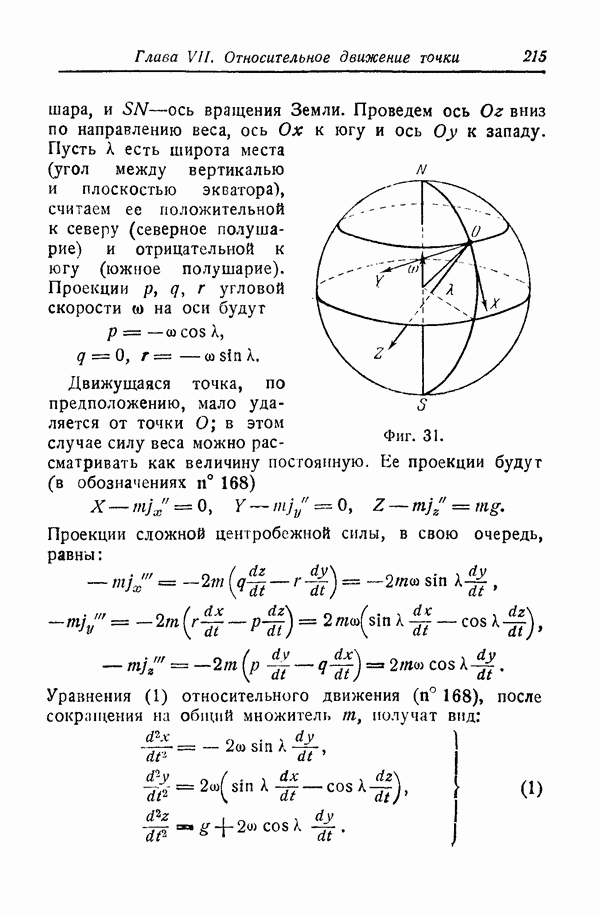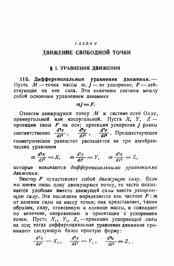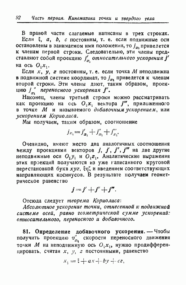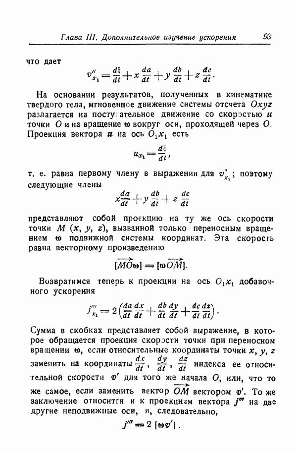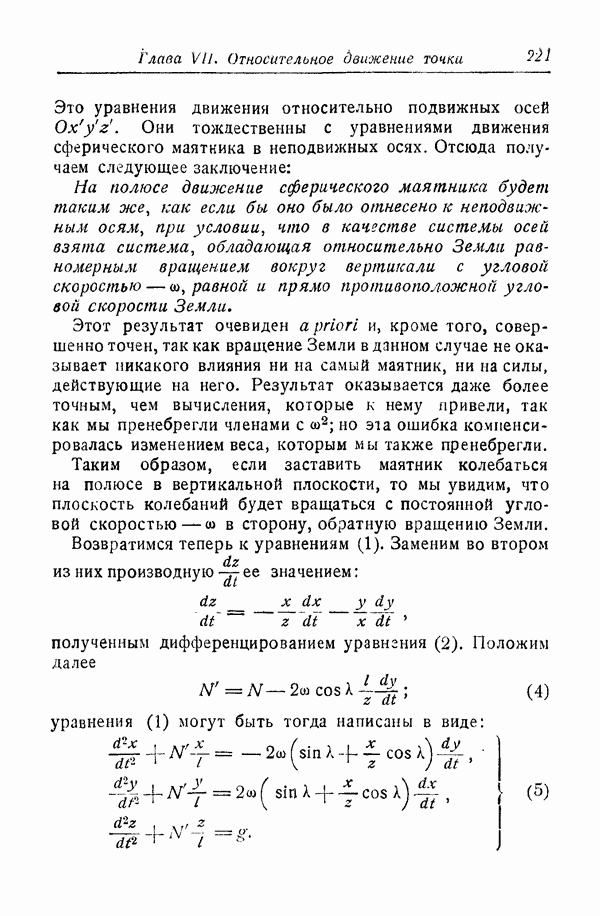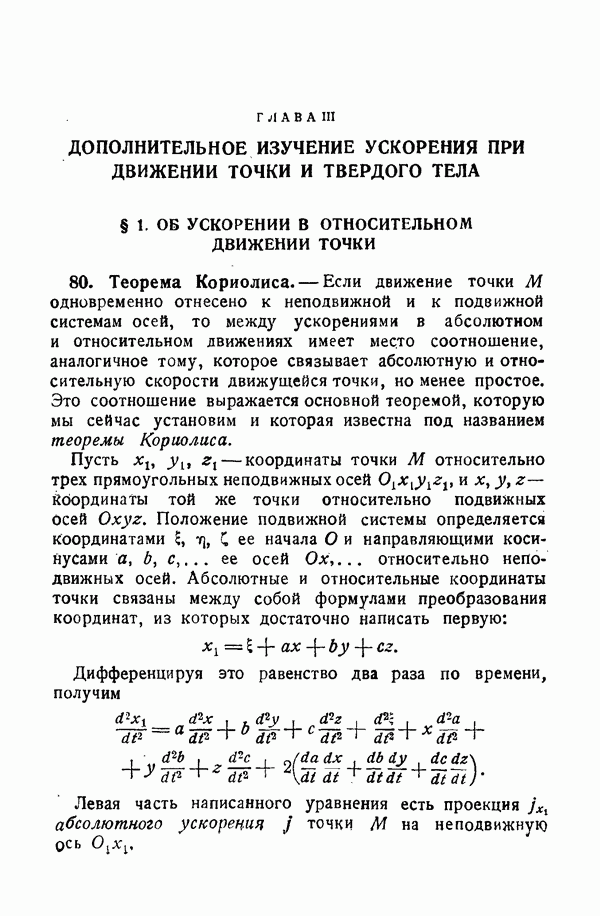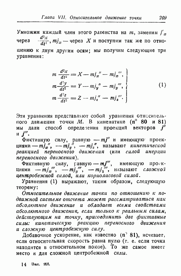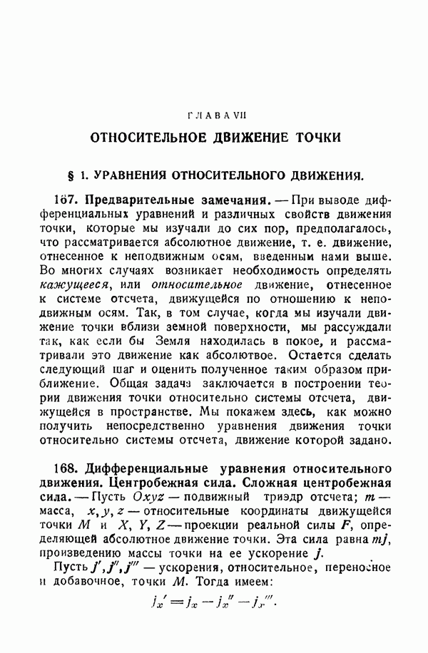 ГЛАВА VII. ОТНОСИТЕЛЬНОЕ ДВИЖЕНИЕ ТОЧКИ§ 1. УРАВНЕНИЯ ОТНОСИТЕЛЬНОГО ДВИЖЕНИЯ.167. Предварительные замечания.При выводе дифференциальных уравнений и различных свойств движения точки, которые мы изучали до сих пор, предполагалось, что рассматривается абсолютное движение, т. е. движение, отнесенное к неподвижным осям, введенным нами выше. Во многих случаях возникает необходимость определять кажущееся, или относительное движение, отнесенное к системе отсчета, движущейся по отношению к неподвижным осям. Так, в том случае, когда мы изучали движение точки вблизи земной поверхности, мы рассуждали так, как если бы Земля находилась в покое, и рассматривали это движение как абсолютвое. Остается сделать следующий шаг и оценить полученное таким образом приближение. Общая задача заключается в построении теории движения точки относительно системы отсчета, движущейся в пространстве. Мы покажем здесь, как можно получить непосредственно уравнения движения точки относительно системы отсчета, движение которой задано. 168. Дифференциальные уравнения относительного движения. Центробежная сила. Сложная центробежная сила.Пусть Пусть