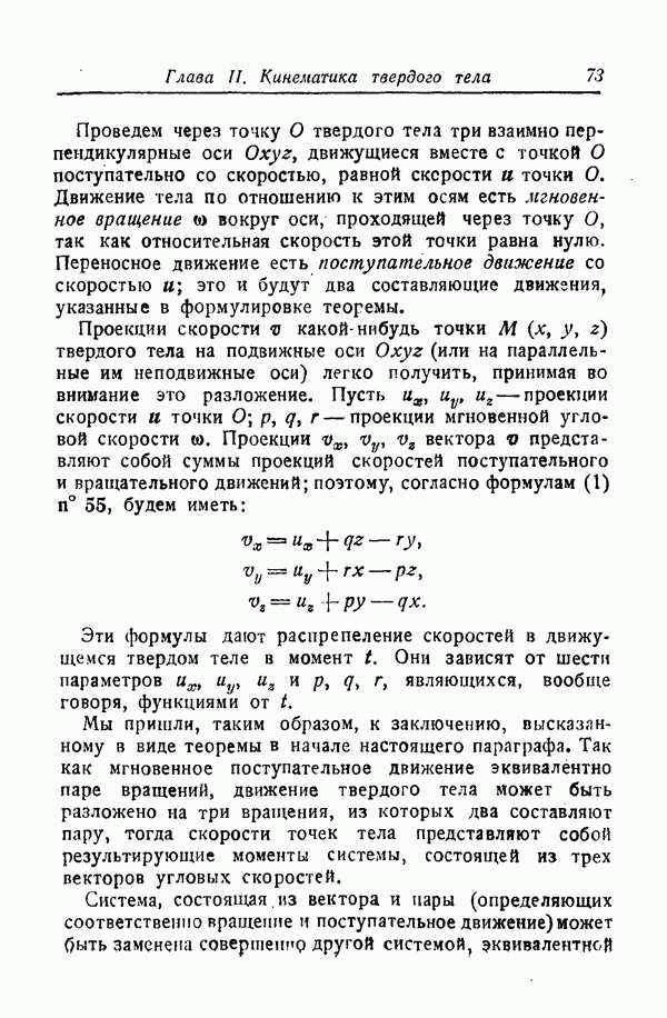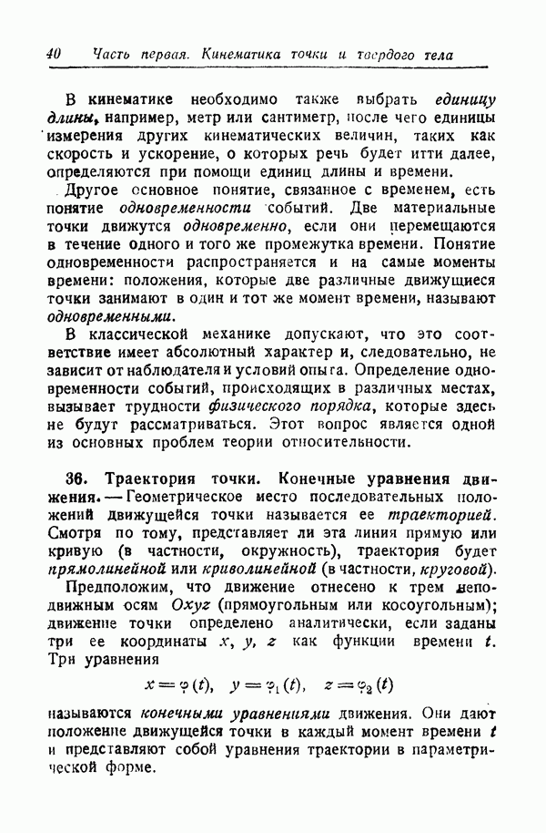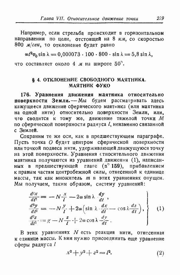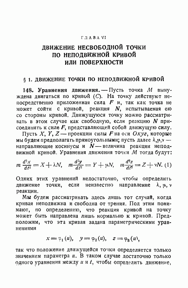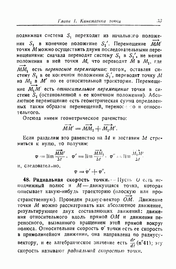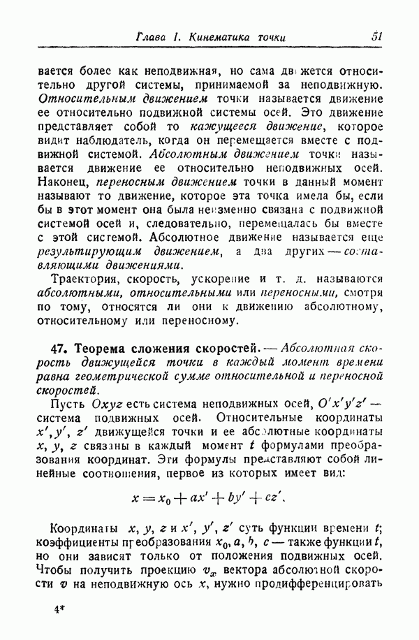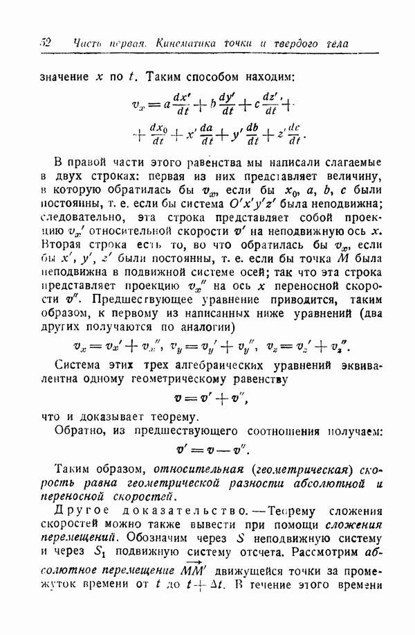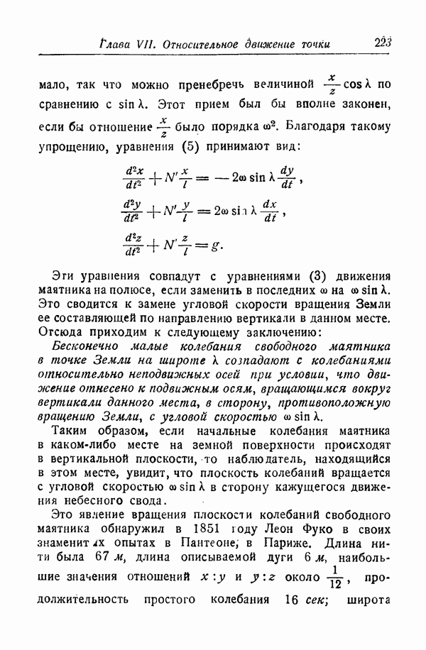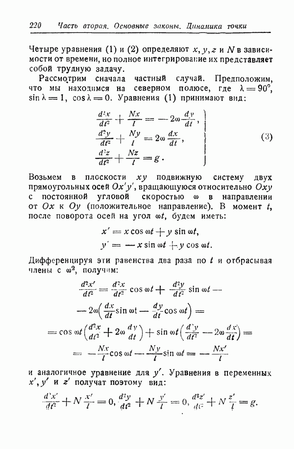 ГЛАВА VII. ОТНОСИТЕЛЬНОЕ ДВИЖЕНИЕ ТОЧКИ§ 1. УРАВНЕНИЯ ОТНОСИТЕЛЬНОГО ДВИЖЕНИЯ.167. Предварительные замечания.При выводе дифференциальных уравнений и различных свойств движения точки, которые мы изучали до сих пор, предполагалось, что рассматривается абсолютное движение, т. е. движение, отнесенное к неподвижным осям, введенным нами выше. Во многих случаях возникает необходимость определять кажущееся, или относительное движение, отнесенное к системе отсчета, движущейся по отношению к неподвижным осям. Так, в том случае, когда мы изучали движение точки вблизи земной поверхности, мы рассуждали так, как если бы Земля находилась в покое, и рассматривали это движение как абсолютвое. Остается сделать следующий шаг и оценить полученное таким образом приближение. Общая задача заключается в построении теории движения точки относительно системы отсчета, движущейся в пространстве. Мы покажем здесь, как можно получить непосредственно уравнения движения точки относительно системы отсчета, движение которой задано. 168. Дифференциальные уравнения относительного движения. Центробежная сила. Сложная центробежная сила.Пусть Пусть